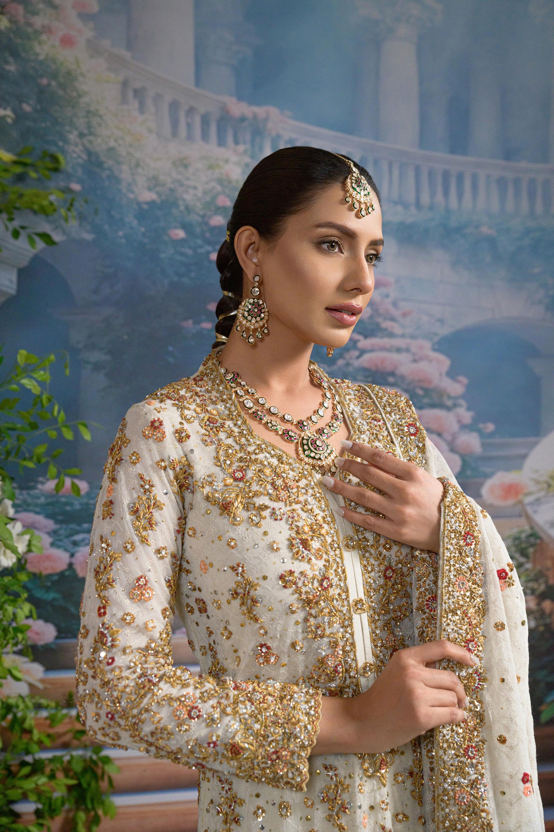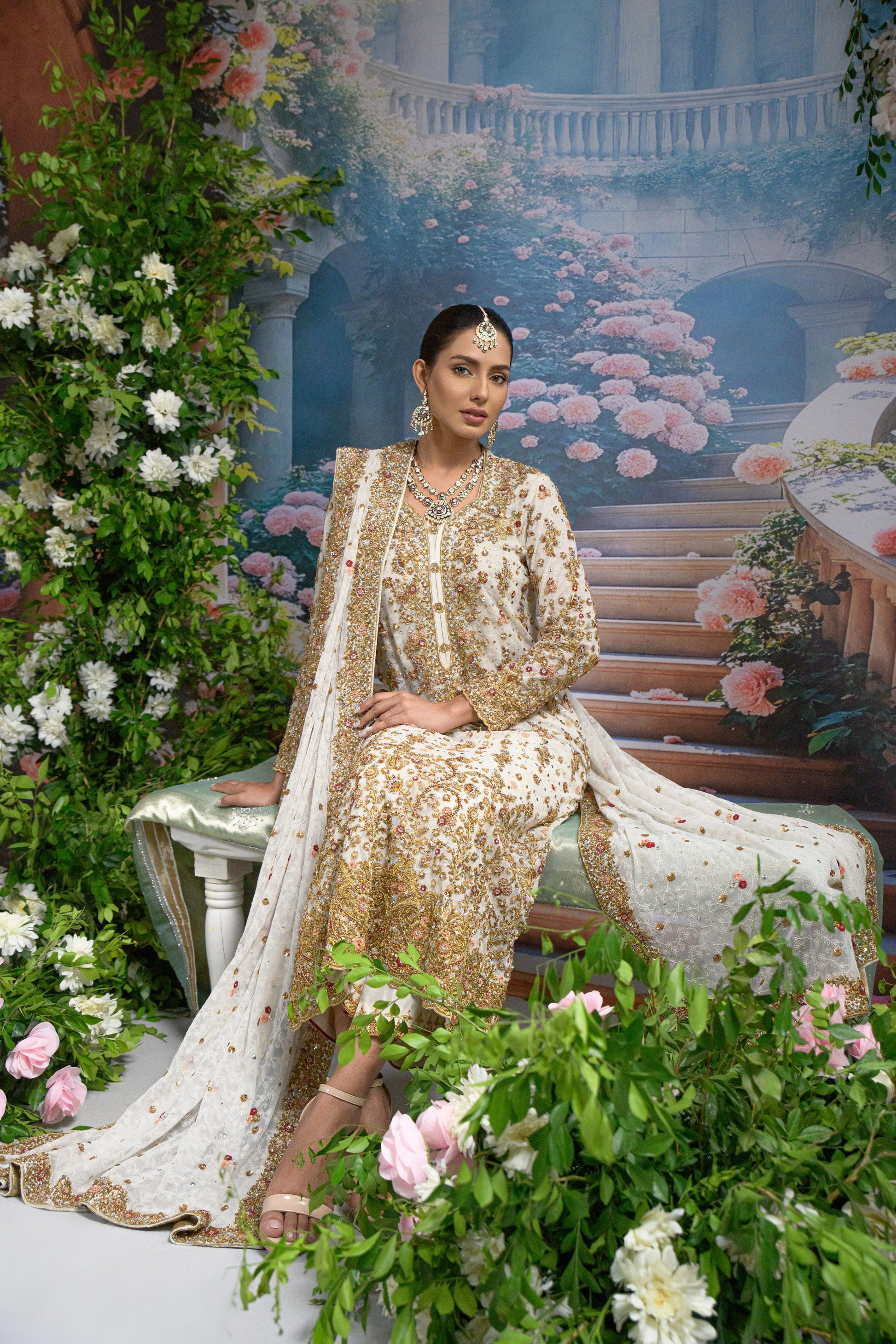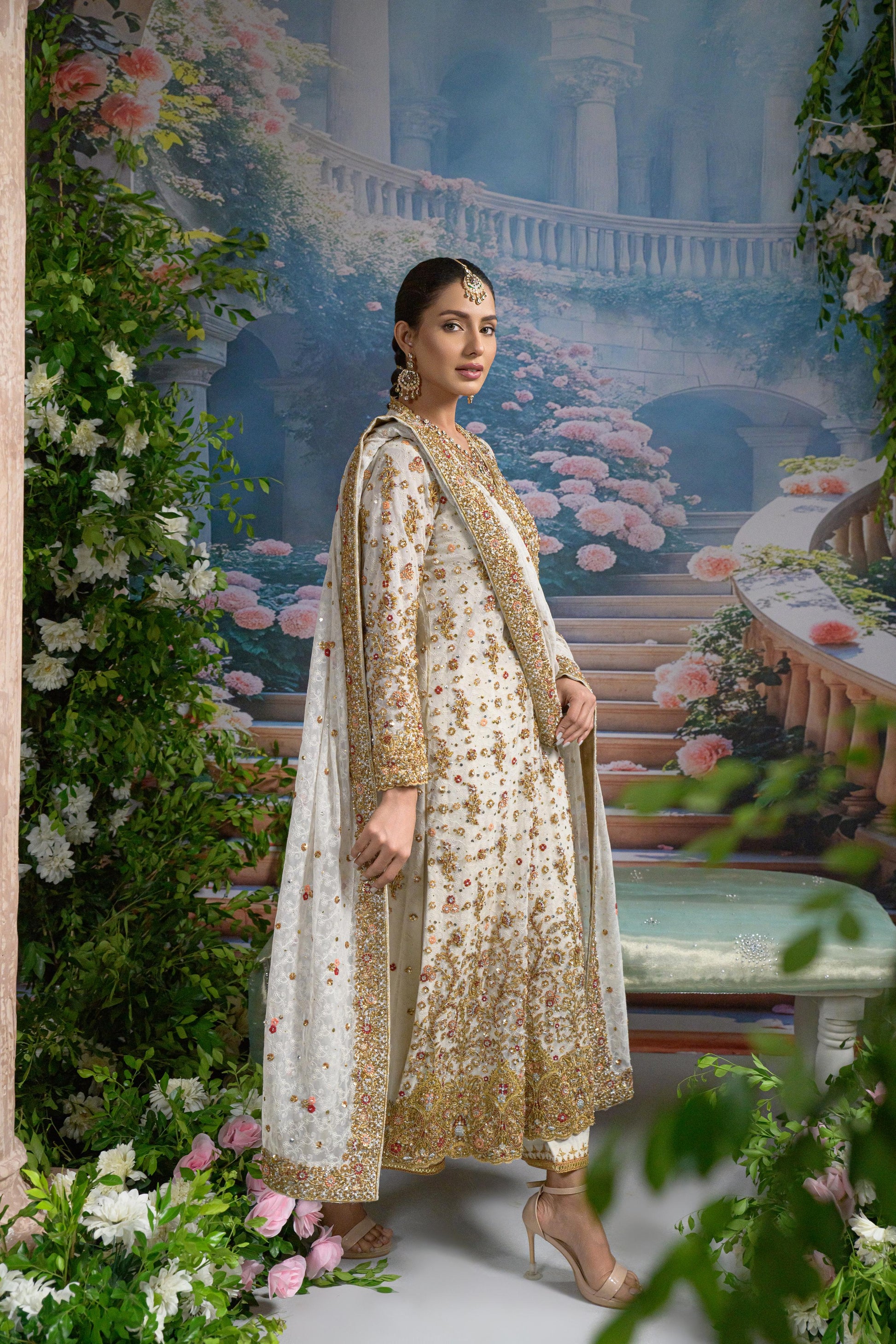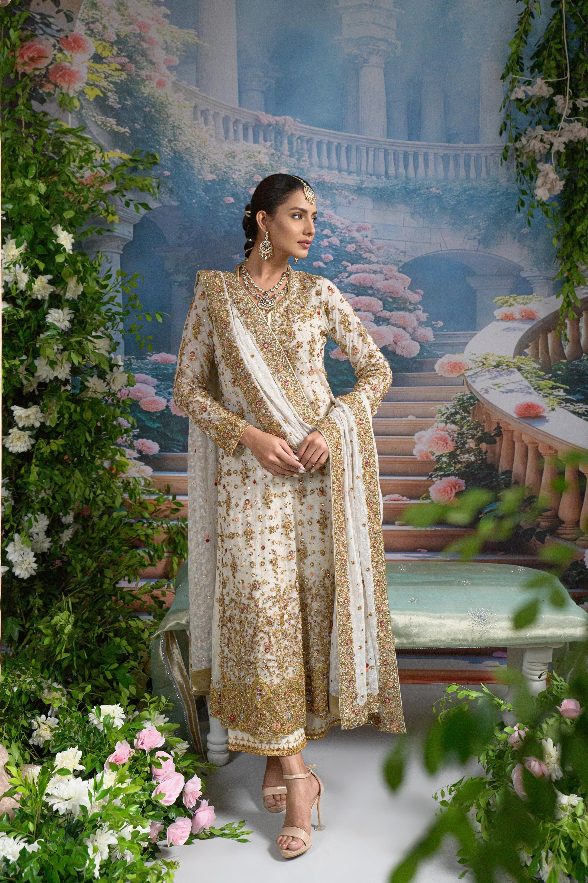 Paired with an intricately embellished net dupatta, scattered with pearls and floral appliqué, and bordered with luxurious handwork, this look balances opulence with softness. The izaar peeks subtly underneath, flaring out in waves of ivory and gold , making it ideal for ceremonial entrances and evening light.