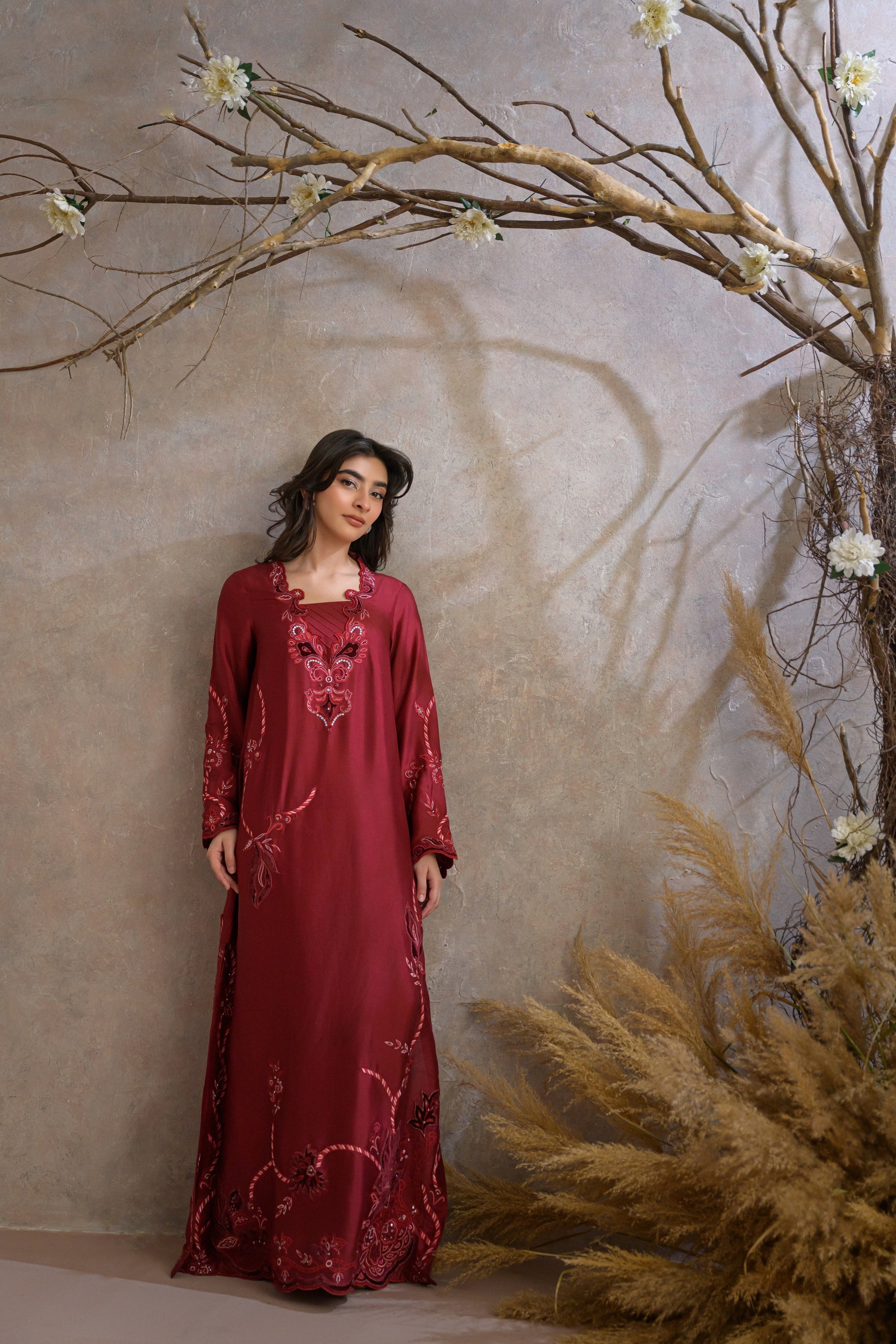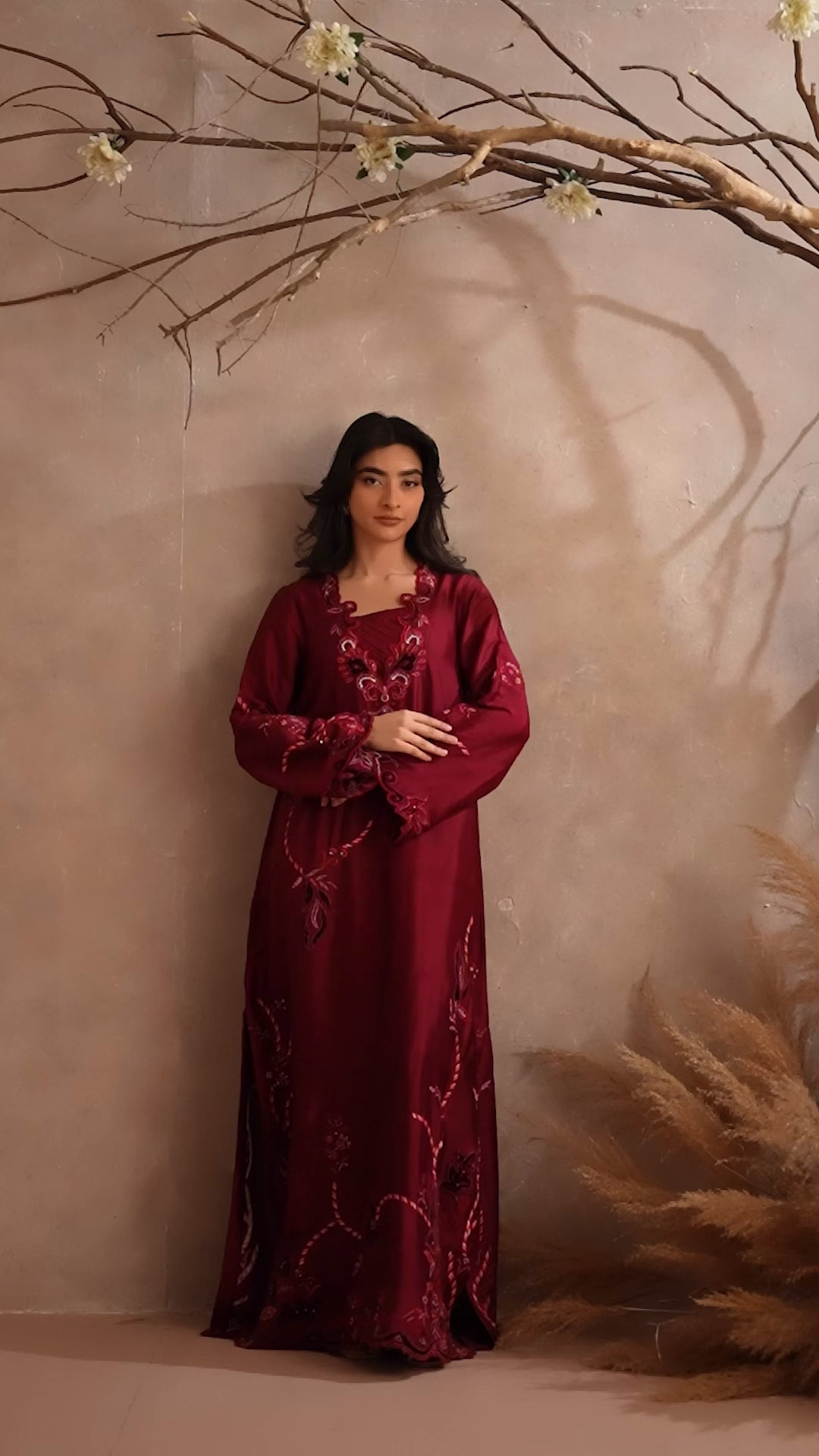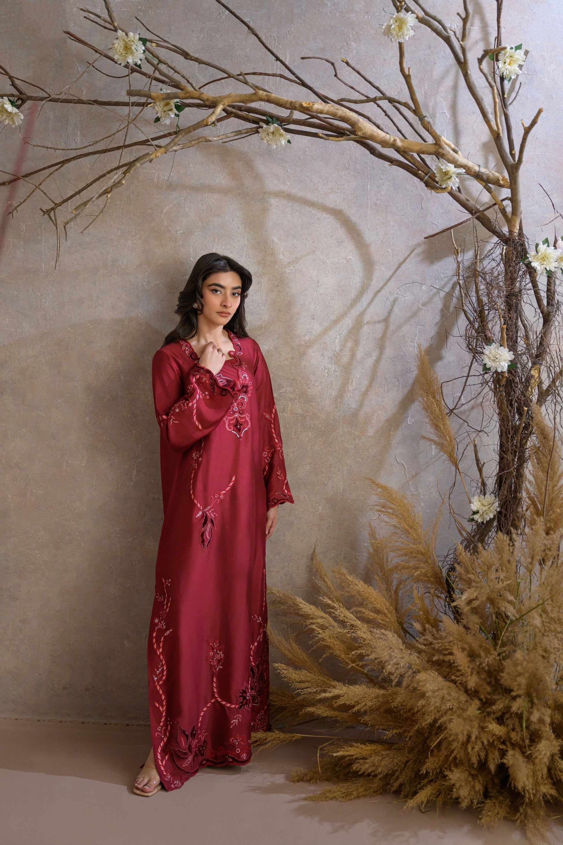 This kaftan is rendered in a profound oxblood hue, deepened with shadowed wine undertones—rich, velvety, and timelessly indulgent. Crafted to flow effortlessly, the silhouette exudes understated drama and refined elegance.