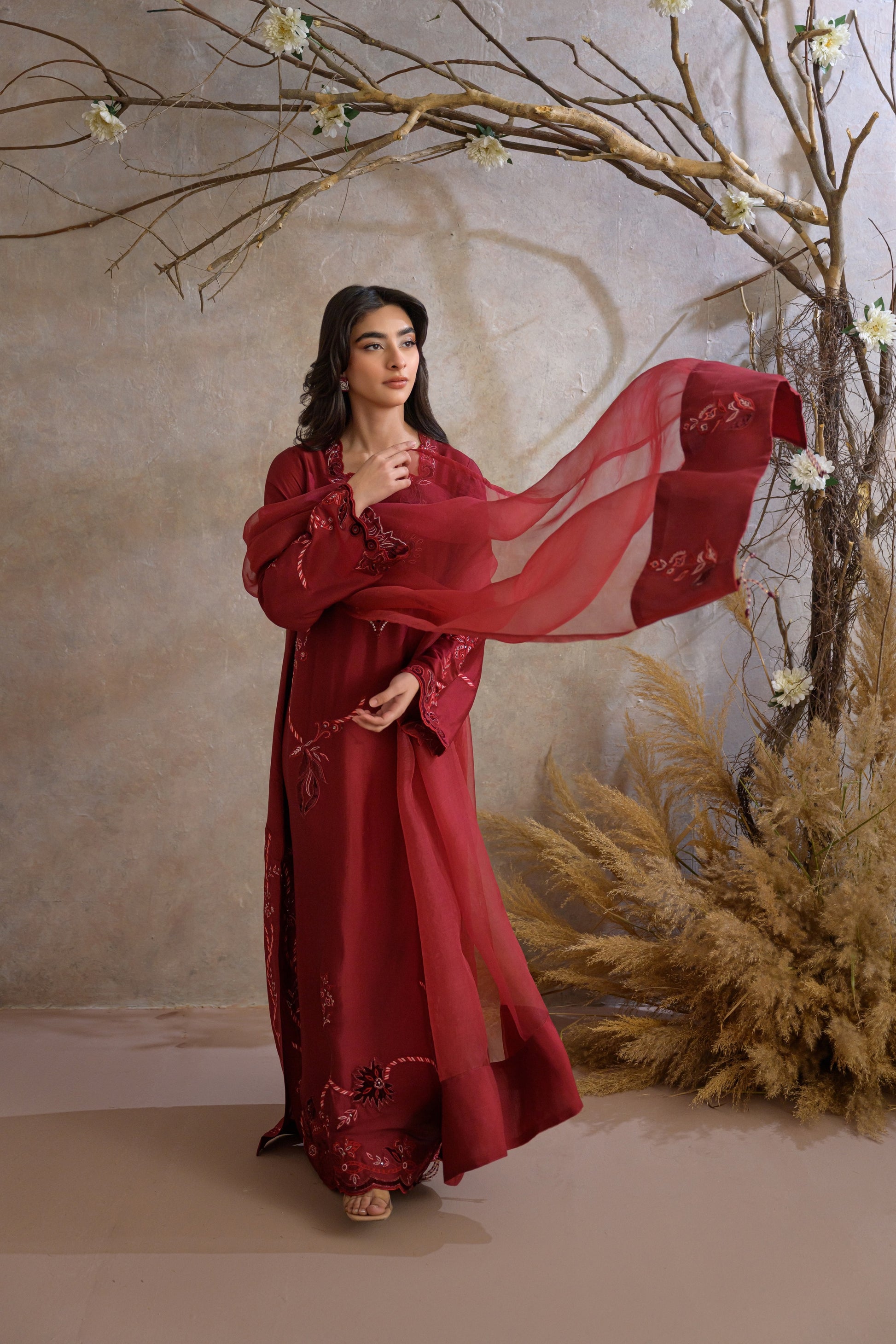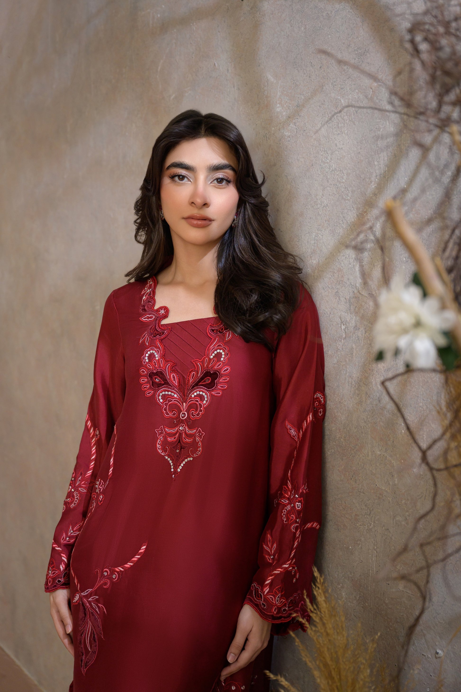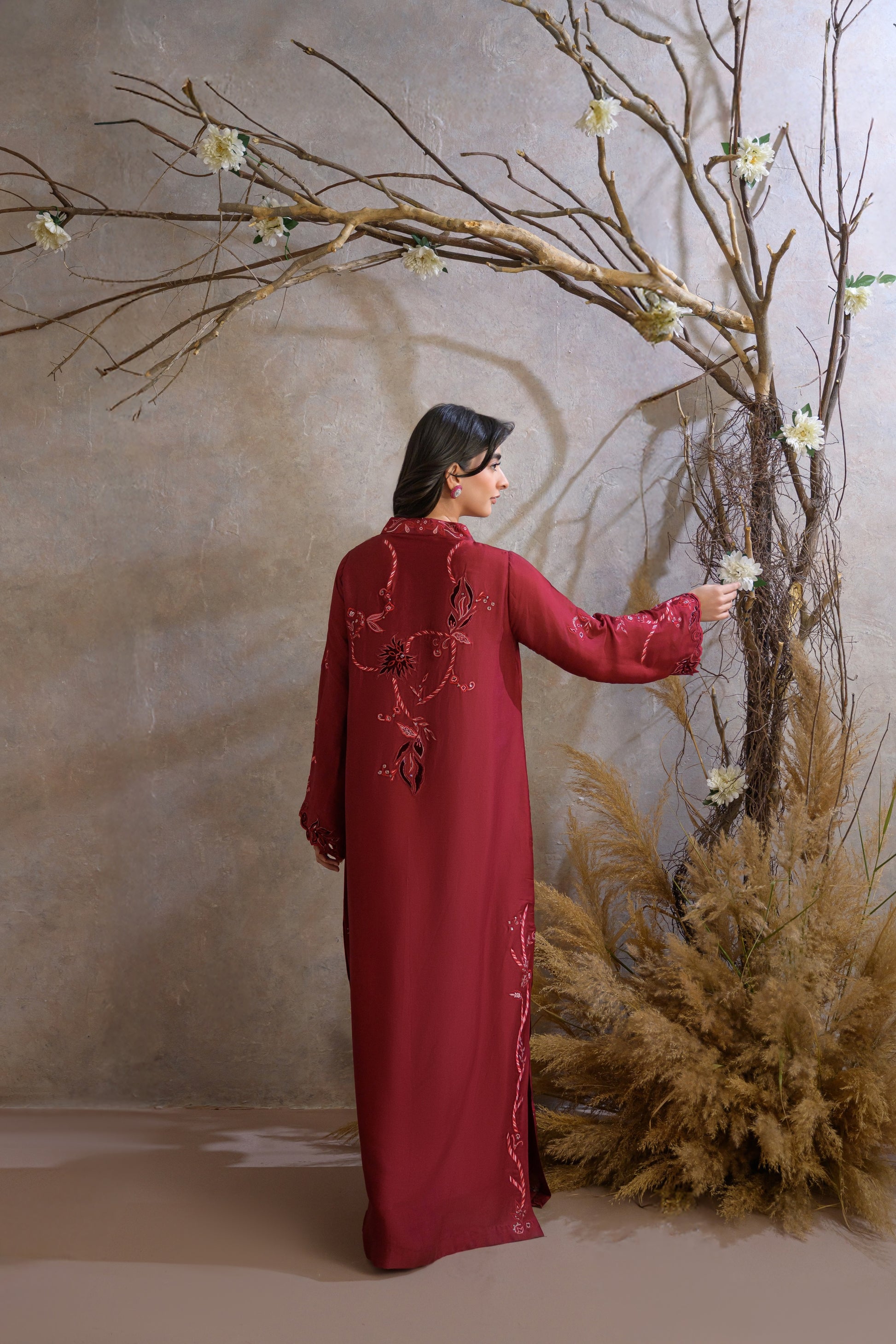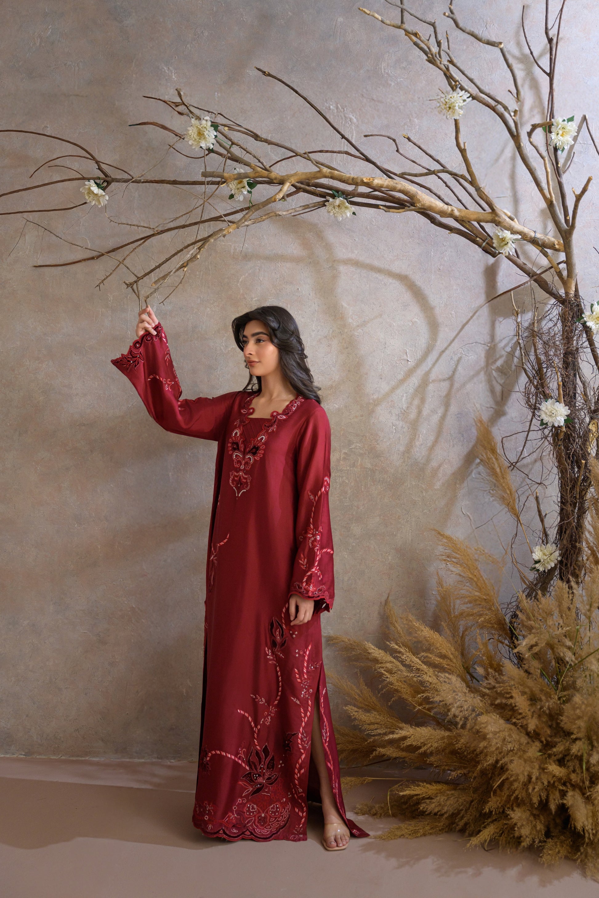 This kaftan is rendered in a profound oxblood hue, deepened with shadowed wine undertones—rich, velvety, and timelessly indulgent. Crafted to flow effortlessly, the silhouette exudes understated drama and refined elegance.