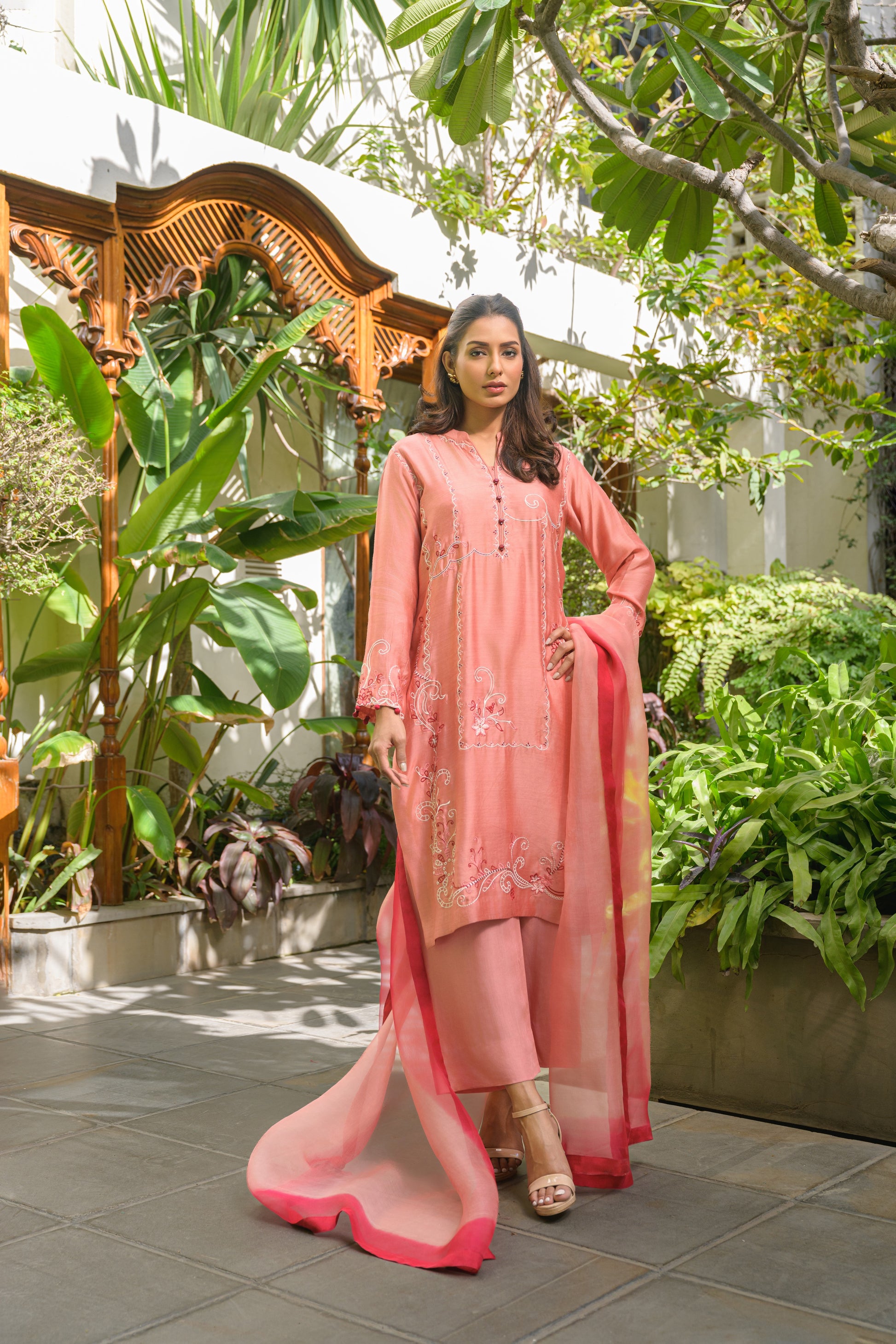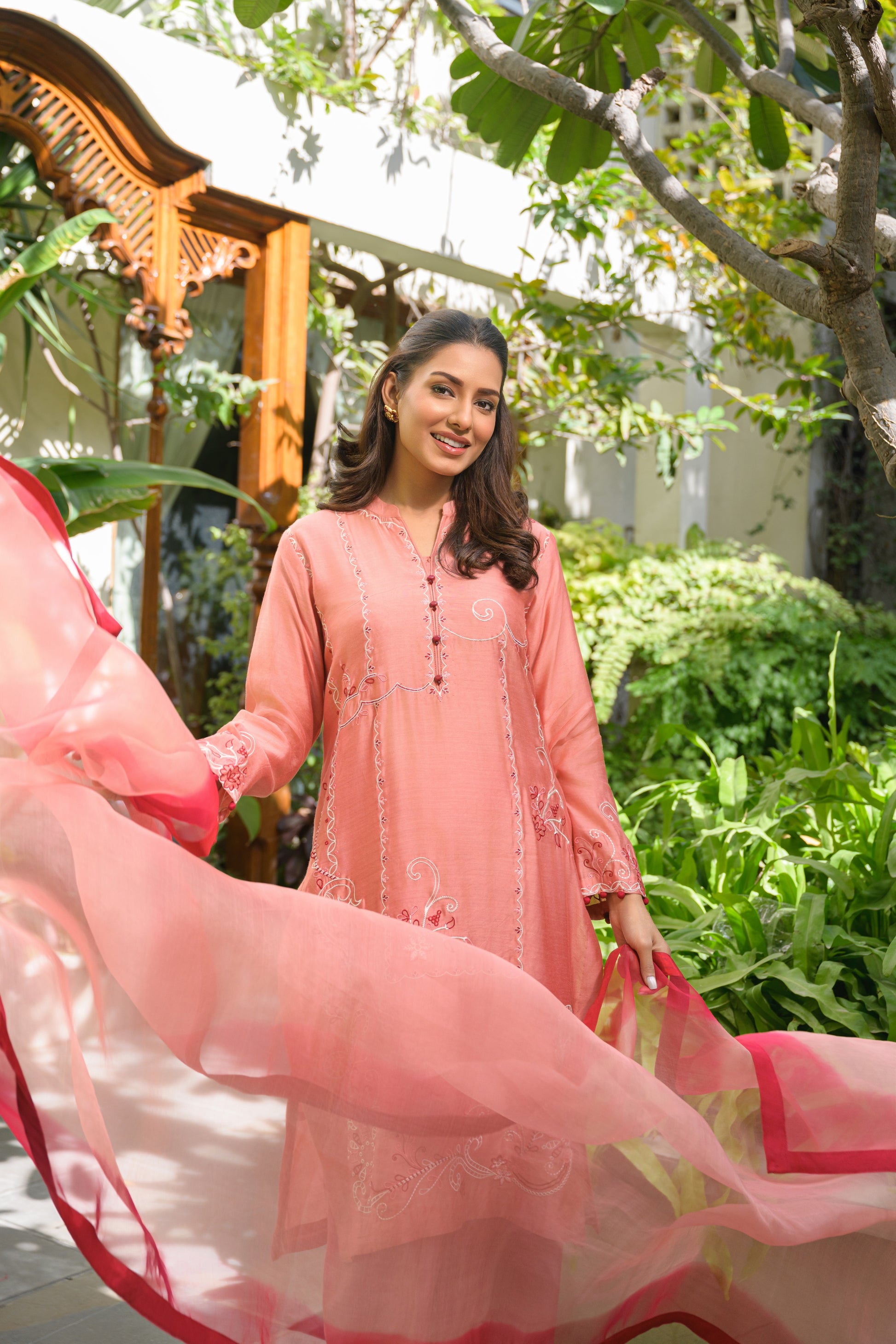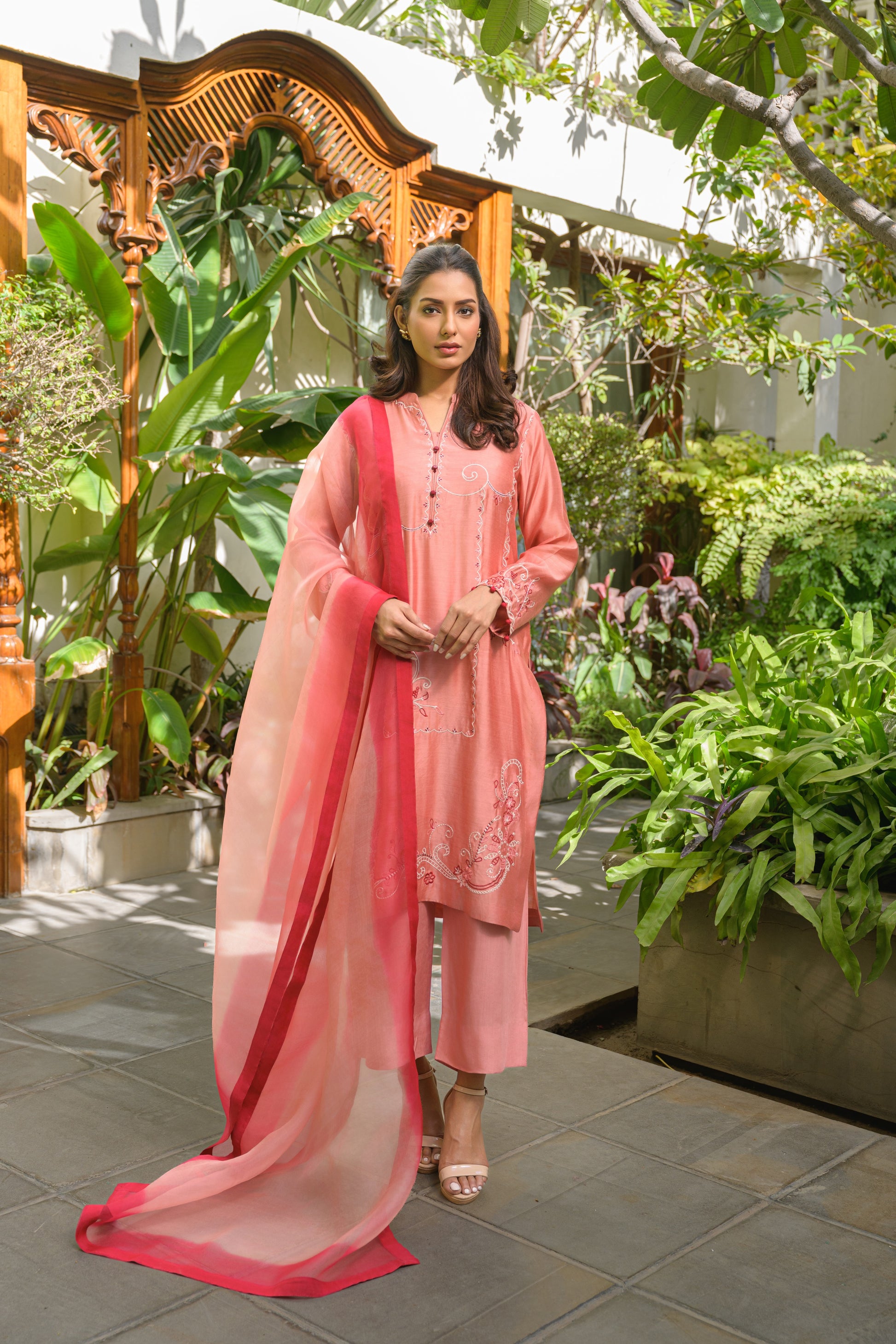 This coral pink khaddi silk ensemble is a graceful expression of contemporary elegance. Detailed embroidery enhances the fabric’s natural richness, lending a refined artisanal touch to the design.