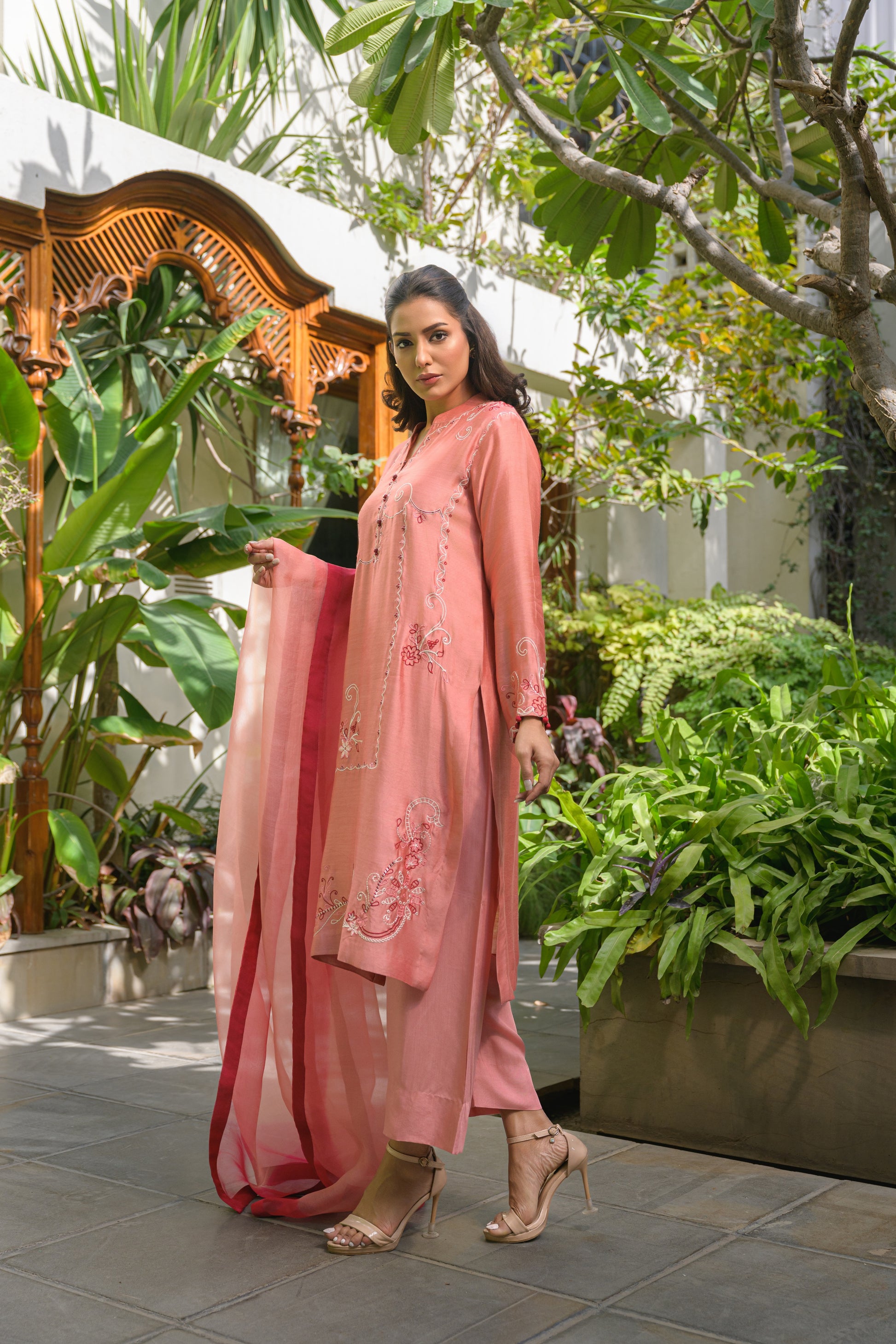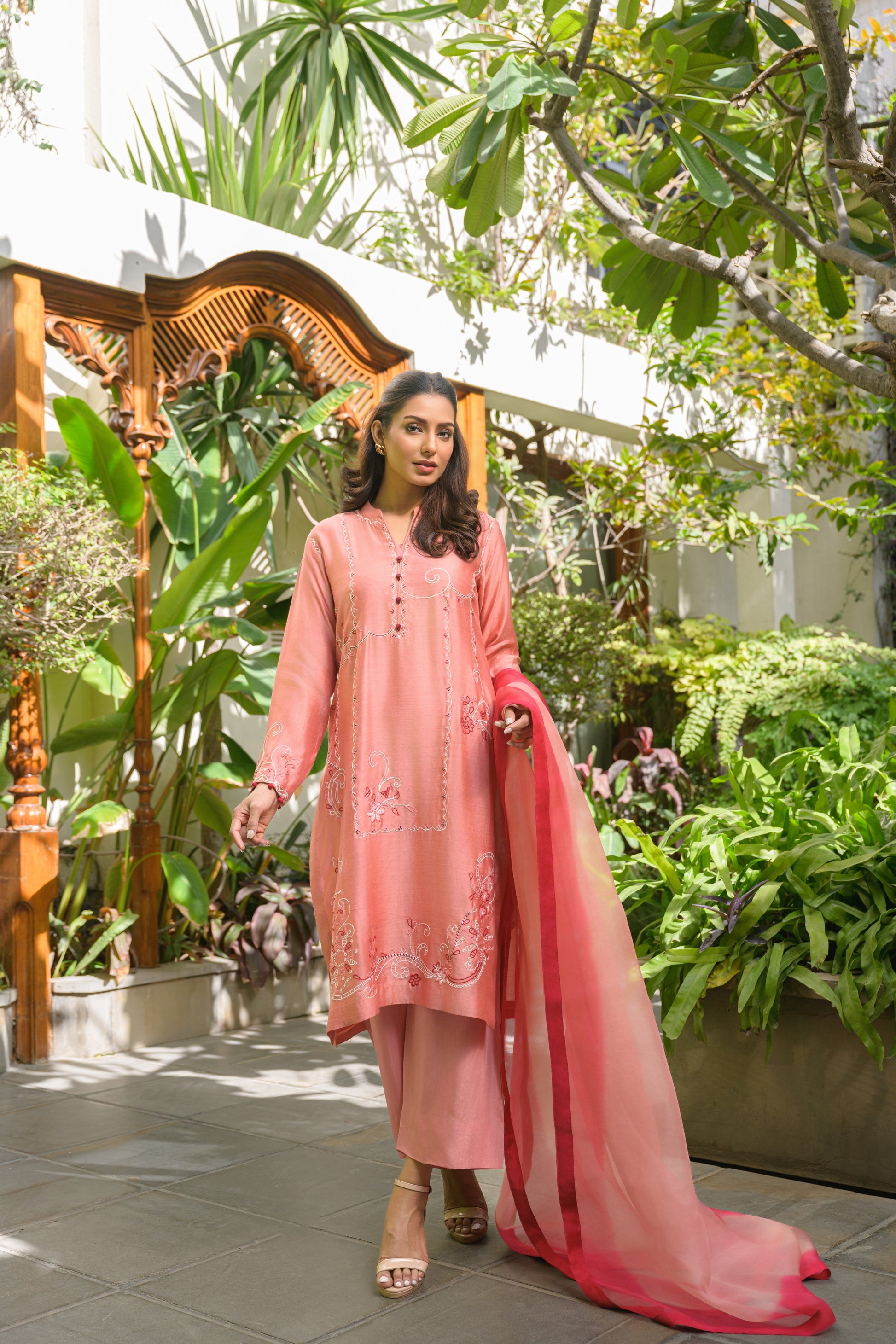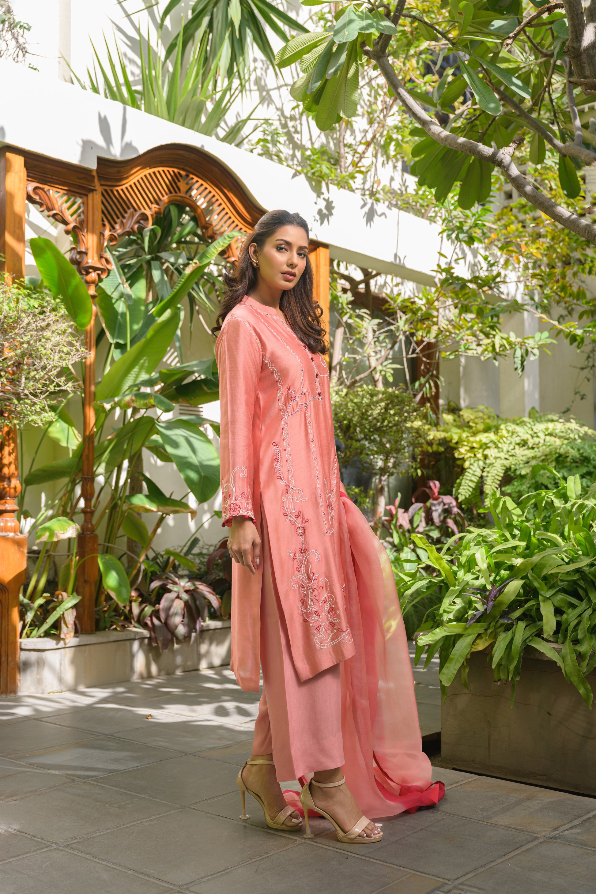 This coral pink khaddi silk ensemble is a graceful expression of contemporary elegance. Detailed embroidery enhances the fabric’s natural richness, lending a refined artisanal touch to the design.