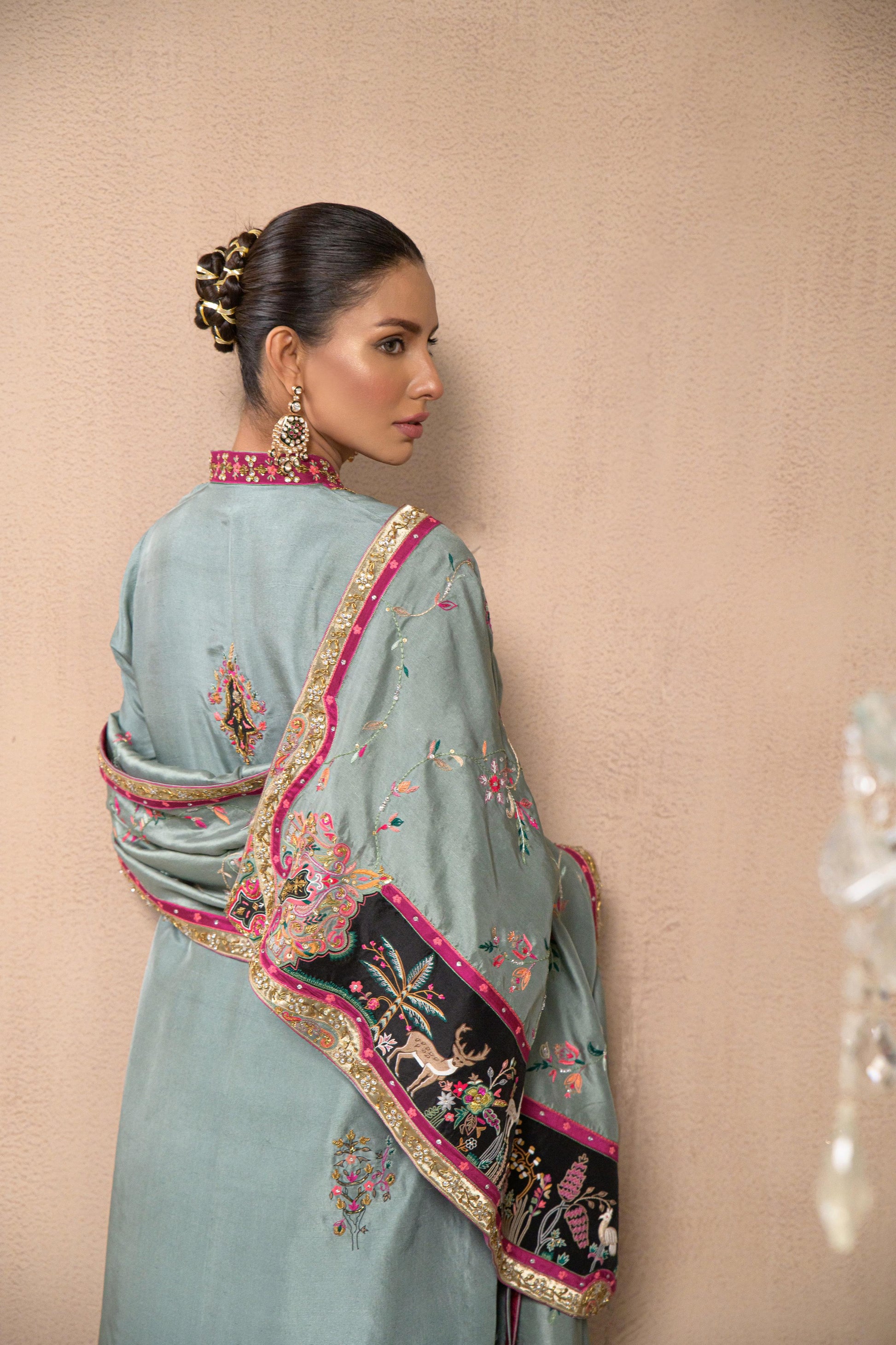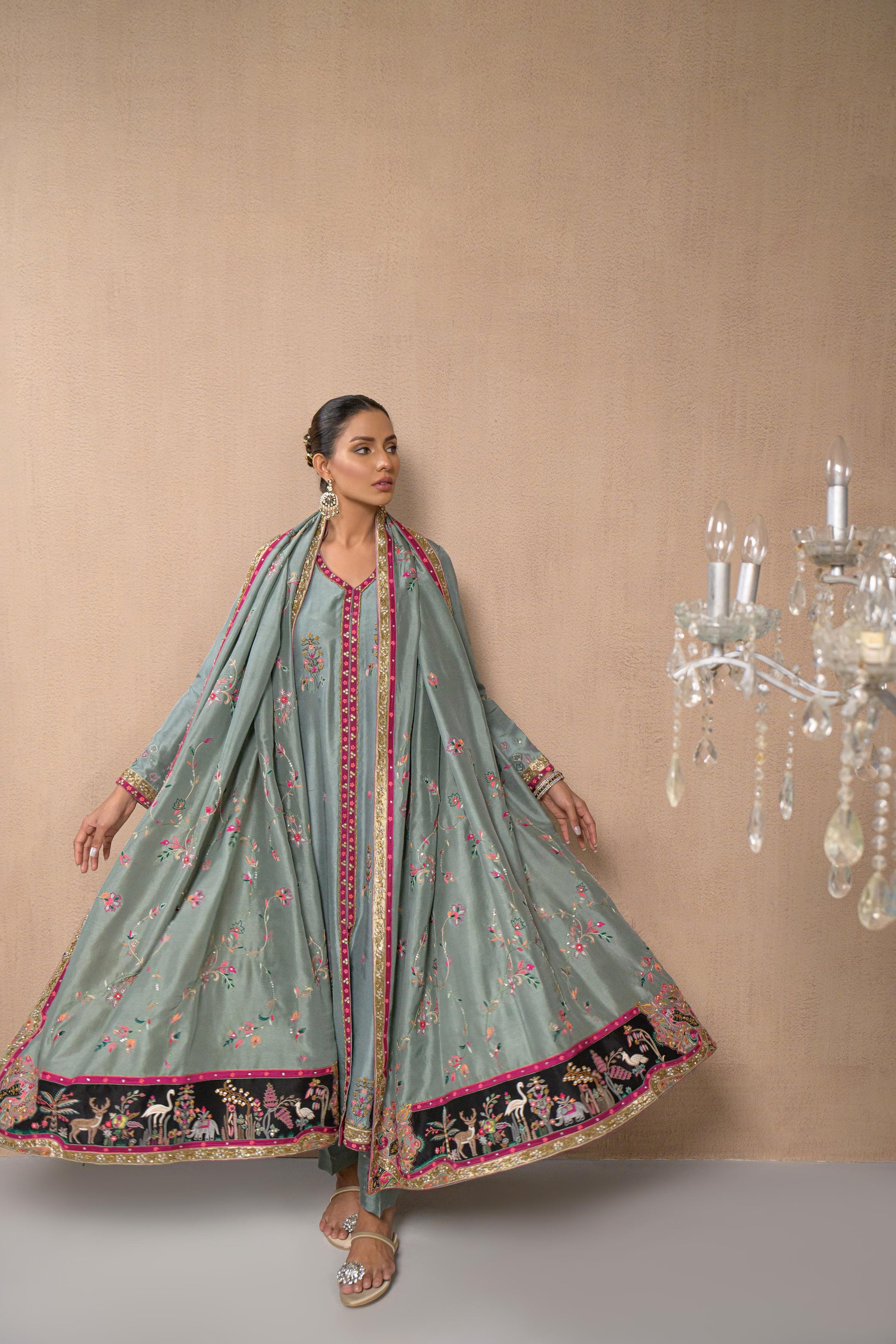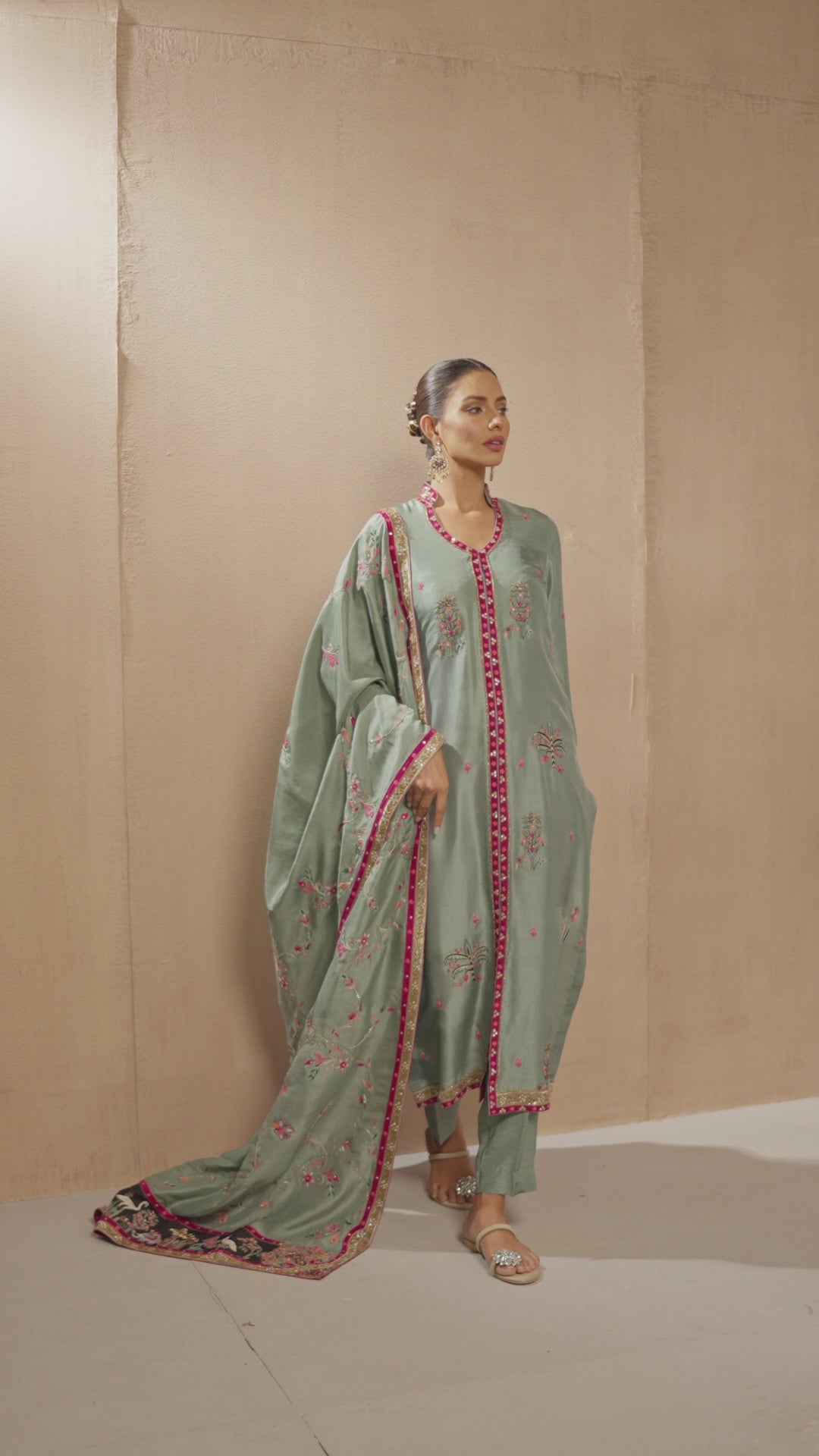 Draped in the elegance of dusty jade, this ensemble is a celebration of understated opulence. The flowing silhouette features intricate hand embroidery in vibrant magenta and resplendent gold, delicately scattered with floral motifs and miniature pastoral scenes along the hemline — an artistic nod to heritage craft. The ensemble is paired with a statement dupatta, echoing the same refined detailing, framed in rich borders of deep pink and black adorned with golden accents. Thoughtfully styled with tapered trousers and heirloom-inspired jewelry, this look speaks to the woman who embraces classic sophistication with a whisper of storytelling charm.