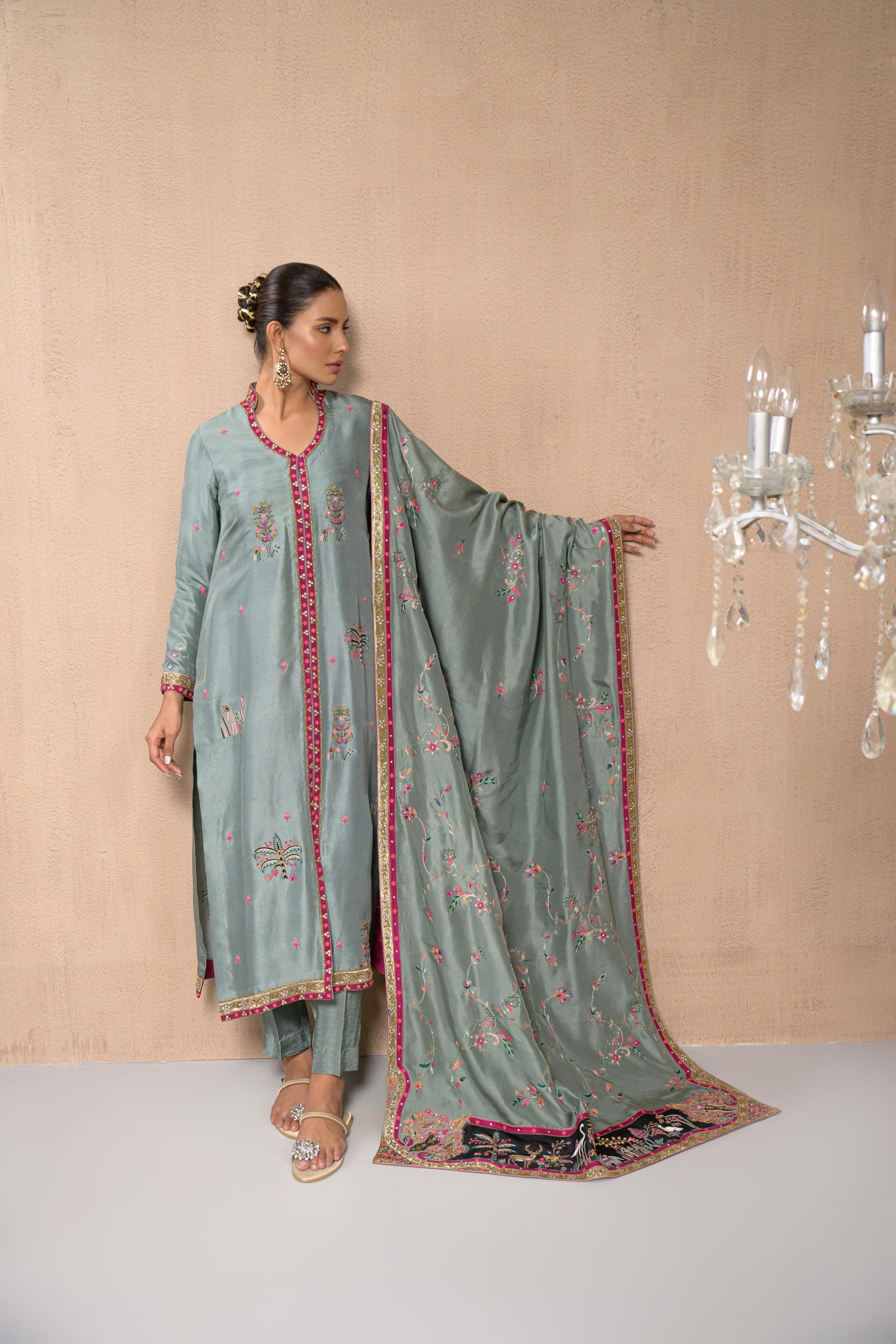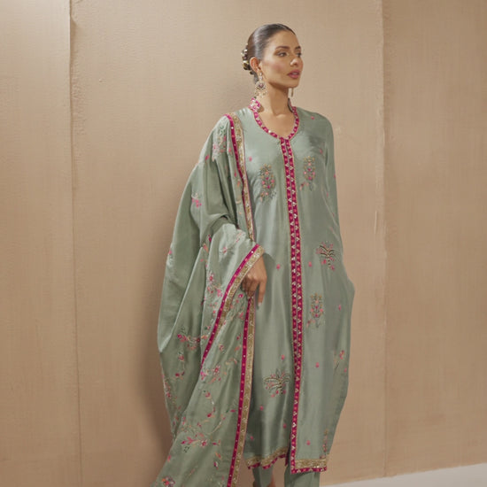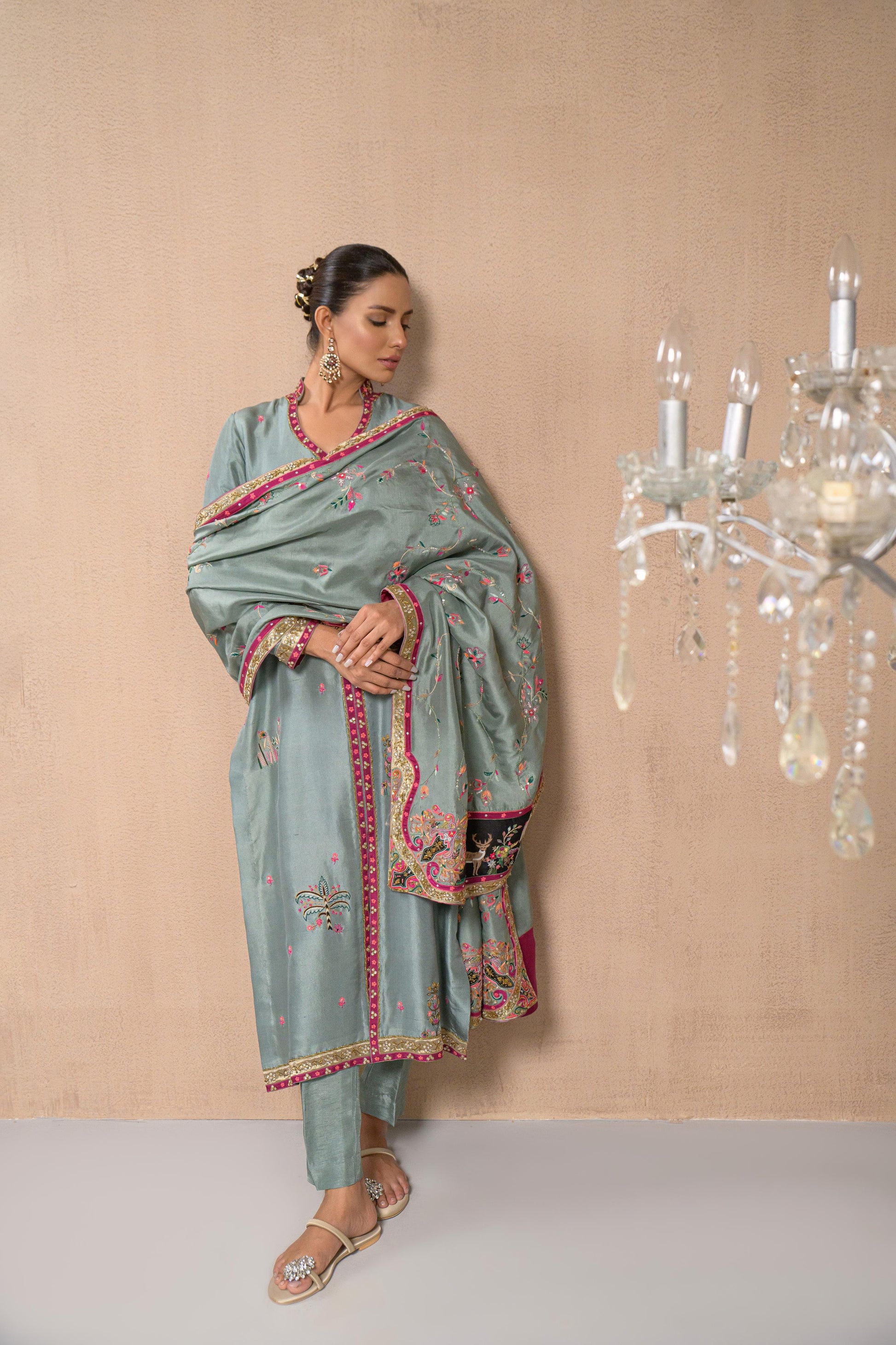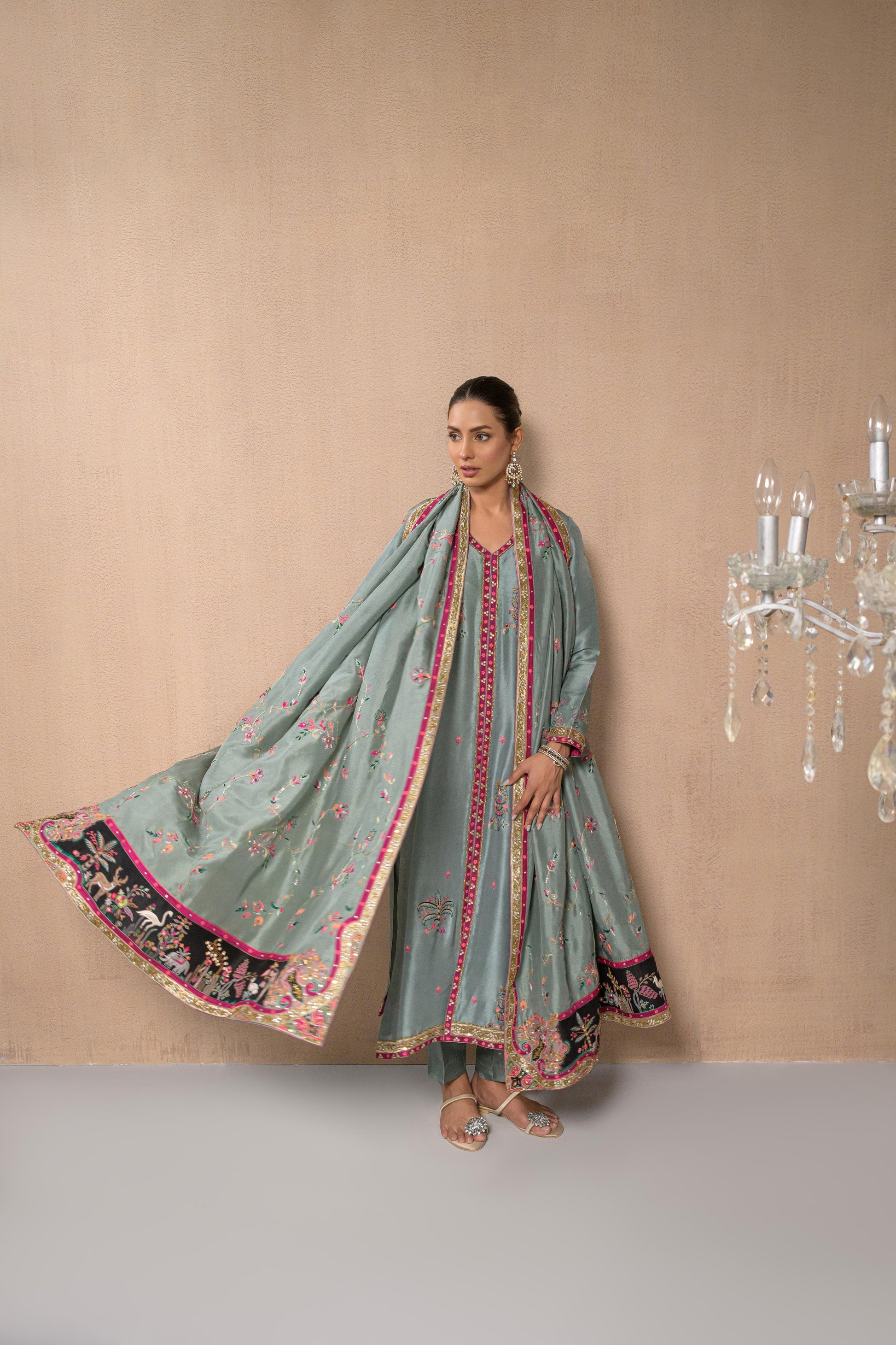 Draped in the elegance of dusty jade, this ensemble is a celebration of understated opulence. The flowing silhouette features intricate hand embroidery in vibrant magenta and resplendent gold, delicately scattered with floral motifs and miniature pastoral scenes along the hemline — an artistic nod to heritage craft. The ensemble is paired with a statement dupatta, echoing the same refined detailing, framed in rich borders of deep pink and black adorned with golden accents. Thoughtfully styled with tapered trousers and heirloom-inspired jewelry, this look speaks to the woman who embraces classic sophistication with a whisper of storytelling charm.