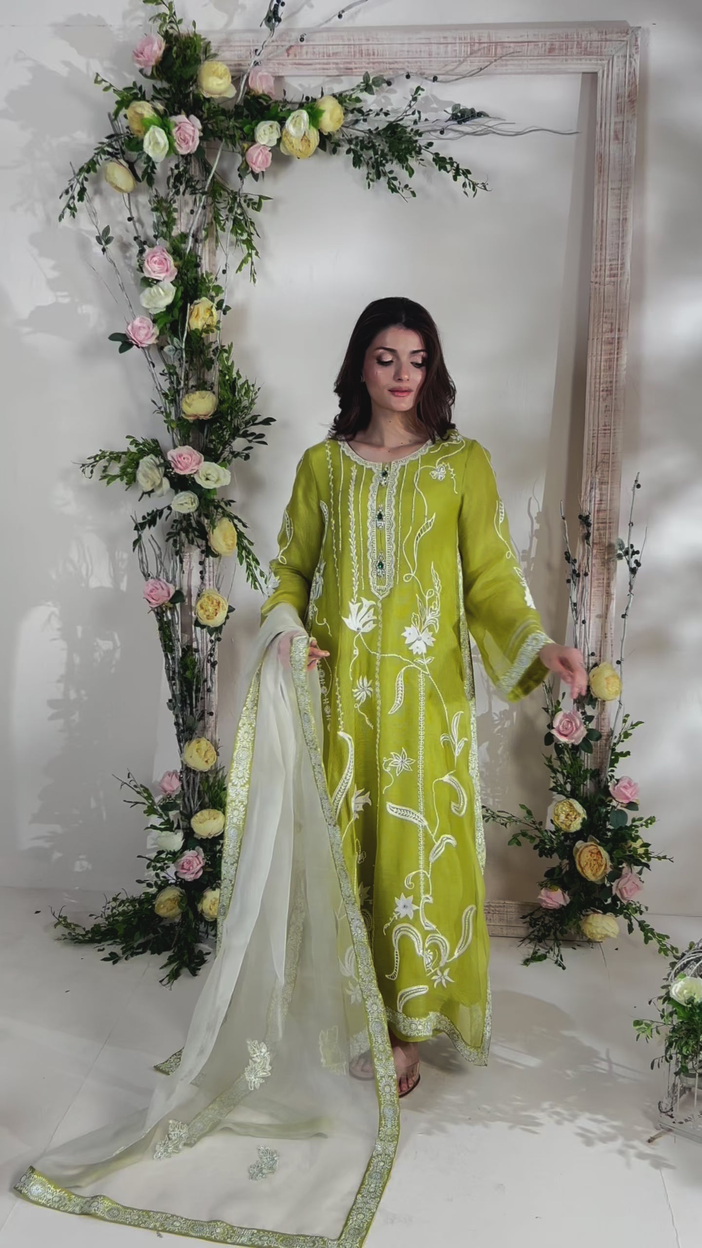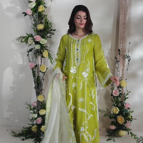 Crafted from the soft, refined texture of silk Karandi, this lime green kaftan radiates effortless elegance. It features intricate aari embroidery and delicately hand-embroidered motifs, thoughtfully accentuated with shimmering Swarovski stones for a subtle touch of glamour. The ensemble is beautifully completed with a stylish block-printed dupatta and a coordinating izaar, creating a perfect balance of tradition and contemporary flair.