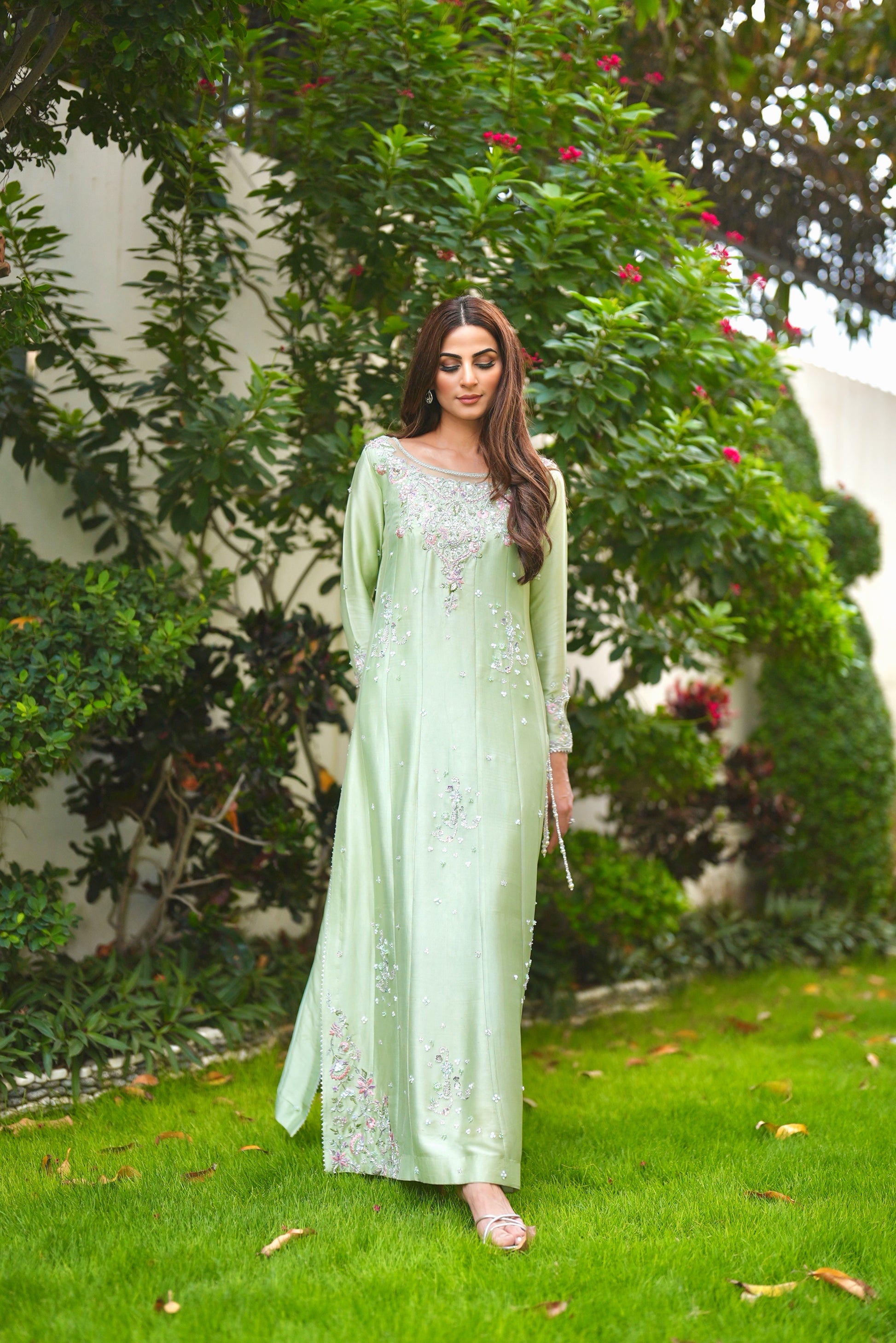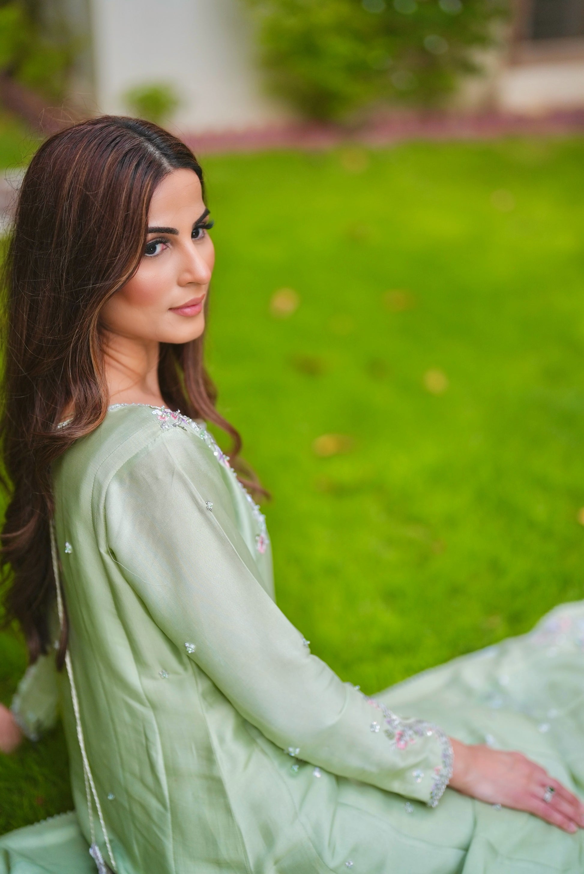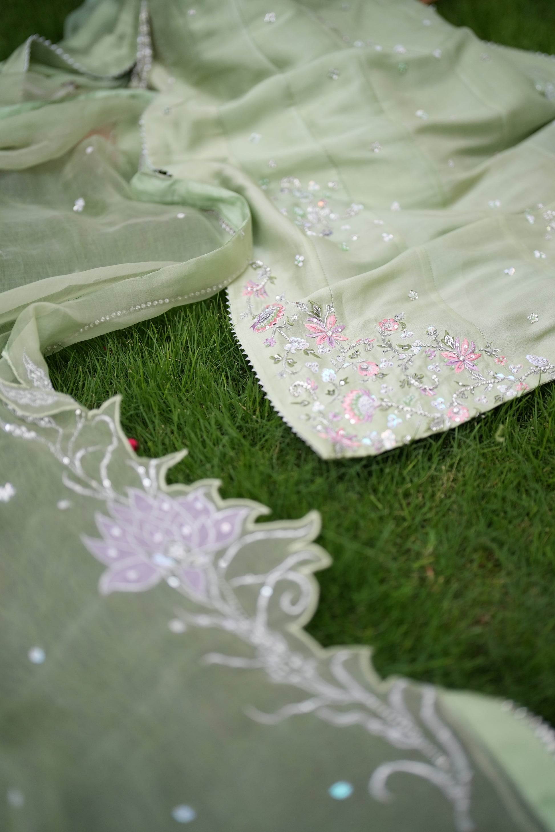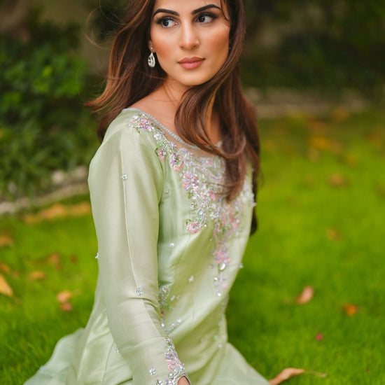 A dreamy mint green kalidaar, crafted on soft maysuri silk fabric, adorned with silver Swarovskis, soft resham hues, and delicate pearls and crystals. Playful chaak hangings and embroidered dori add charm, while a cutwork embroidered dupatta and straight trousers complete this graceful, romantic look.