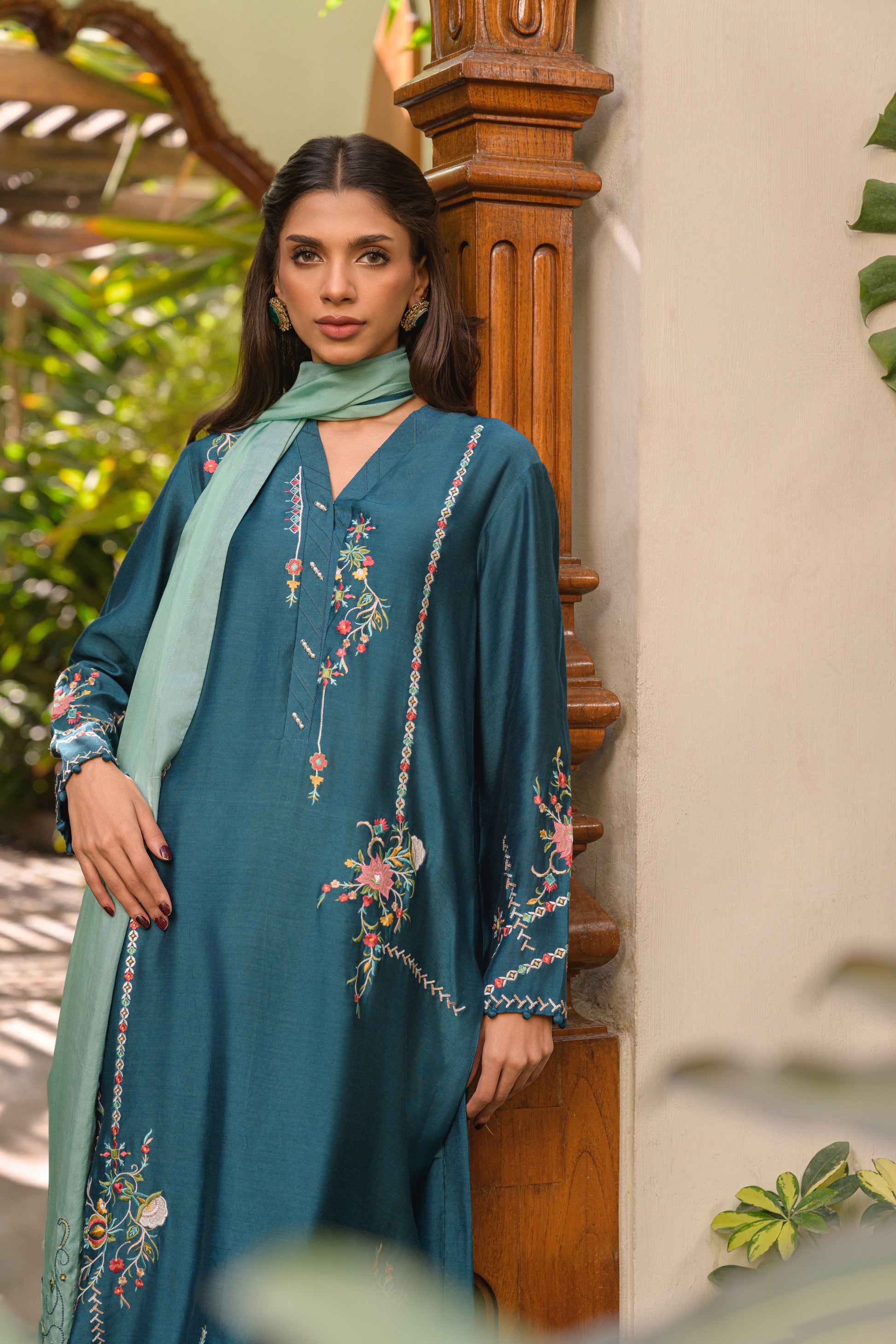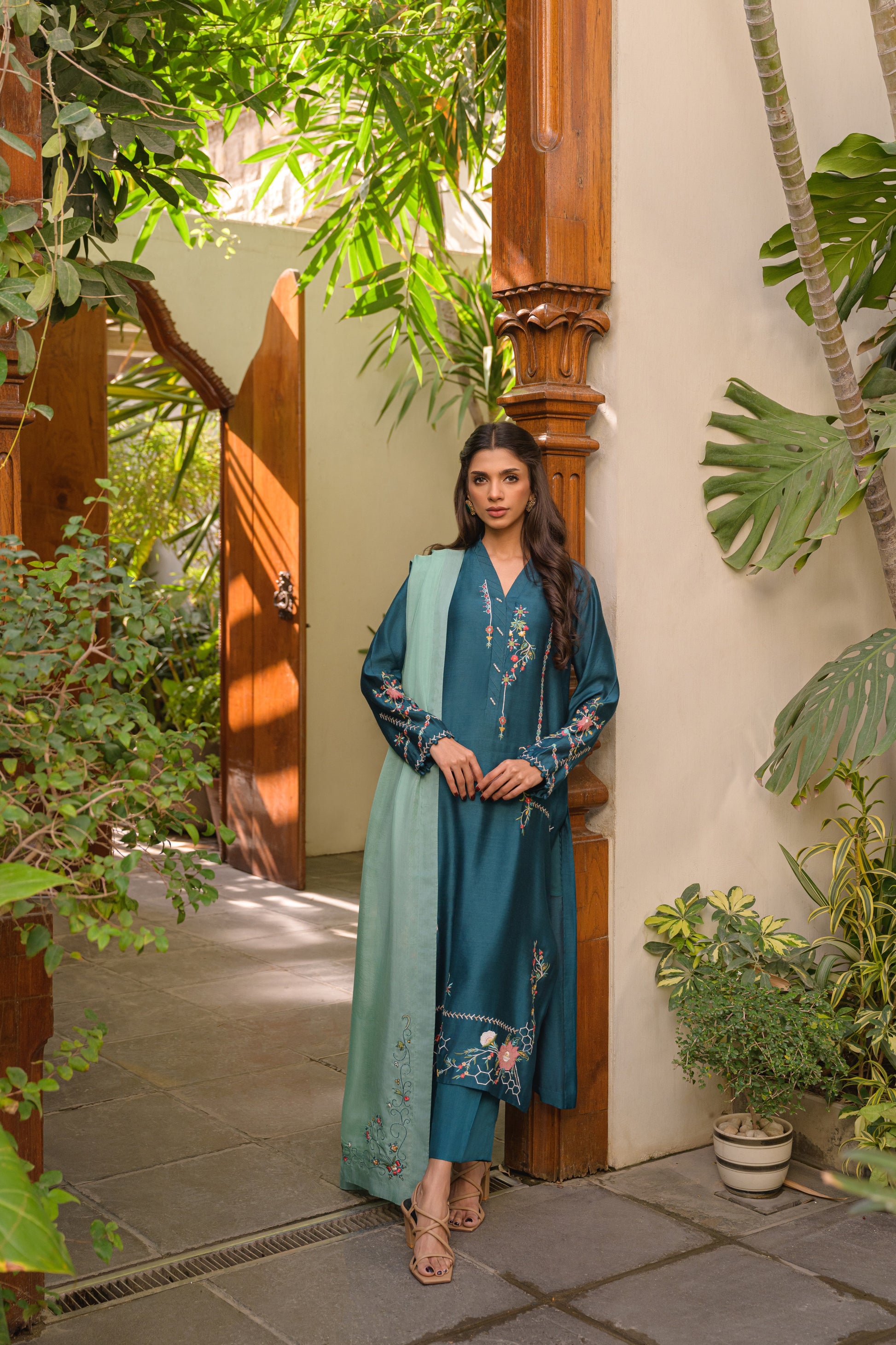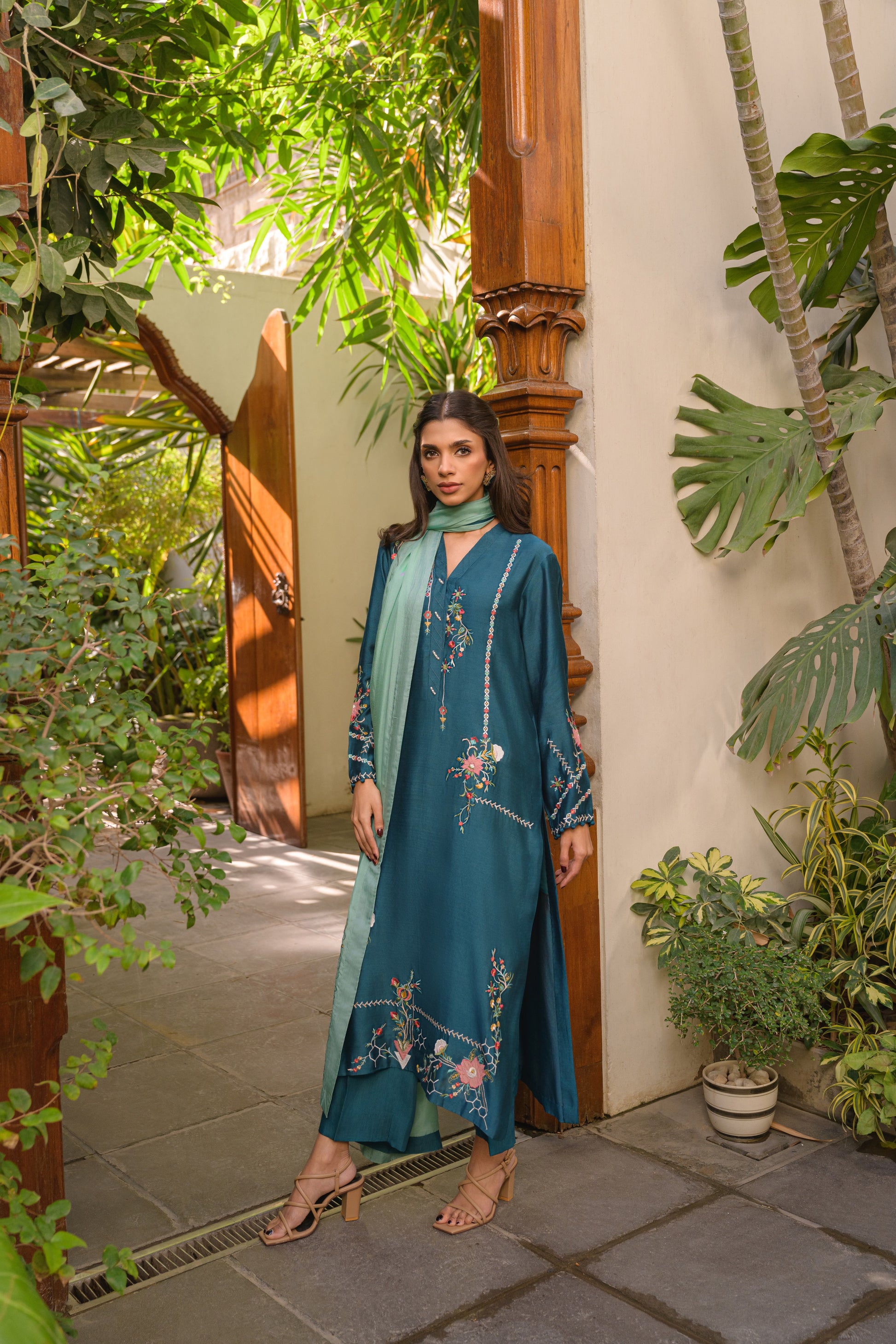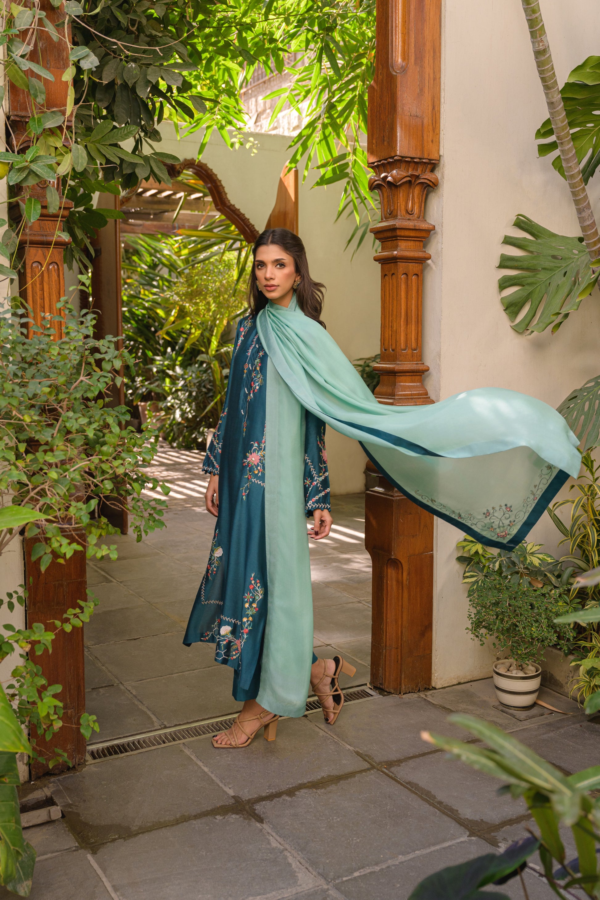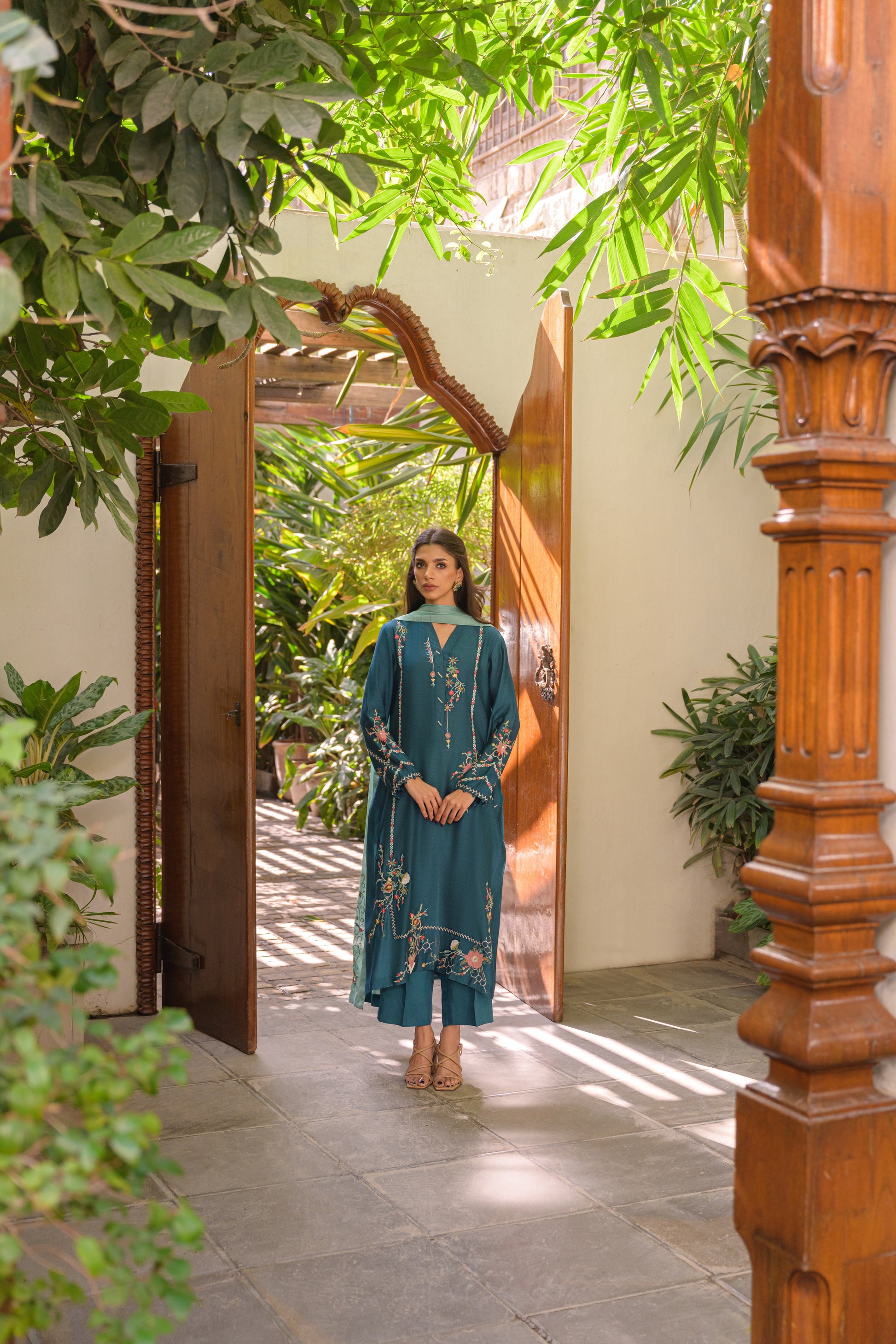 Rich teal green khaddi silk, adorned with striking appliqués and intricate, vibrant thread embroidery, is complemented by an embroidered silk dupatta and izaar — a bold yet elegant celebration of timeless craftsmanship and modern luxury.