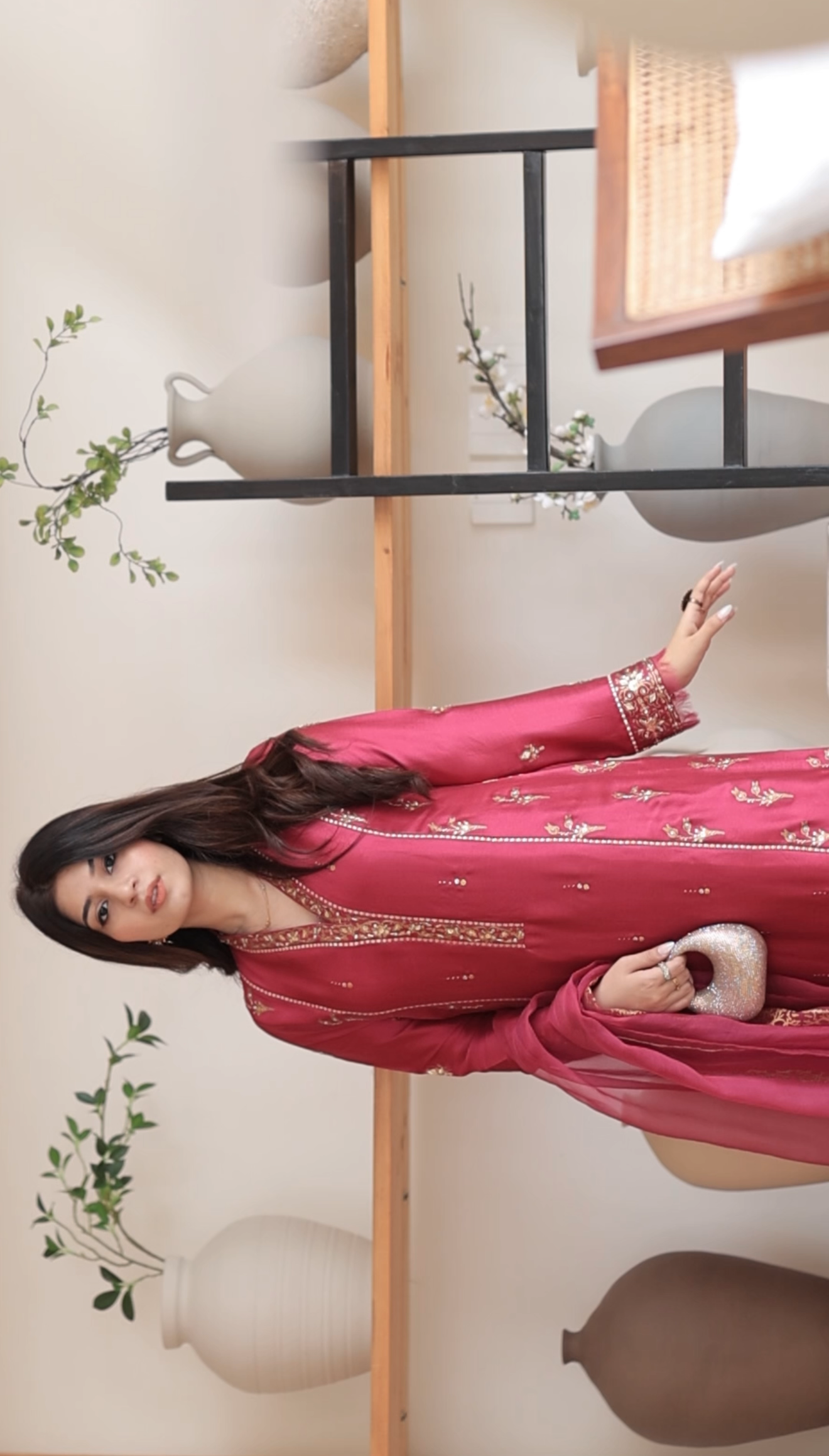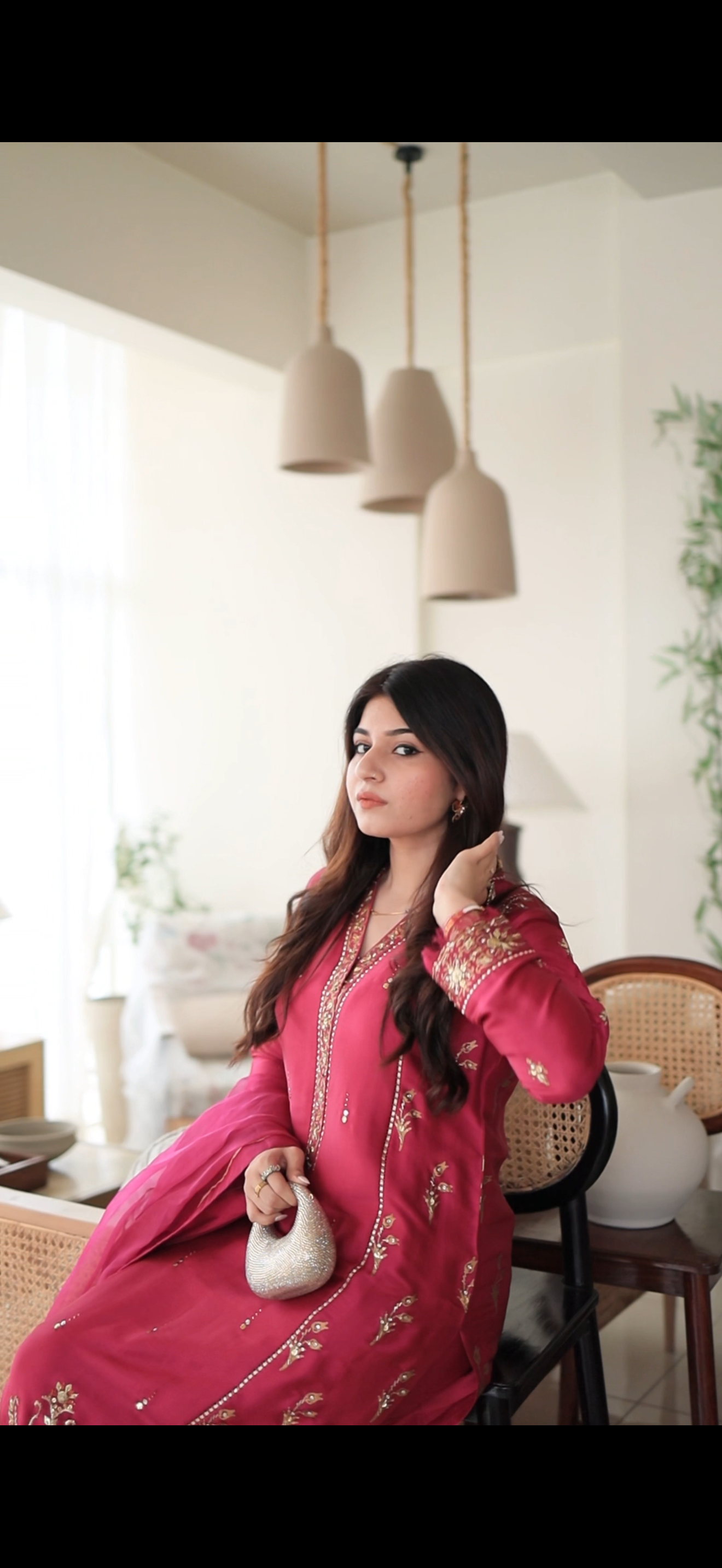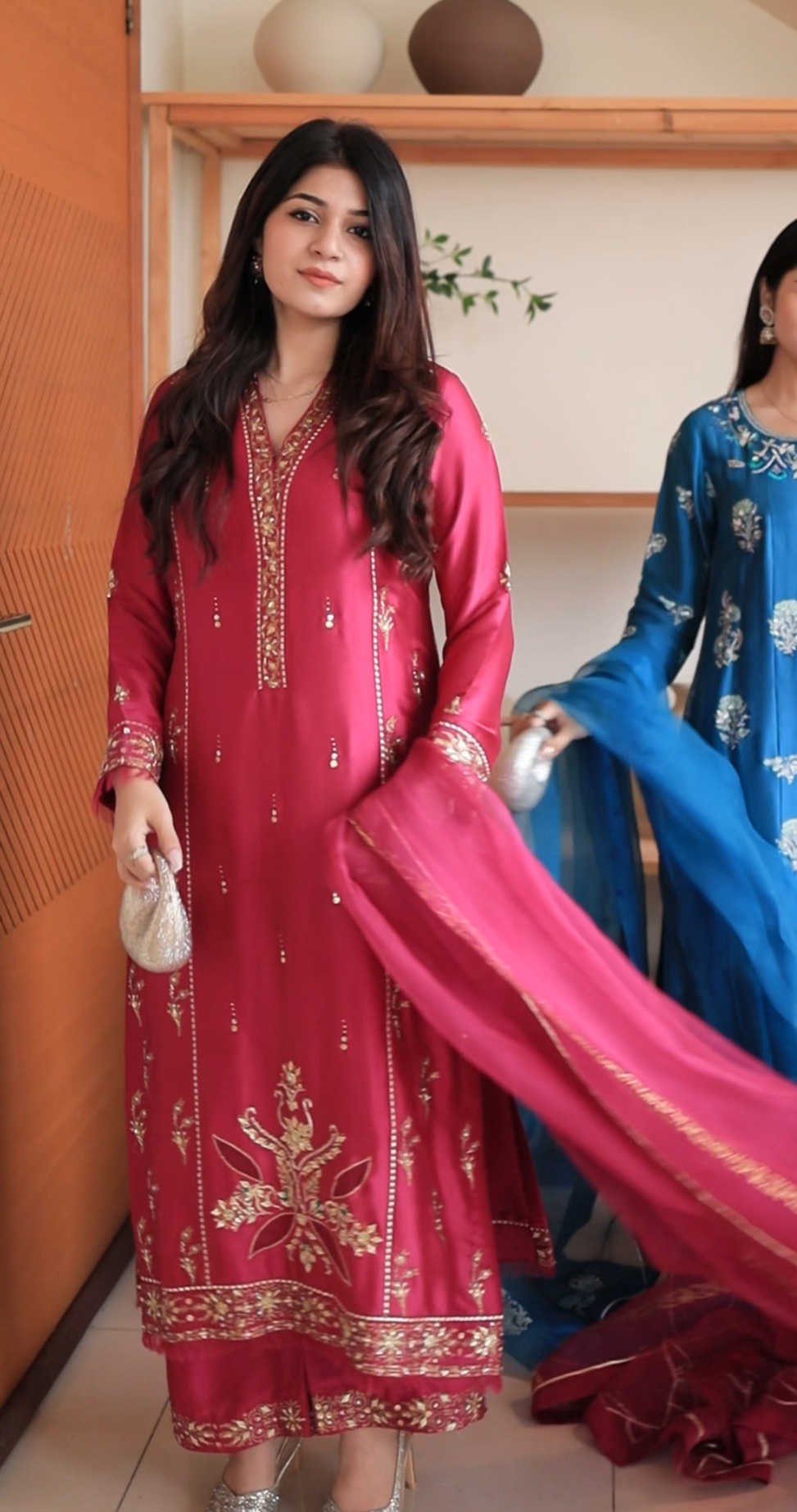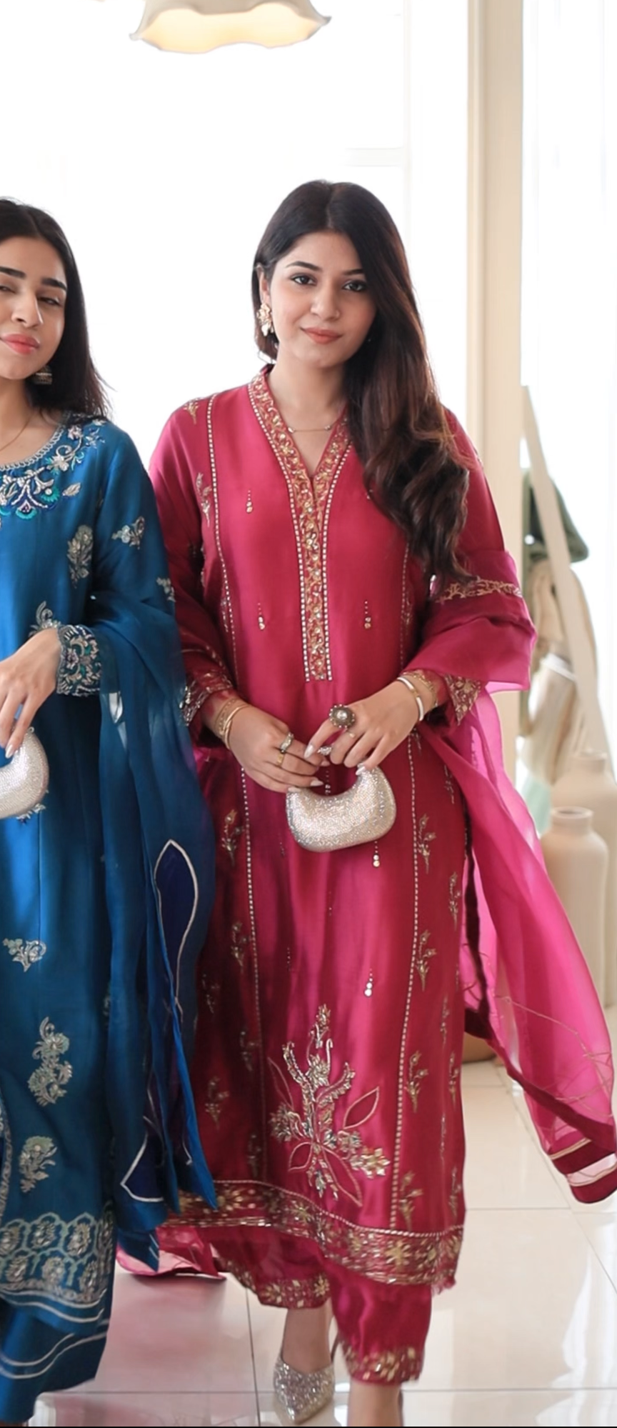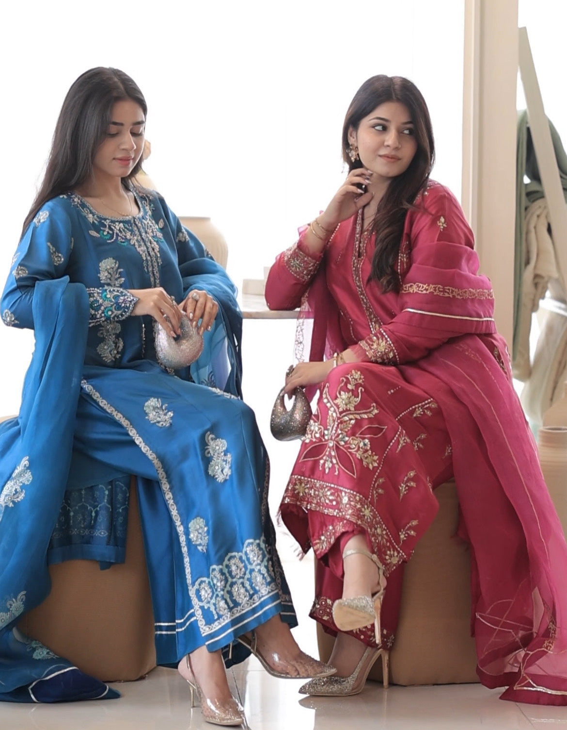 A striking expression of modern elegance, this hot pink Maysuri silk shirt is exquisitely detailed with handcrafted block print and intricate gota embellishments. The lustrous silk drapes gracefully, creating a silhouette that is both timeless and refined. Paired with a diaphanous organza dupatta adorned with delicate gota work and a finely tailored izaar, this ensemble captures the spirit of celebratory glamour, perfect for dholak nights and festive soirées.