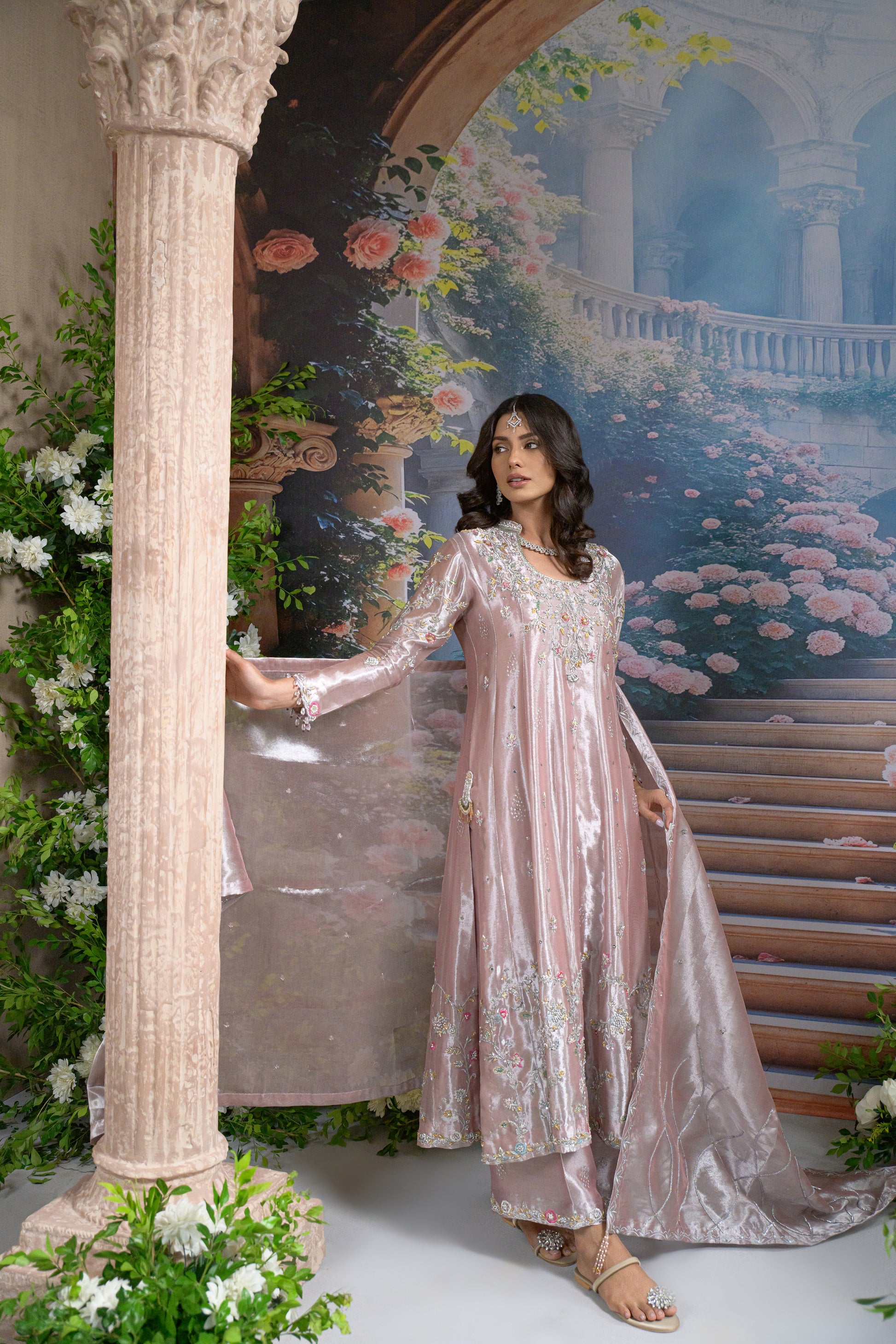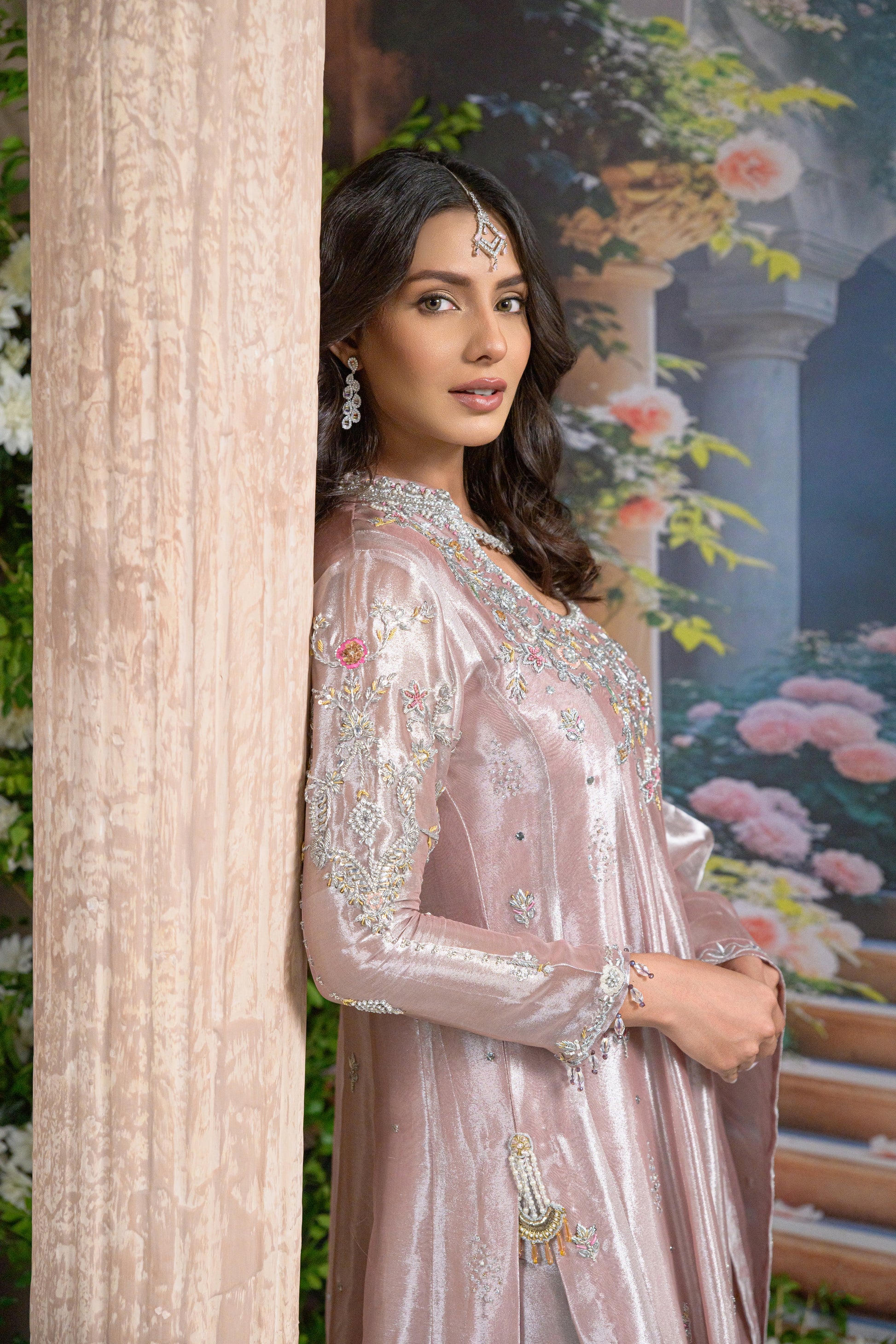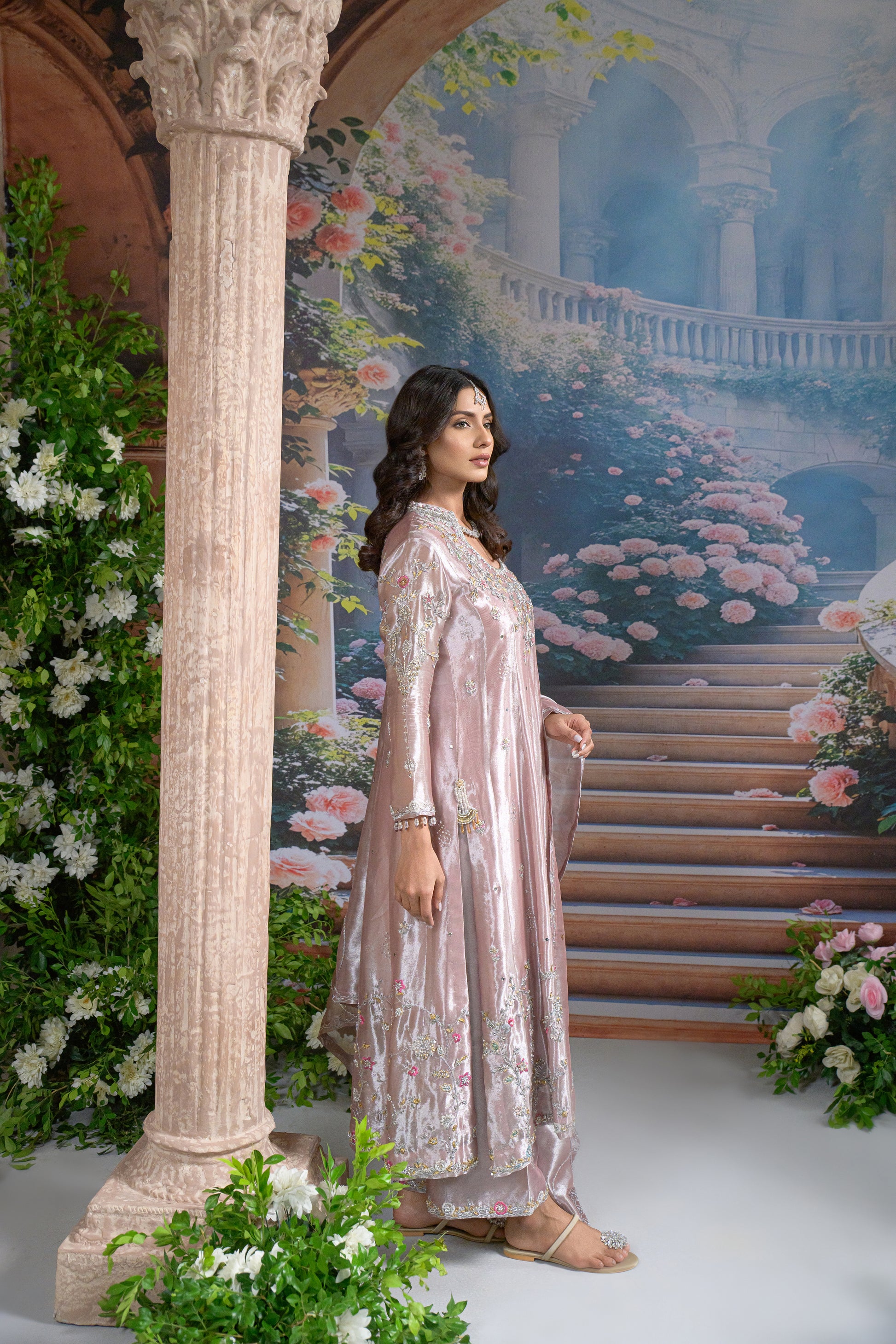 Bathed in the ethereal glow of moonlight,Miral is a symphony of elegance crafted in a delicate mauve-pink velvet. The ensemble blooms with hand-embroidered florals in hues of silver, blush, and soft gold — a garden of whispers stitched with devotion. Crystal beads and dainty tassels dangle like morning dew, while the regal silhouette flows with the grace of a forgotten Mughal princess wandering through a rose-draped palace. Finished with a flowing dupatta that glistens like stardust, Miral is made for evenings that feel like poetry.