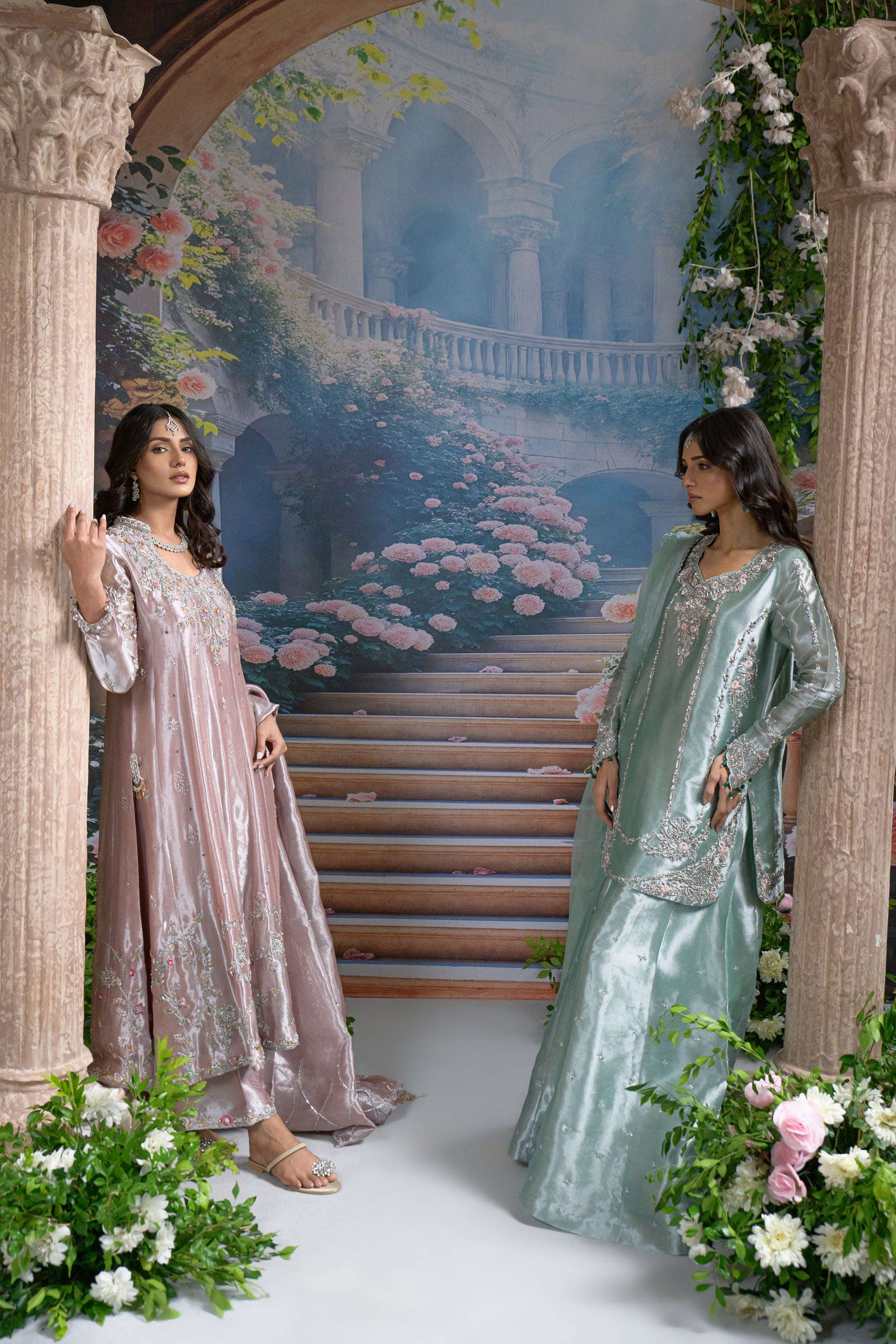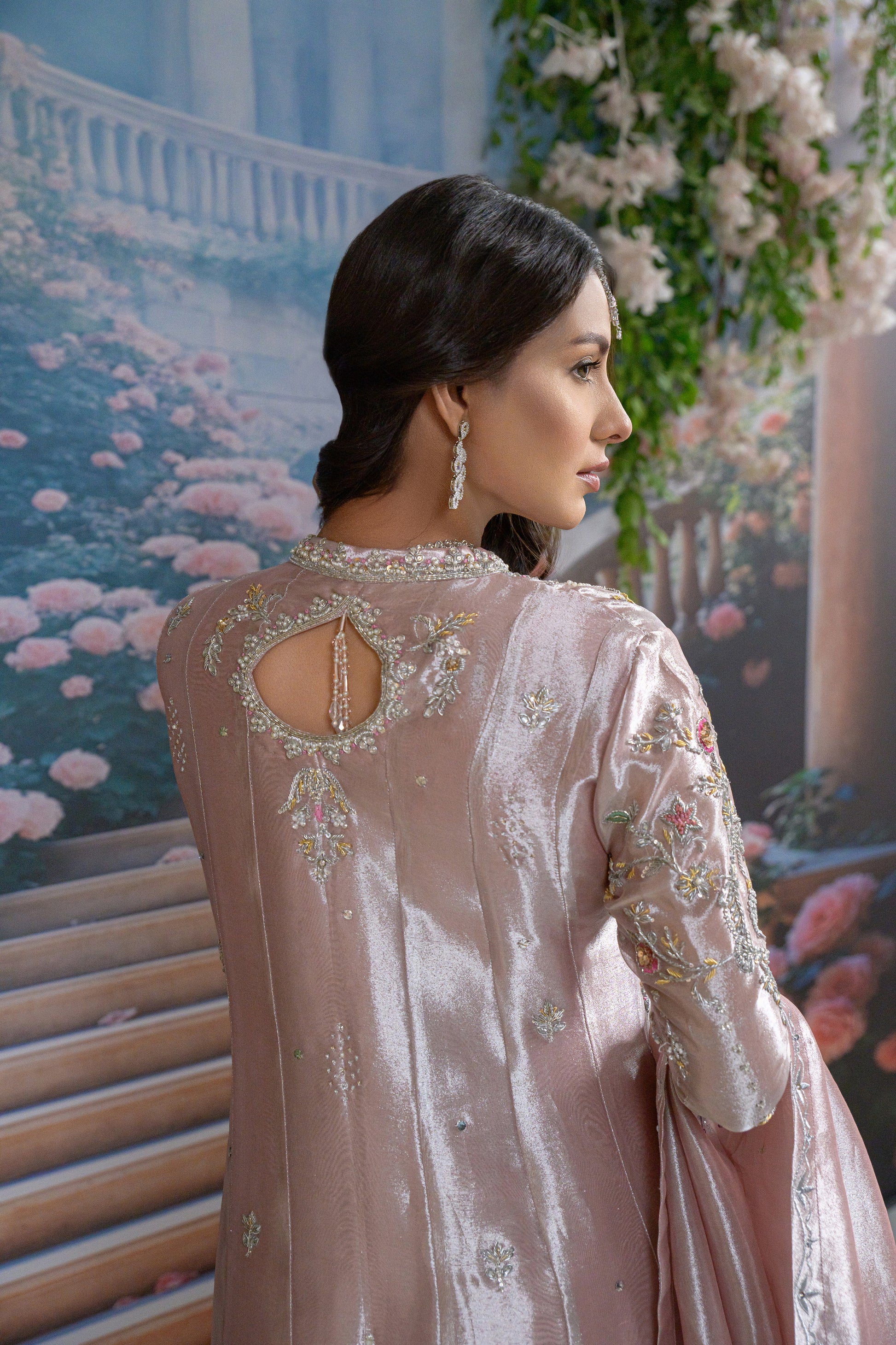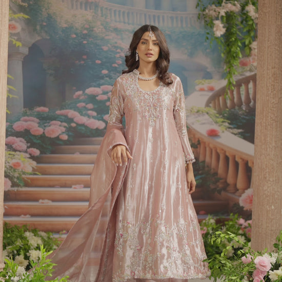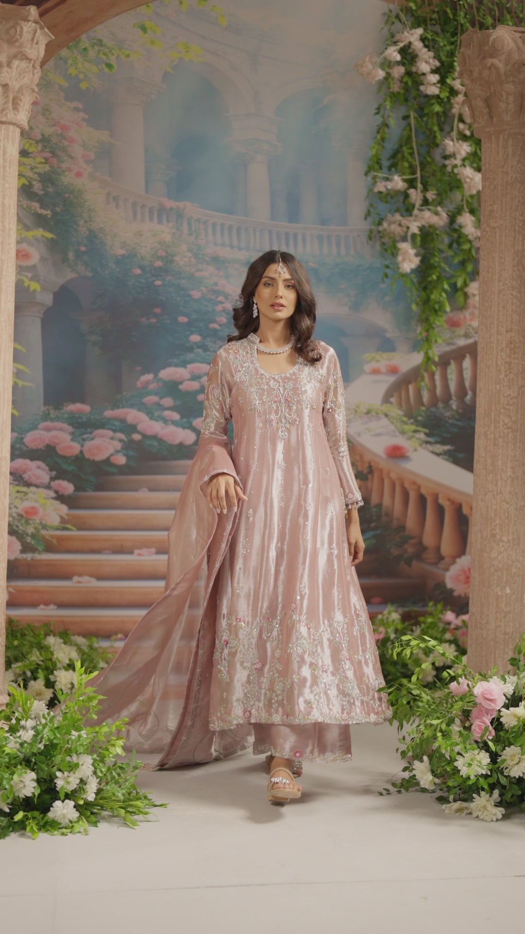 Bathed in the ethereal glow of moonlight,Miral is a symphony of elegance crafted in a delicate mauve-pink velvet. The ensemble blooms with hand-embroidered florals in hues of silver, blush, and soft gold — a garden of whispers stitched with devotion. Crystal beads and dainty tassels dangle like morning dew, while the regal silhouette flows with the grace of a forgotten Mughal princess wandering through a rose-draped palace. Finished with a flowing dupatta that glistens like stardust, Miral is made for evenings that feel like poetry.