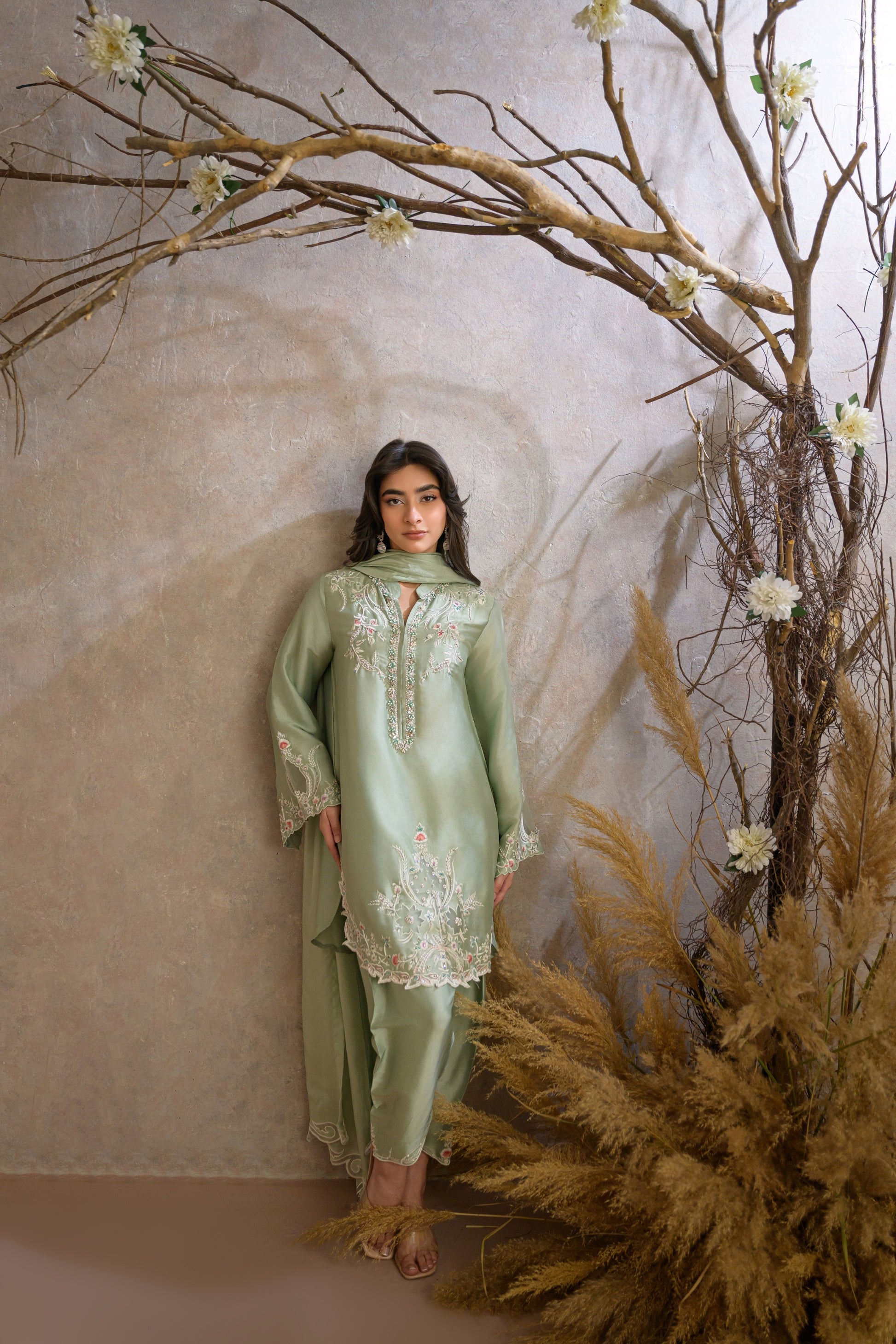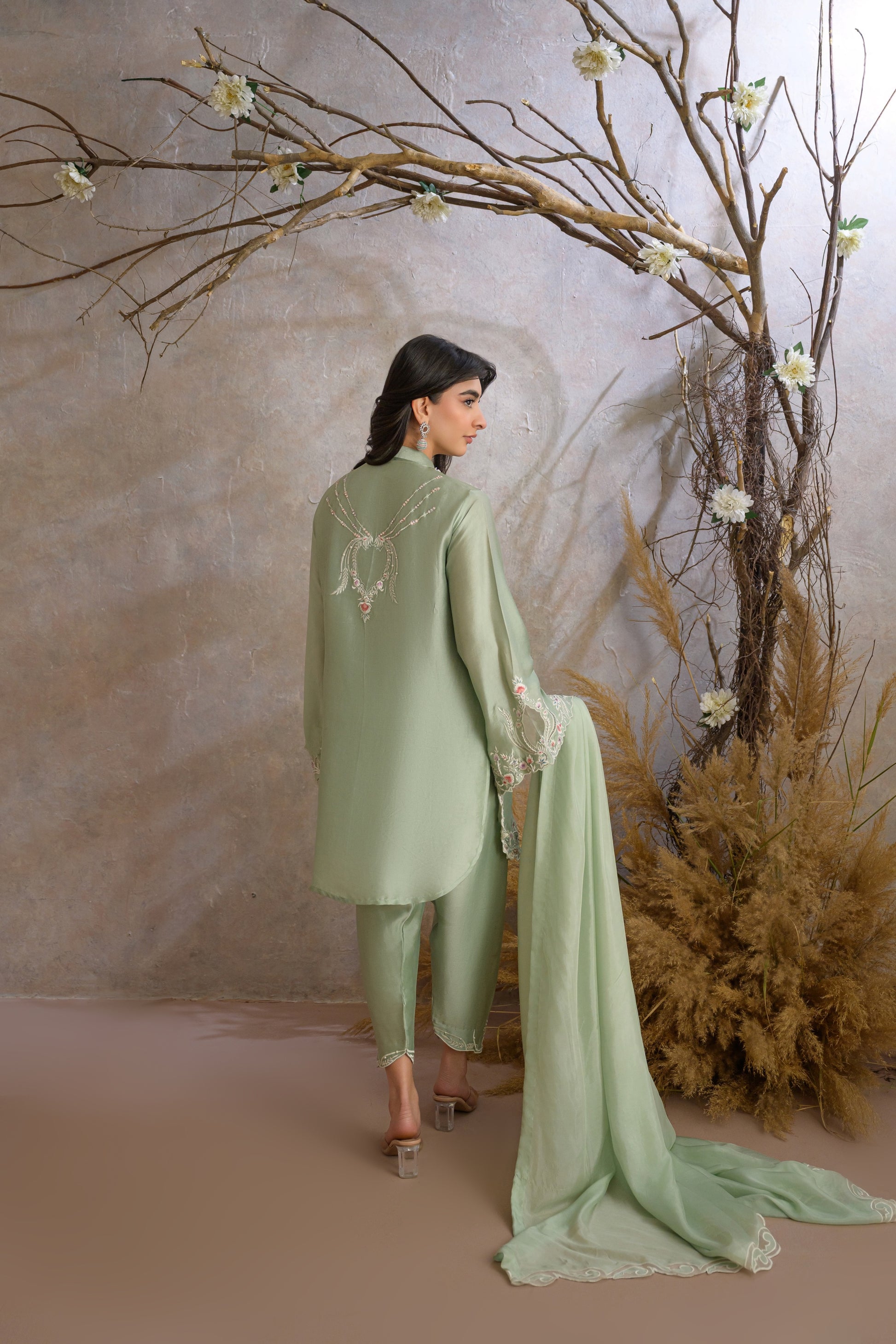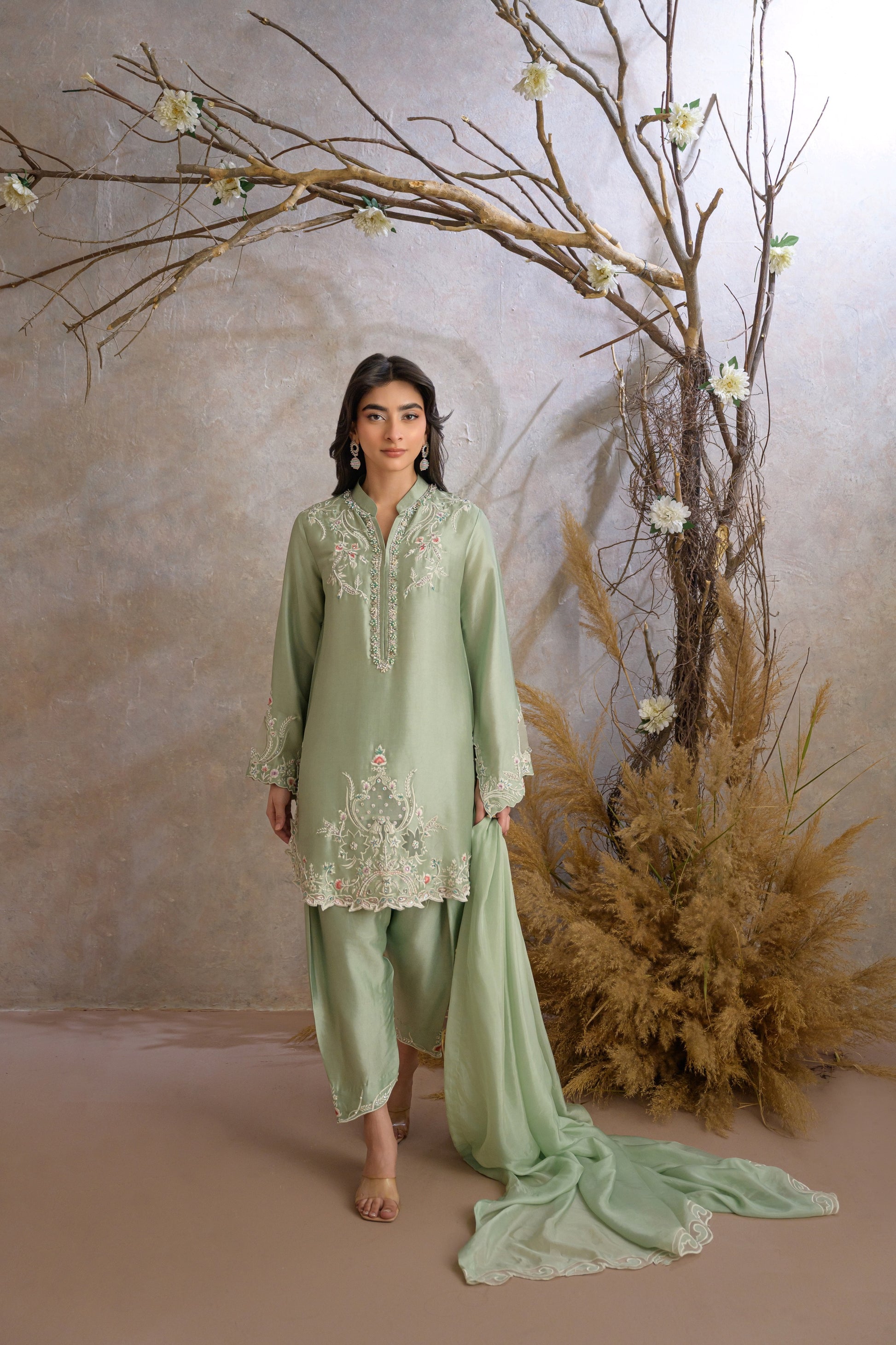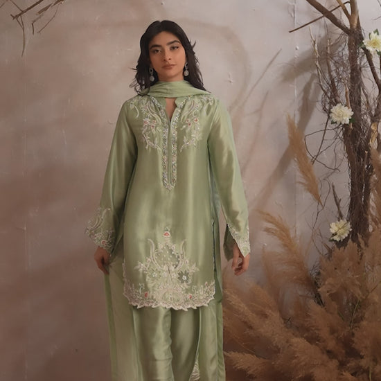 Miri is a timeless expression of understated elegance, crafted in a serene pastel green hue. The outfit features a delicately embroidered kameez adorned with intricate floral and vine motifs, enhanced with subtle hand embellishments along the neckline and borders.