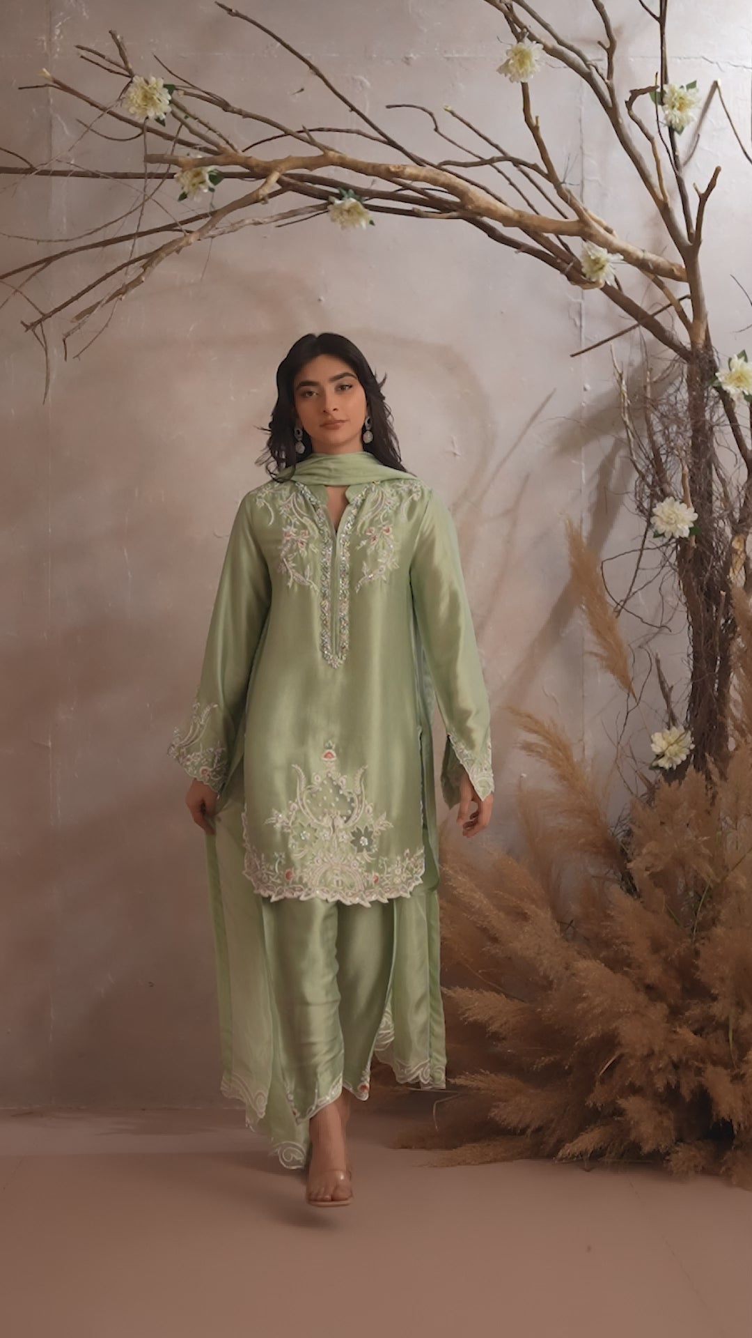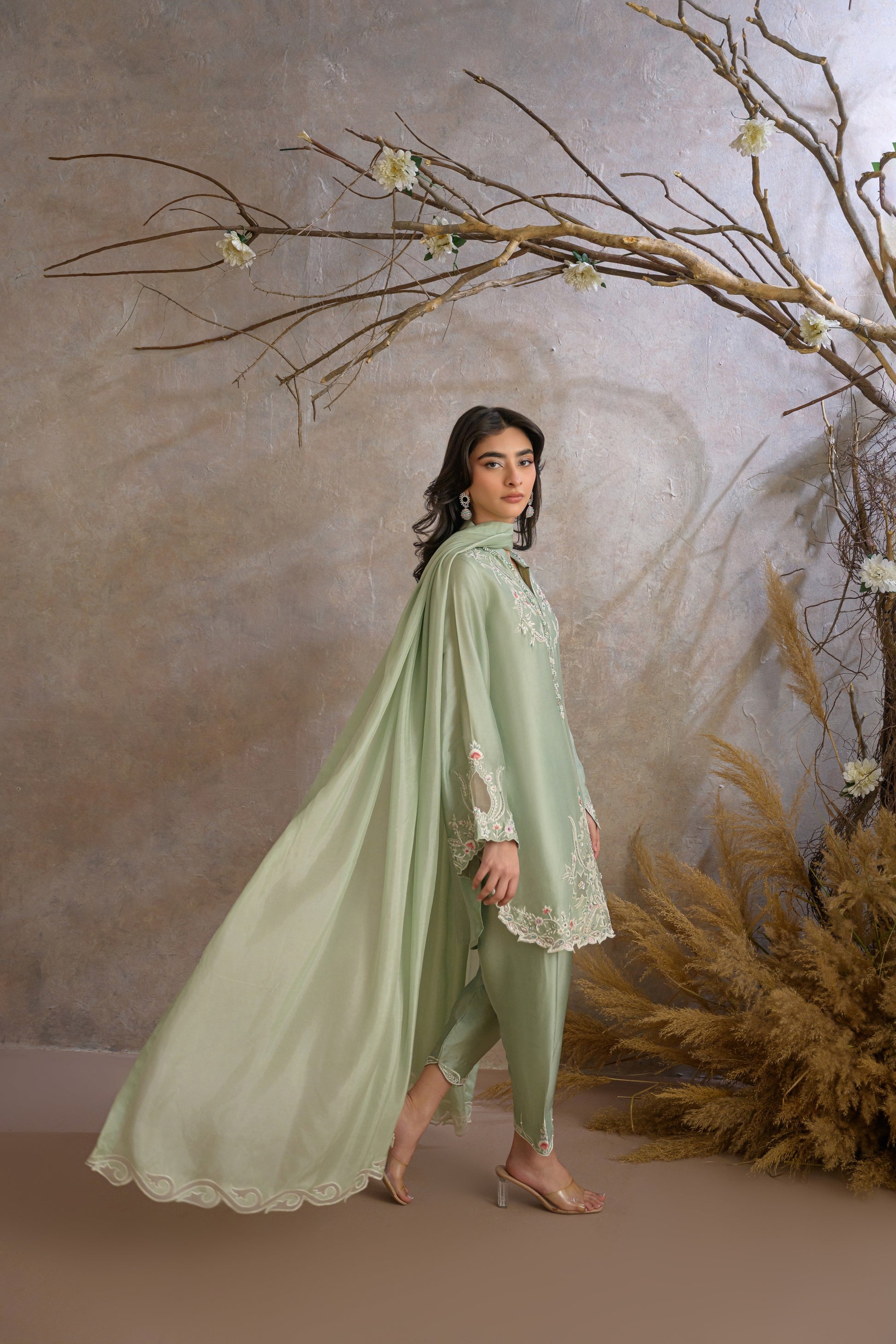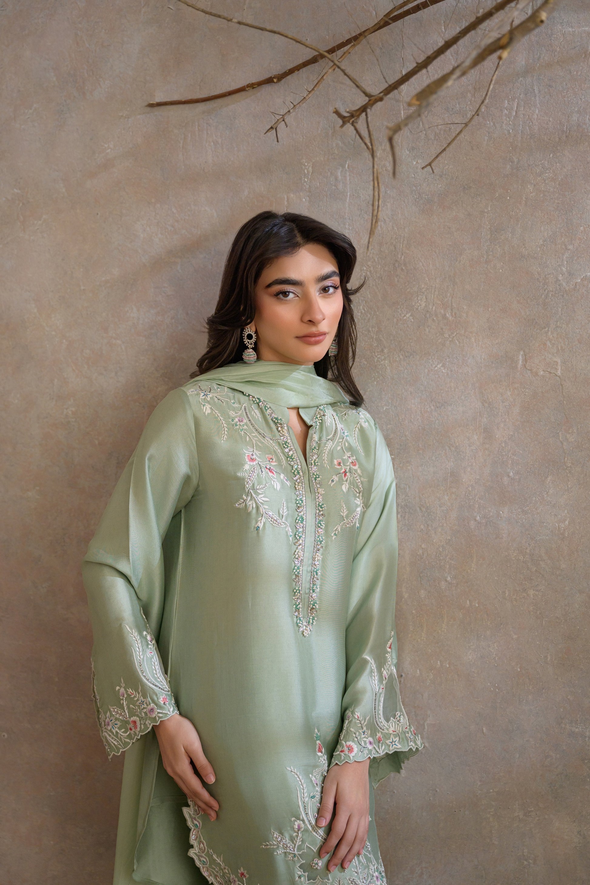 Miri is a timeless expression of understated elegance, crafted in a serene pastel green hue. The outfit features a delicately embroidered kameez adorned with intricate floral and vine motifs, enhanced with subtle hand embellishments along the neckline and borders.