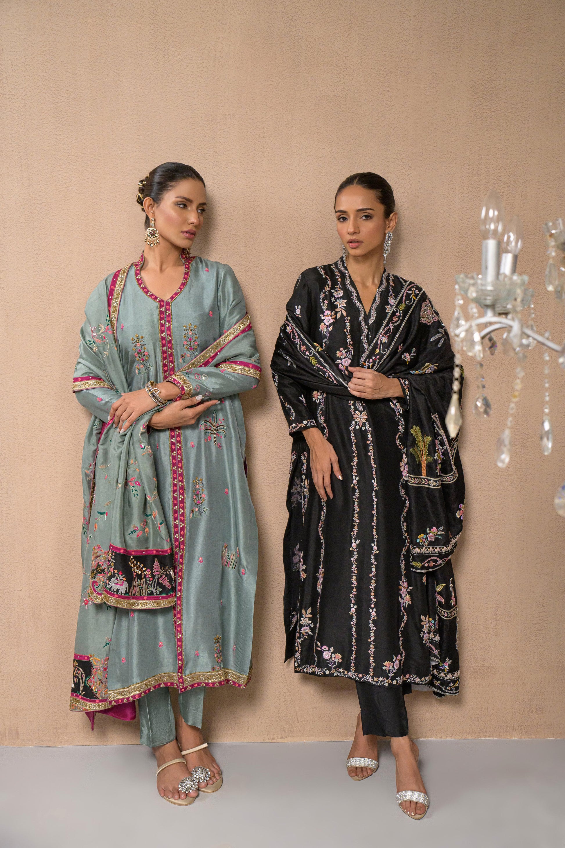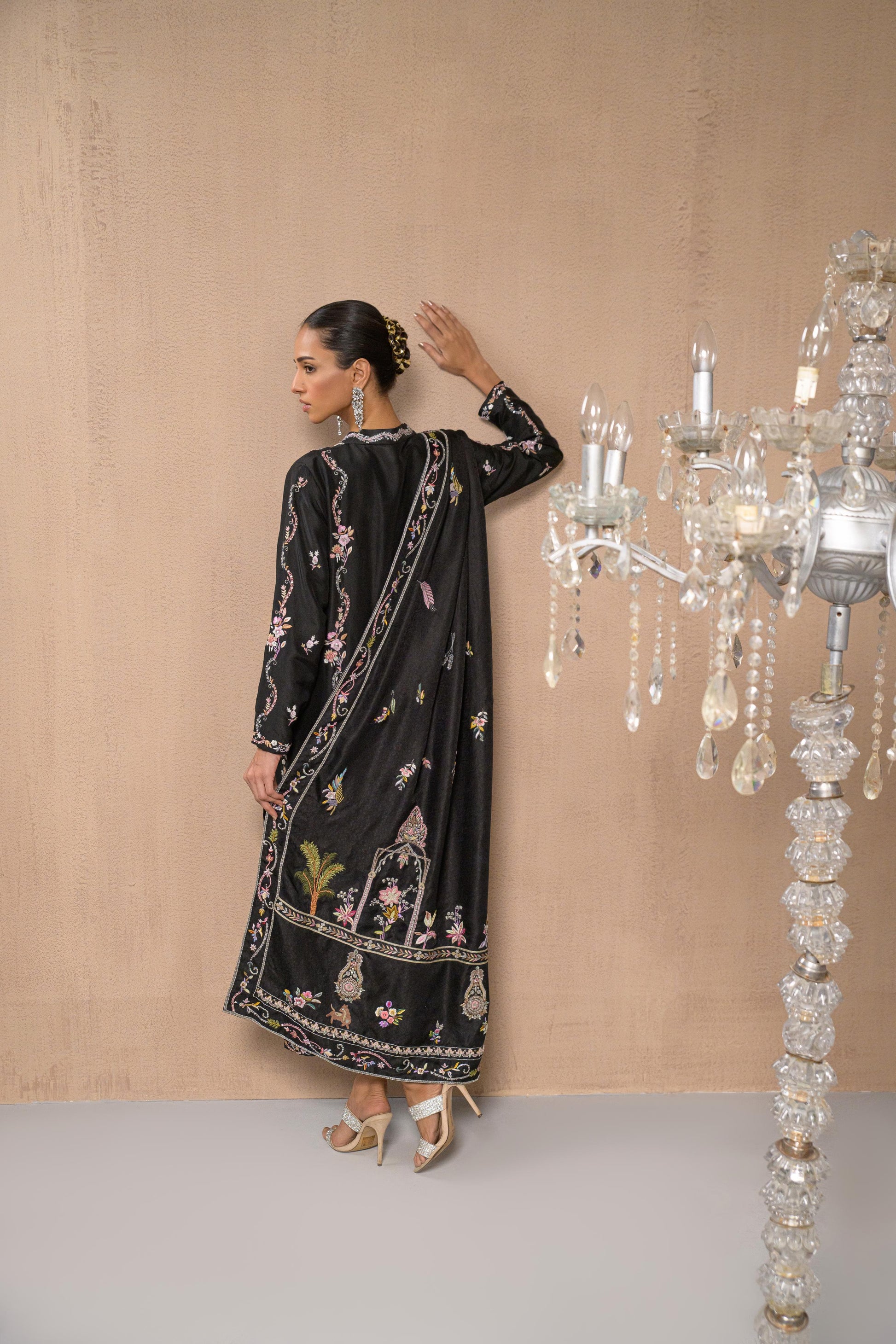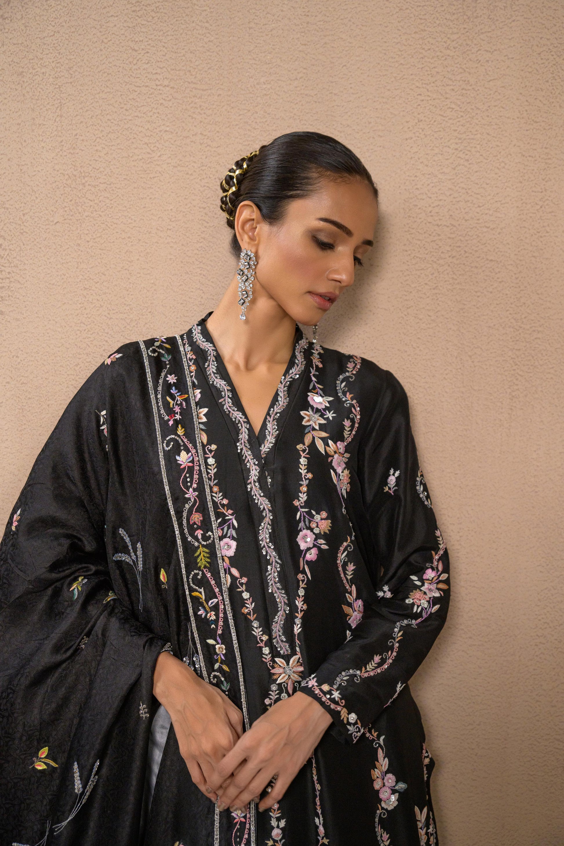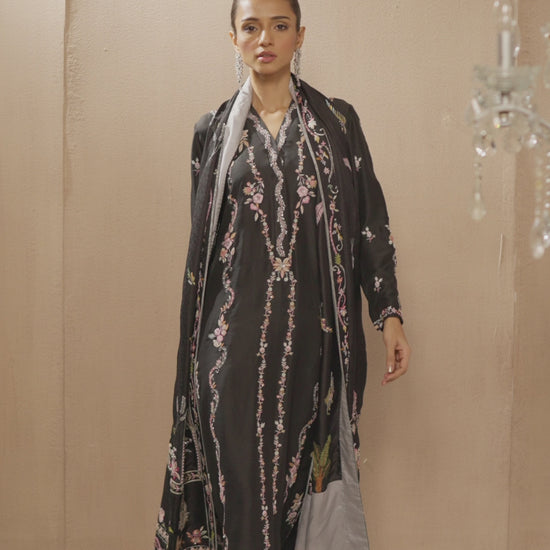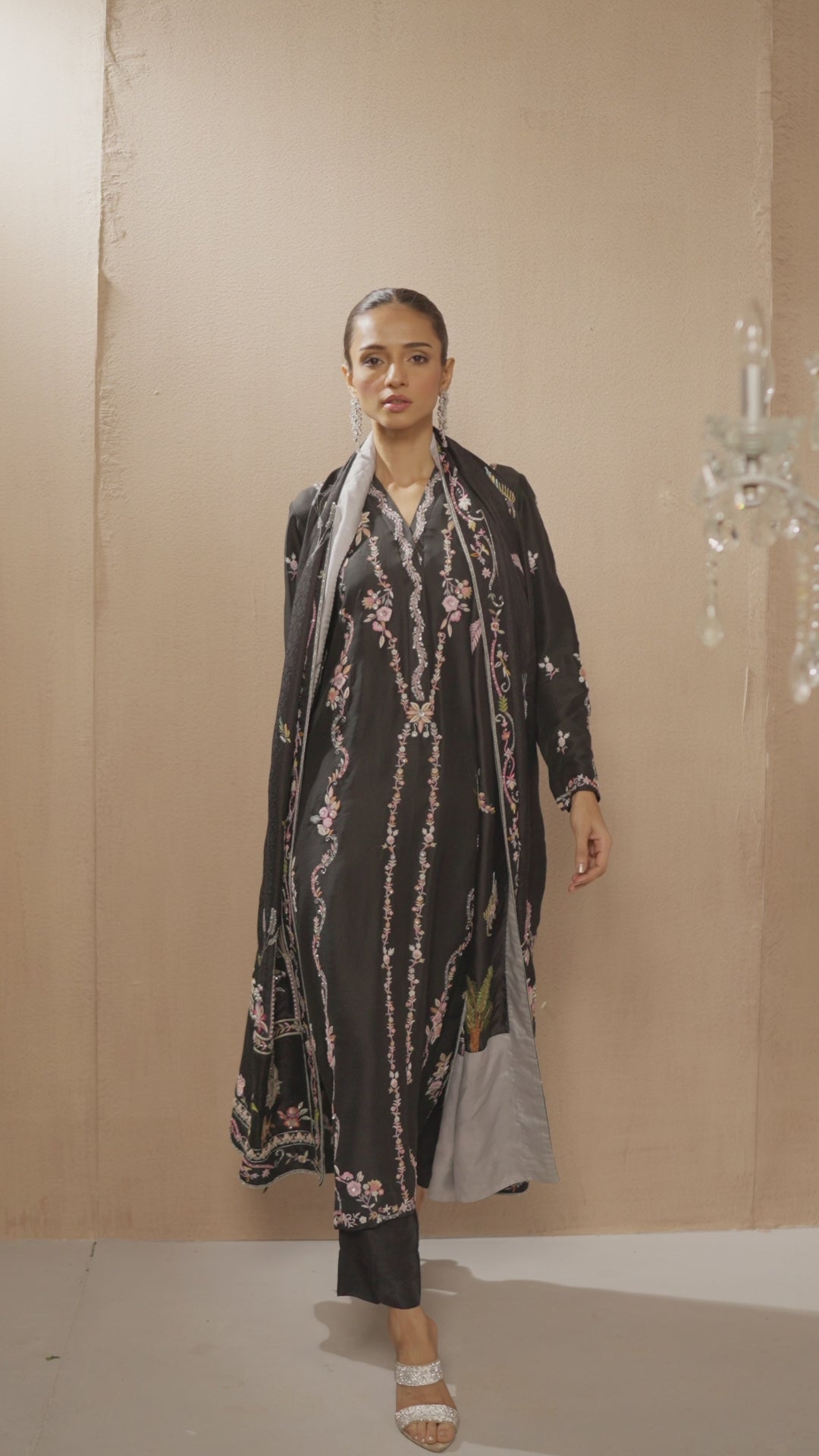 Draped in midnight black, this ensemble whispers tales of timeless grace. Cut from luxurious silk and adorned with pastel florals, delicate birds, and leafy palms, the design pays homage to nature’s quiet grandeur. The kalidar silhouette flows with subtle volume, accented by a wide, sweeping shawl that mirrors the garment’s hand-embroidered storytelling. Paired with tapered trousers for a balanced structure, it’s a look that celebrates quiet confidence and intricate craftsmanship.