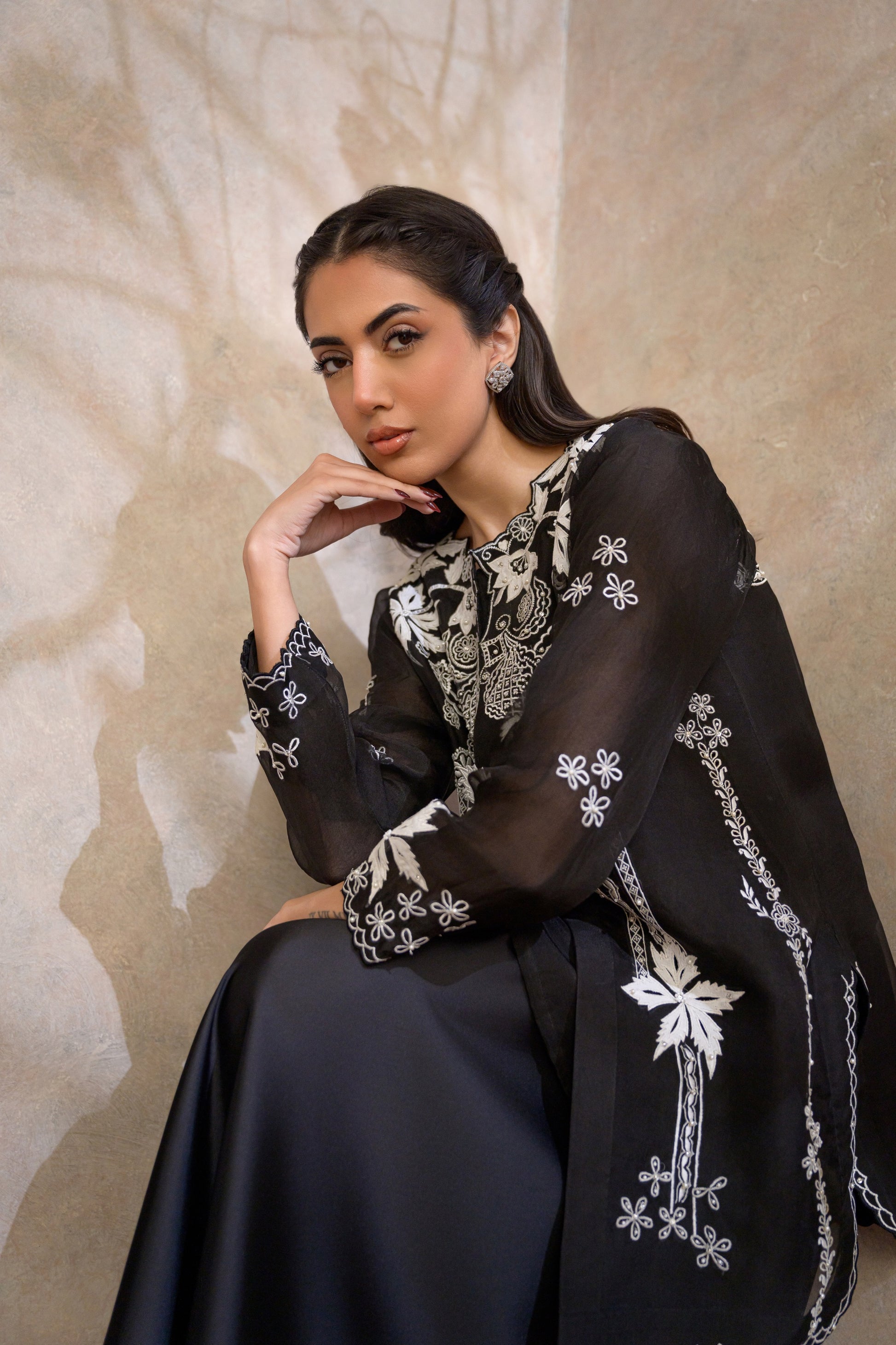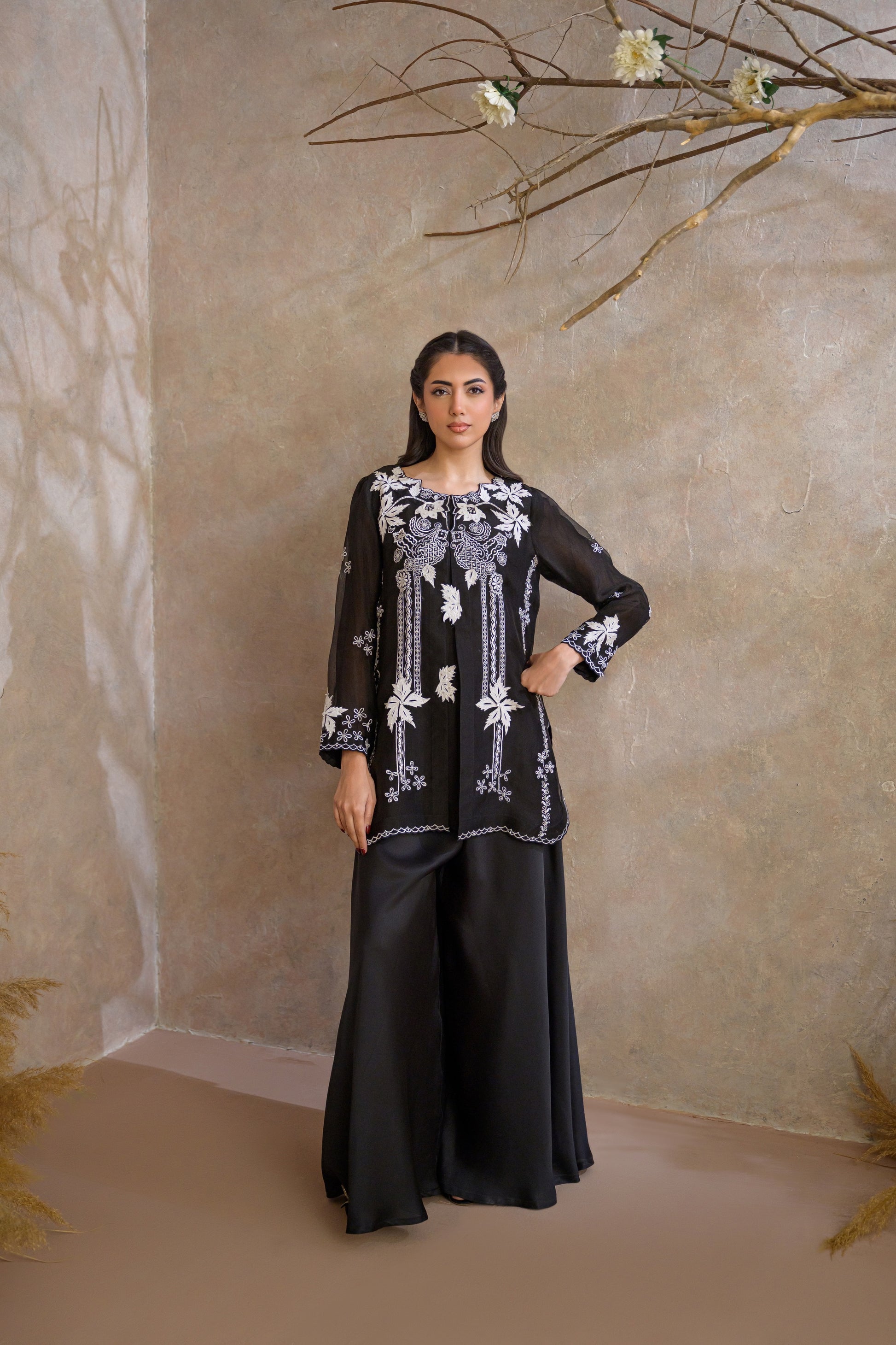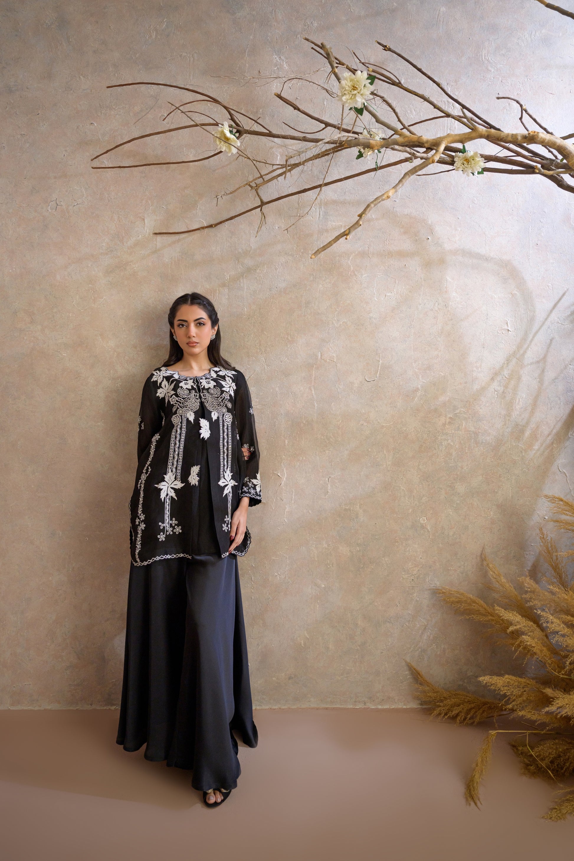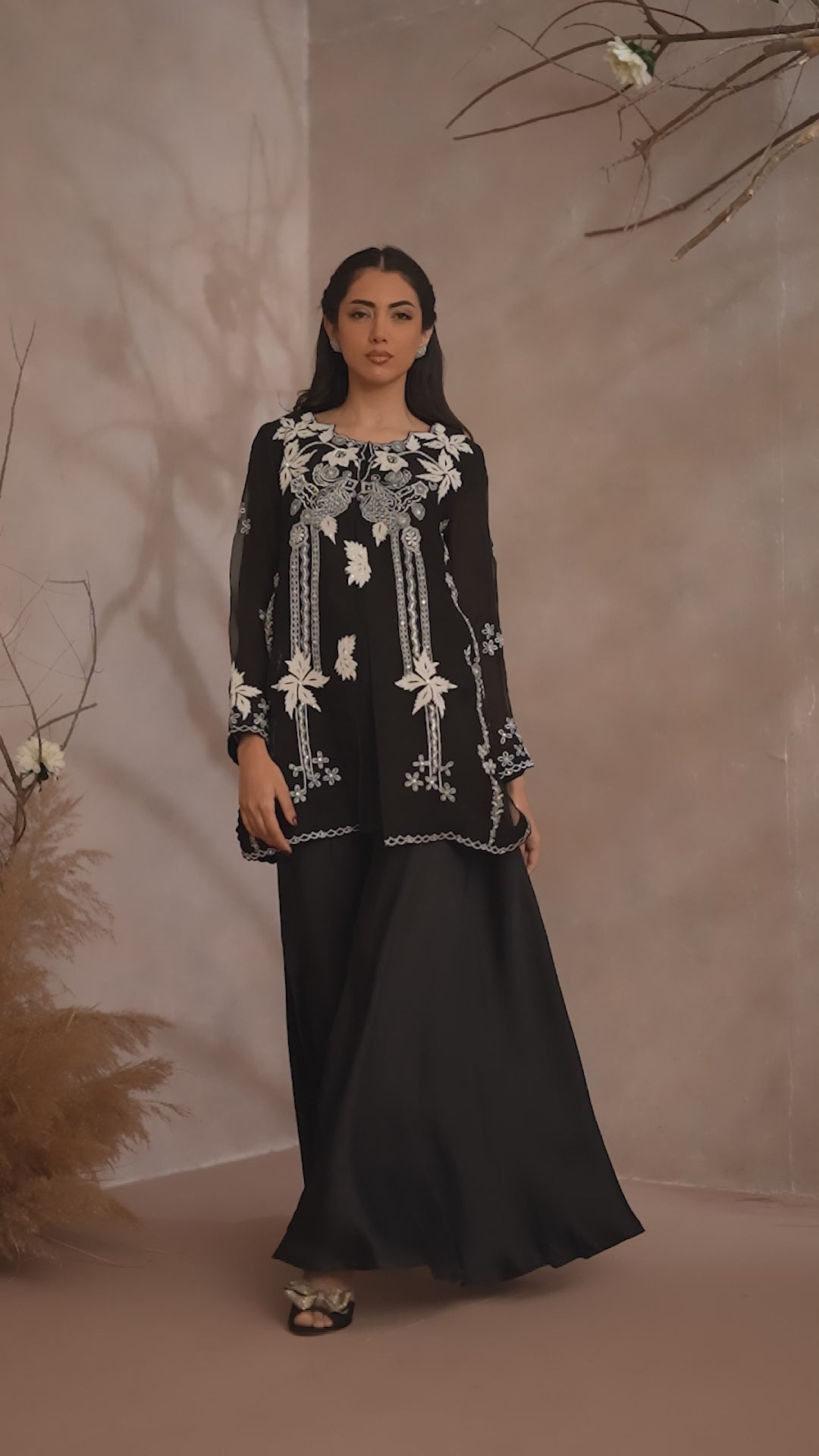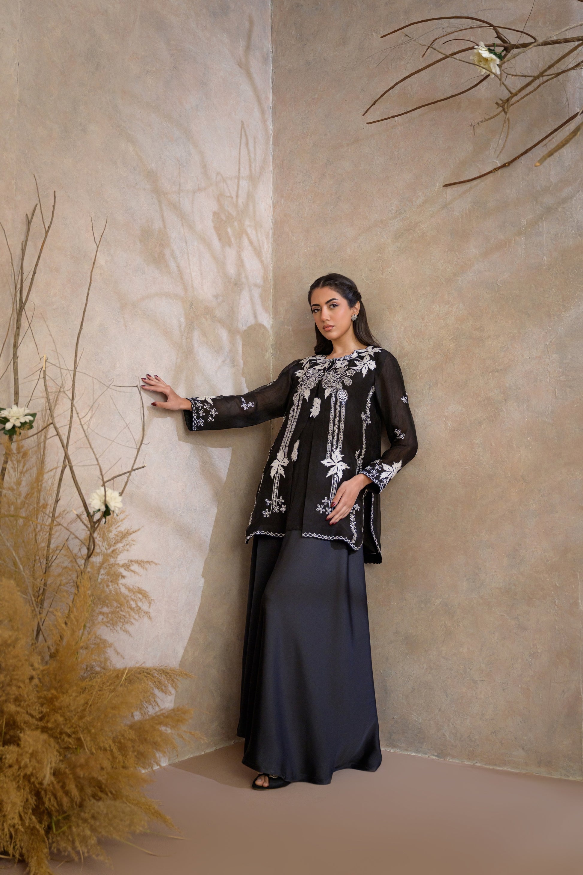 Paired with flowing black pants, the ensemble moves with effortless grace, offering a perfect balance of structure and fluidity. Ideal for formal evenings and high-end occasions, this look embodies understated opulence with a contemporary edge.