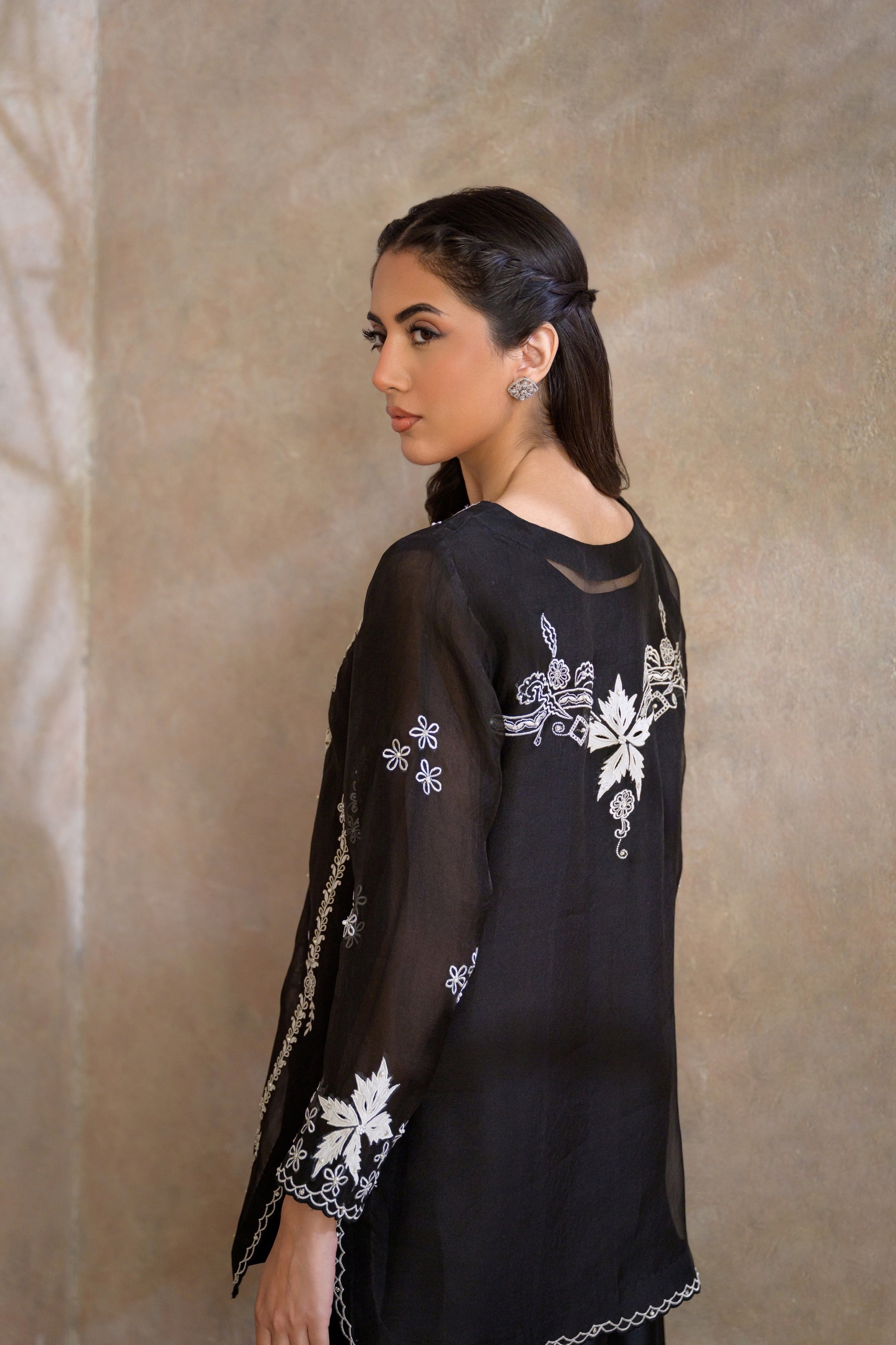 This striking black organza jacket is a masterclass in modern elegance and timeless luxury. Crafted in sheer organza, it creates an effortlessly graceful silhouette, enhanced by its light, fluid structure and sophisticated depth.