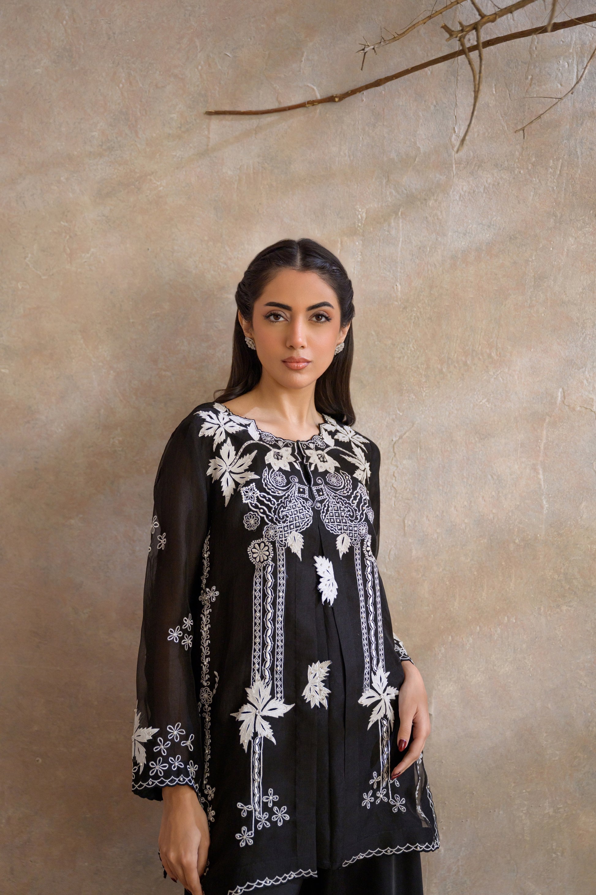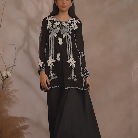 The jacket is adorned with ivory floral appliqués, intricately detailed with delicate and intricate embroidery that adds dimension, texture, and artisanal finesse. The contrast of ivory against black lends a dramatic yet refined appeal, while the meticulous craftsmanship elevates the piece into a true statement of luxury.