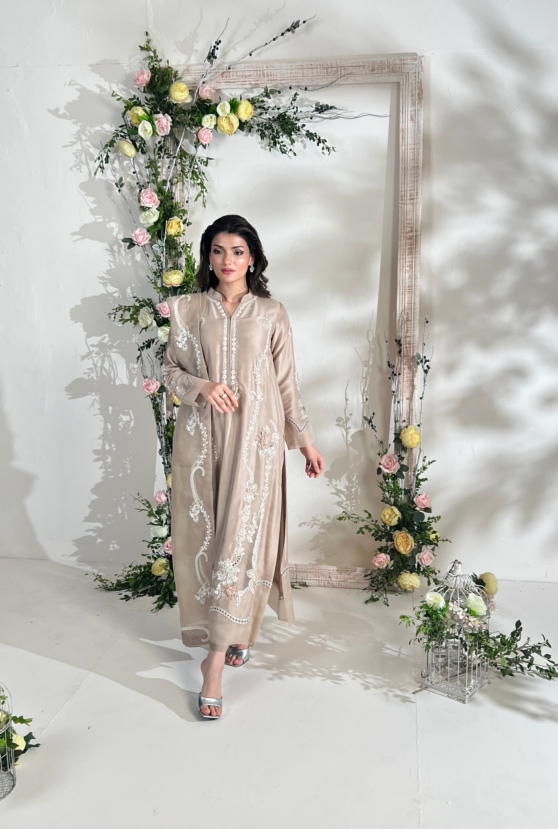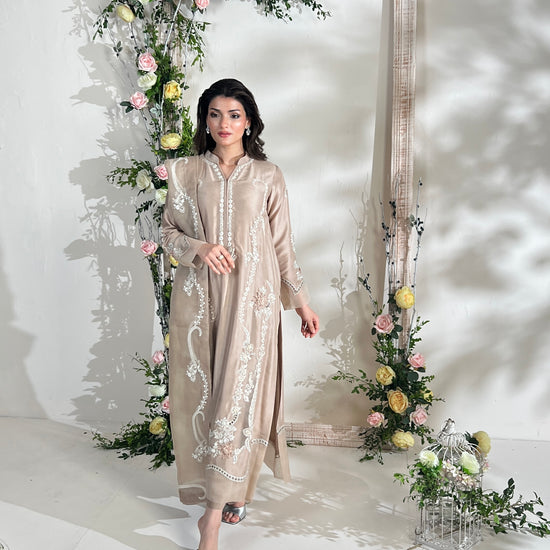 Immerse yourself in timeless elegance with this exquisite ensemble, rendered in delicate hues of beige sand on the finest pure raw silk. A true ode to romance, the outfit is adorned with intricately detailed floral motifs, 3D embroidered blossoms, and refined hand embroidery, all delicately enhanced by ethereal organza appliqués. Paired with a gracefully embroidered pure organza dupatta, adorned with enchanting floral patterns, and a perfectly coordinated izaar, this creation captures a sense of graceful sophistication and poetic charm.