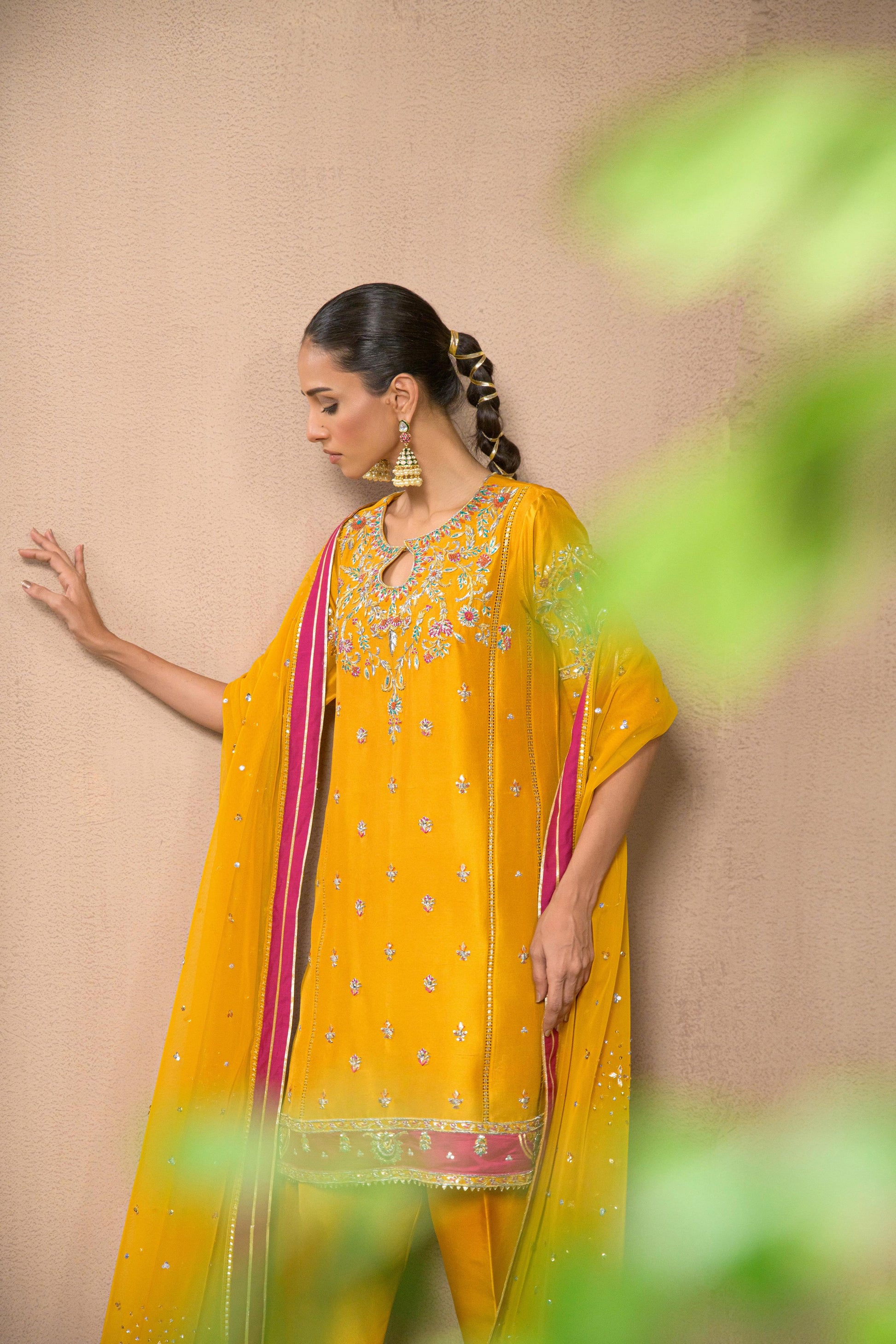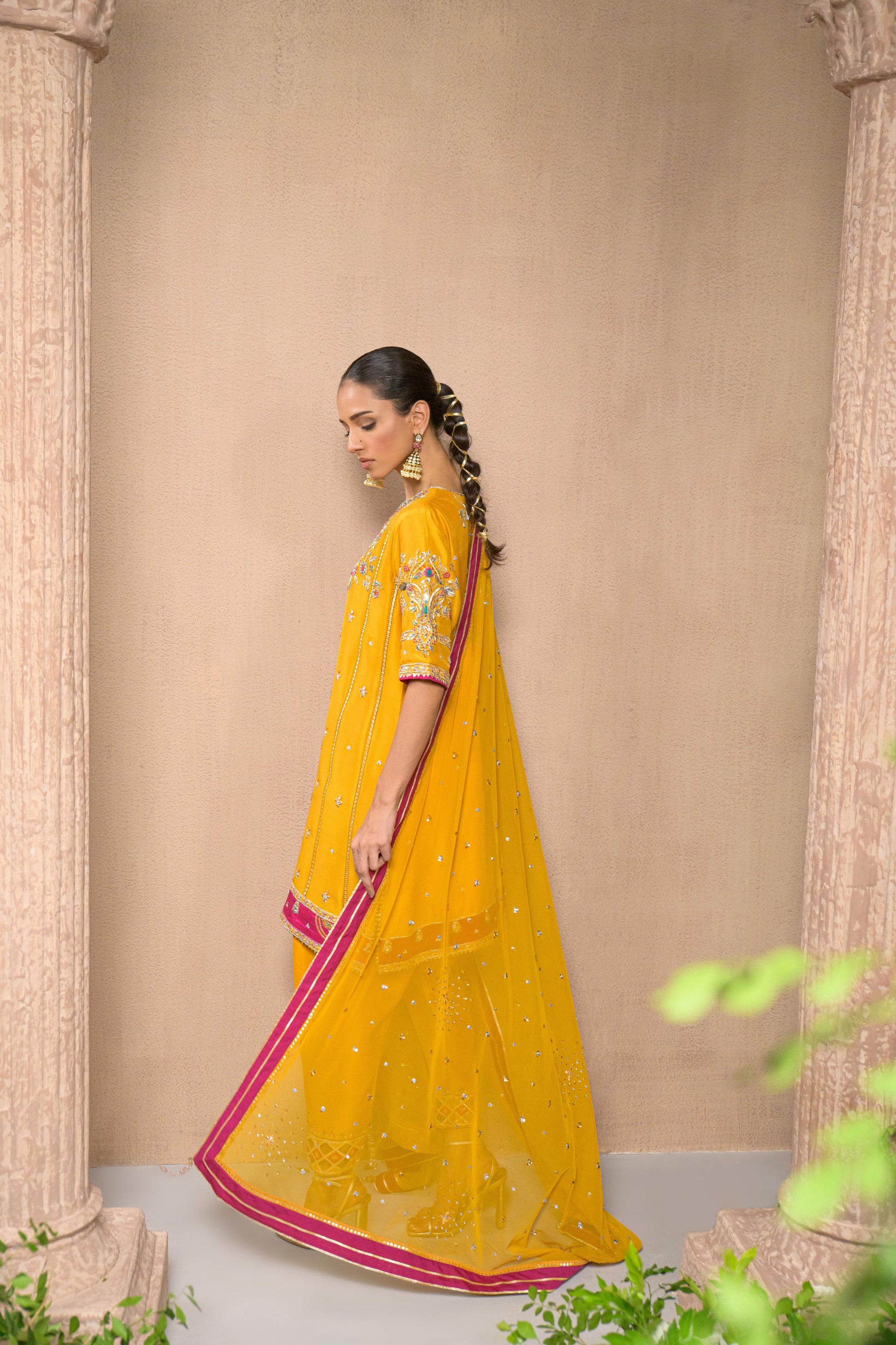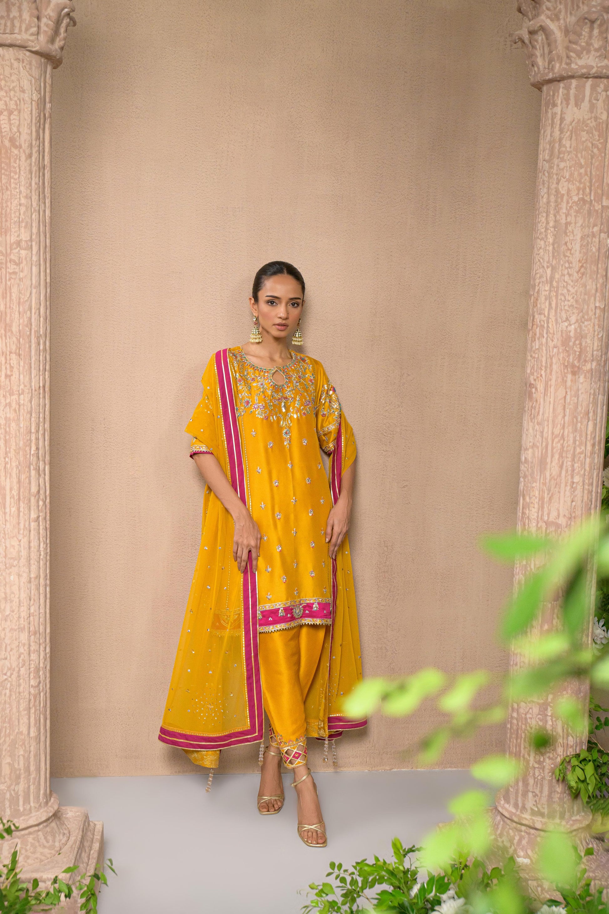 A radiant celebration of colour and craft. This mustard hued short kurta is adorned with vibrant resham embroidery, delicate gota work, and mirror accents, creating a festive interplay of textures. Paired with a tailored shalwar featuring gota detailing at the cuffs, the look is completed with a chunari-inspired dupatta featuring kaamdani and traditional finishing. Perfect for mehndi and mayun festivities, this ensemble is rooted in heritage yet refreshingly vibrant.