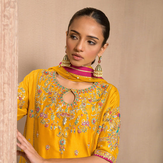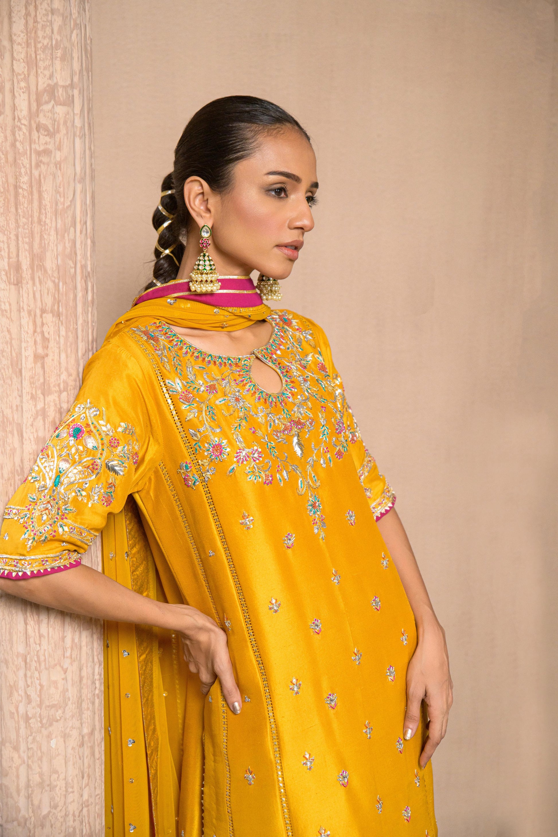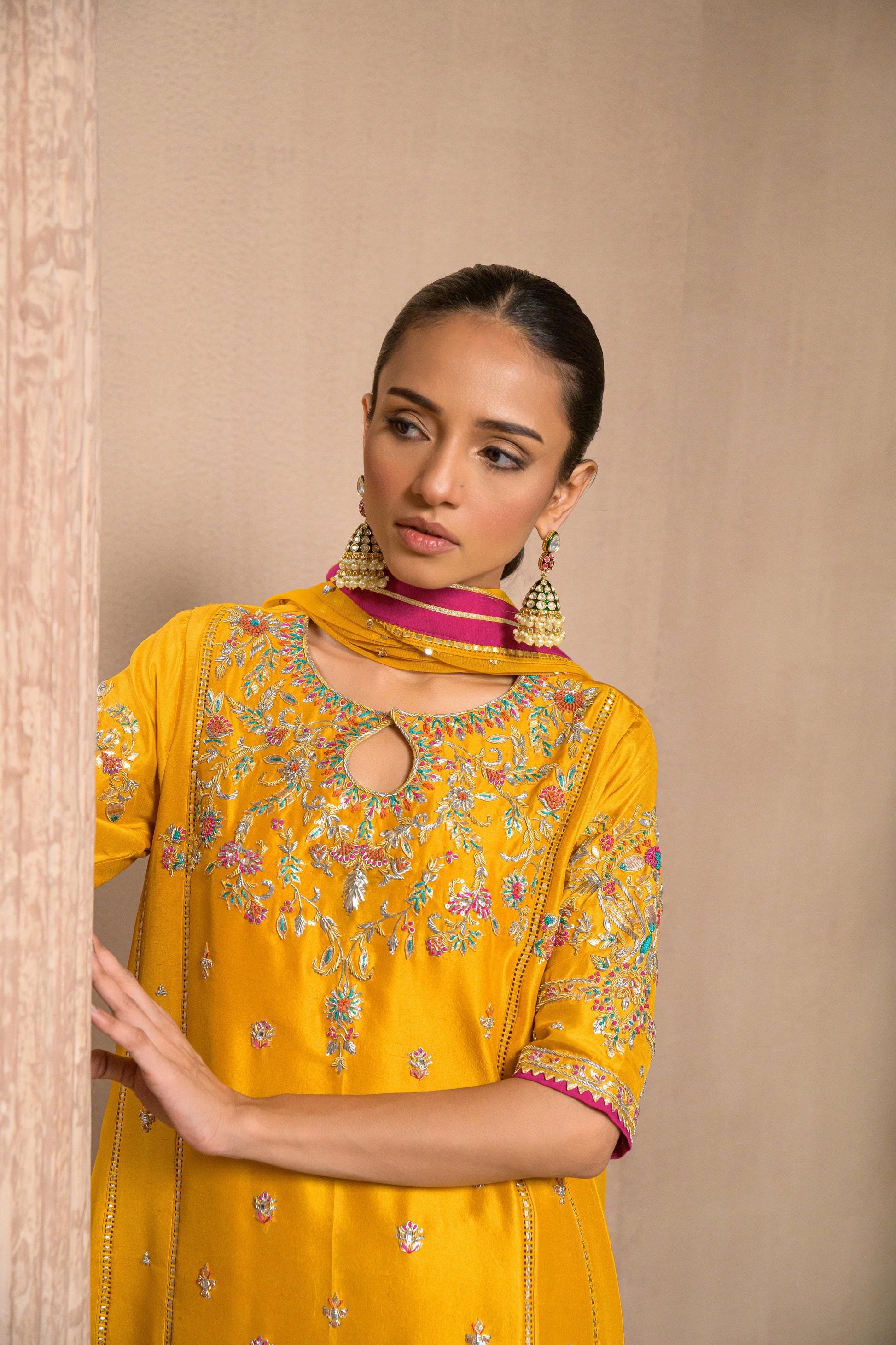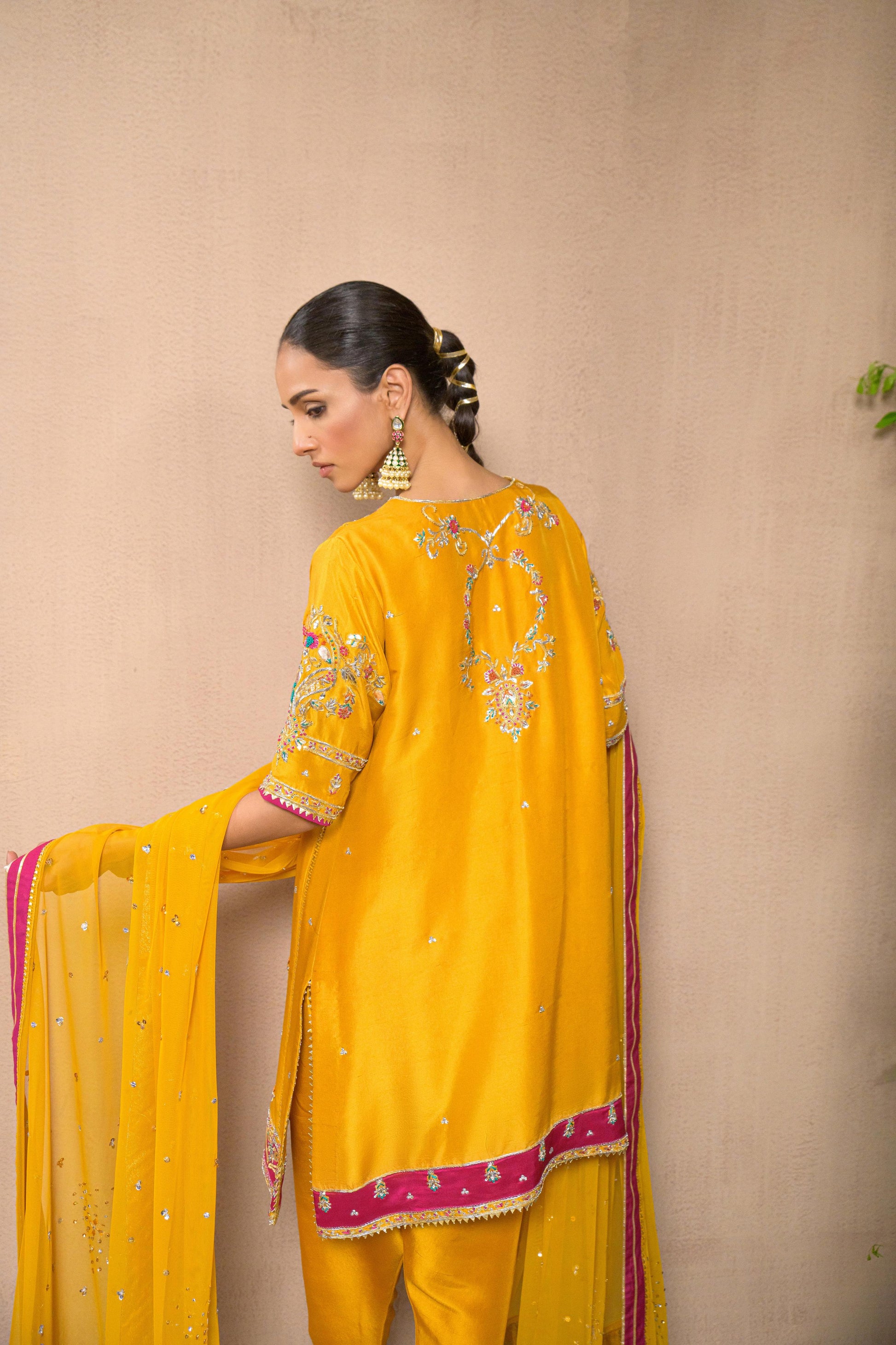 A radiant celebration of colour and craft. This mustard hued short kurta is adorned with vibrant resham embroidery, delicate gota work, and mirror accents, creating a festive interplay of textures. Paired with a tailored shalwar featuring gota detailing at the cuffs, the look is completed with a chunari-inspired dupatta featuring kaamdani and traditional finishing. Perfect for mehndi and mayun festivities, this ensemble is rooted in heritage yet refreshingly vibrant.