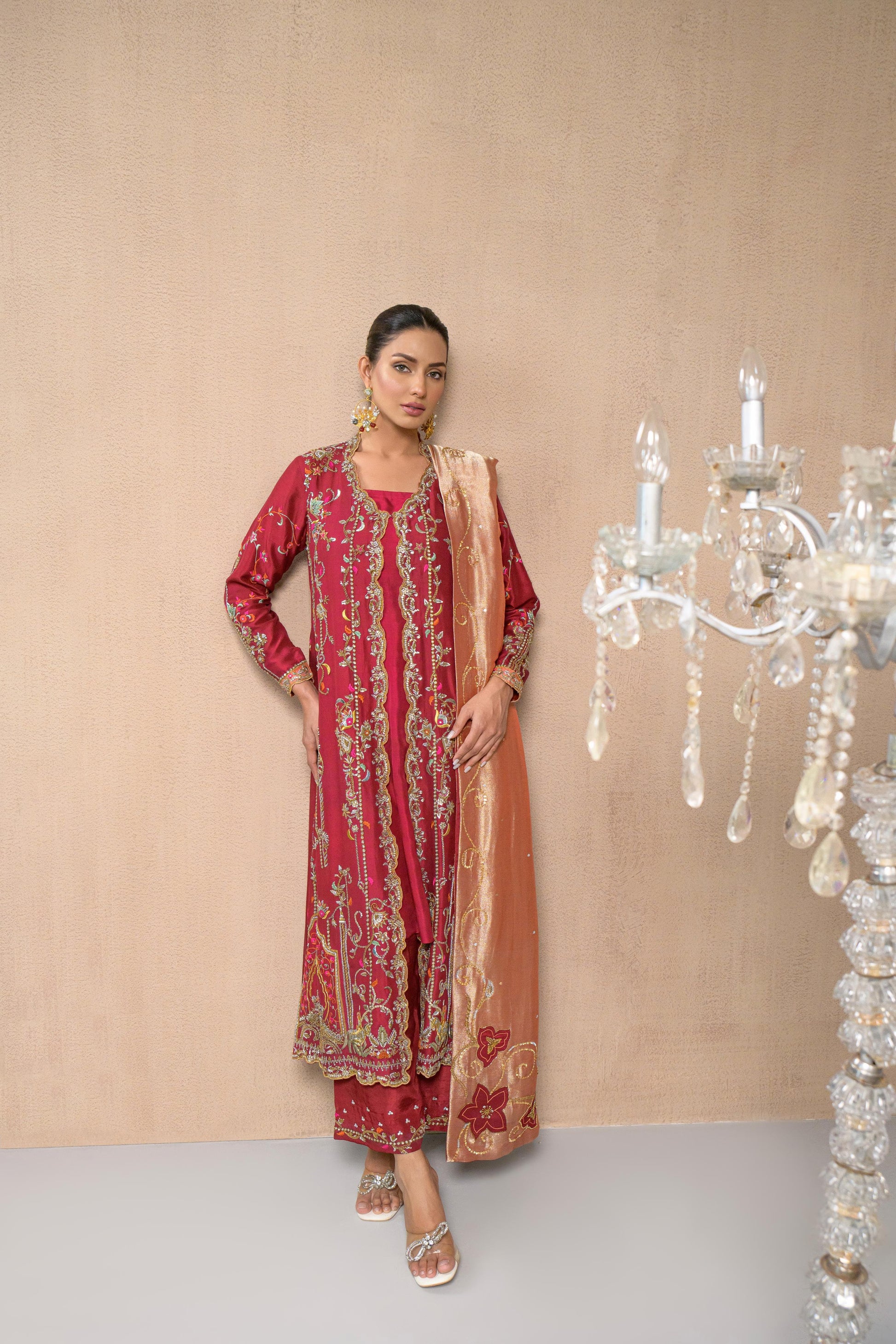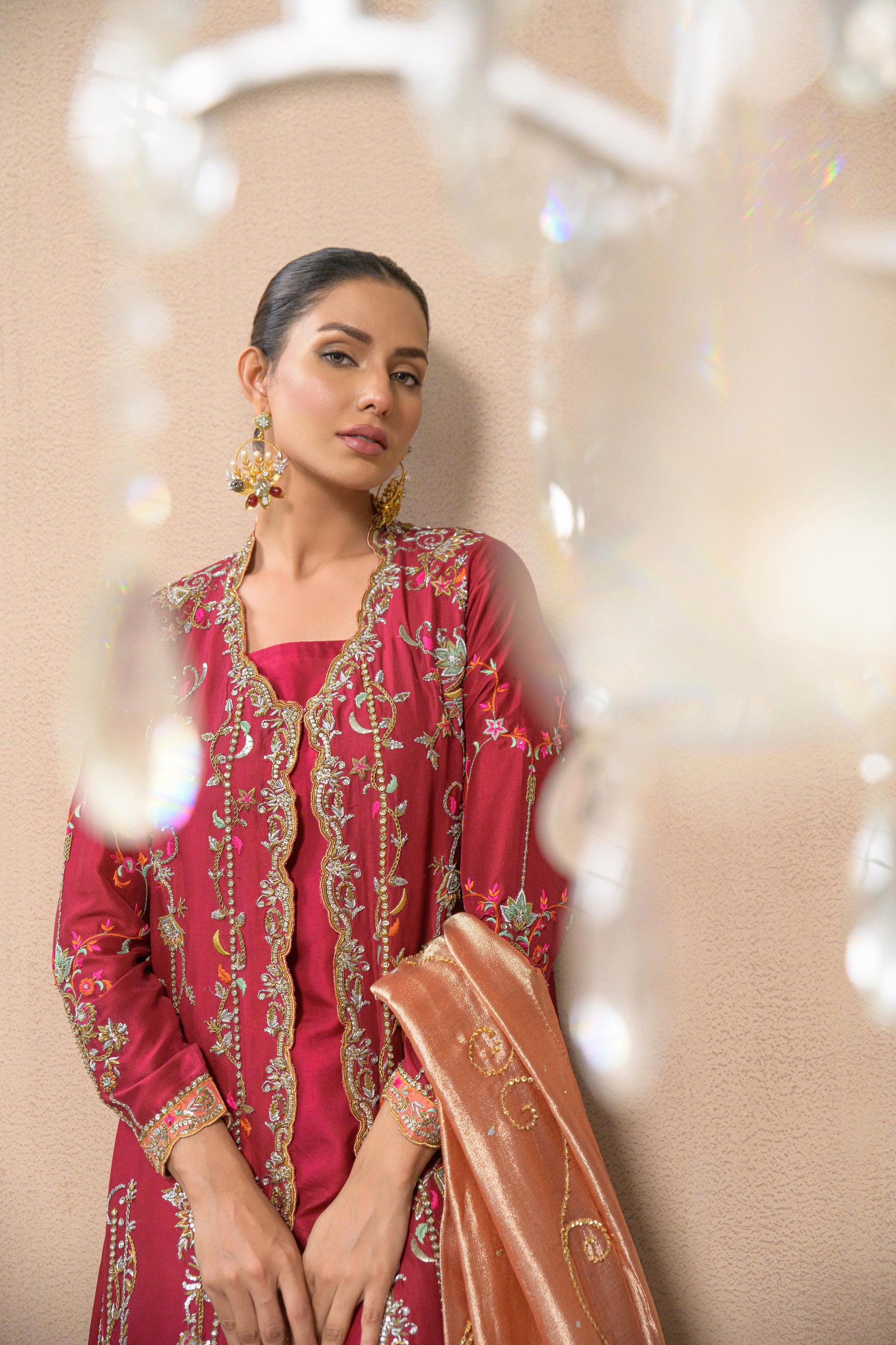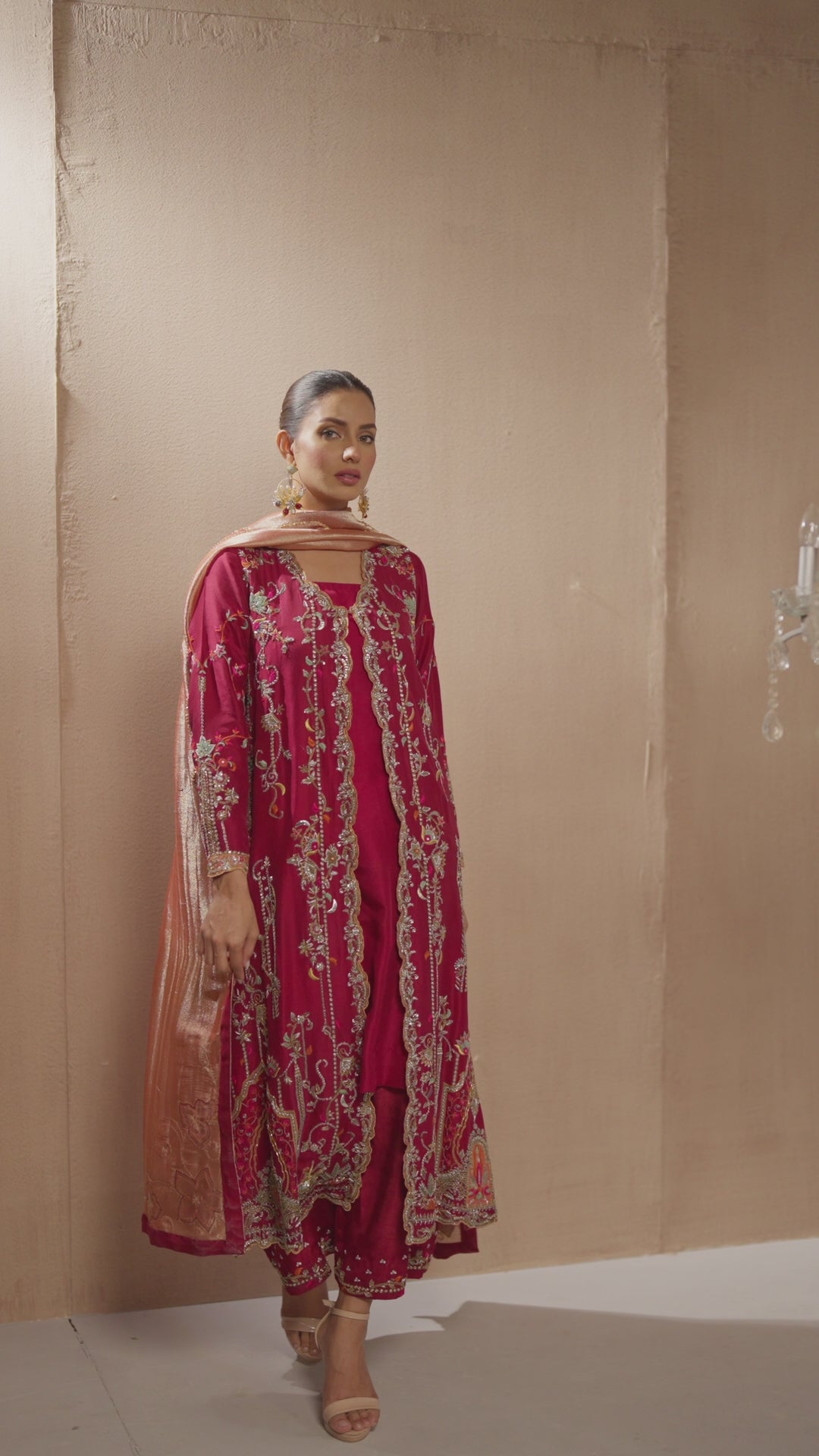 A regal ode to opulence, Soraya is a masterpiece in deep crimson red, adorned with intricate embroidery that glistens like constellations in velvet dusk. The front-open design flows gracefully over a rich underlayer, while the embellishments dance with threads of gold, sage, and blush — echoing floral vines from miniature paintings. The neckline, adorned with fine tilla work, frames the face with quiet grandeur, while the sleeves whisper romance with every glinting motif.