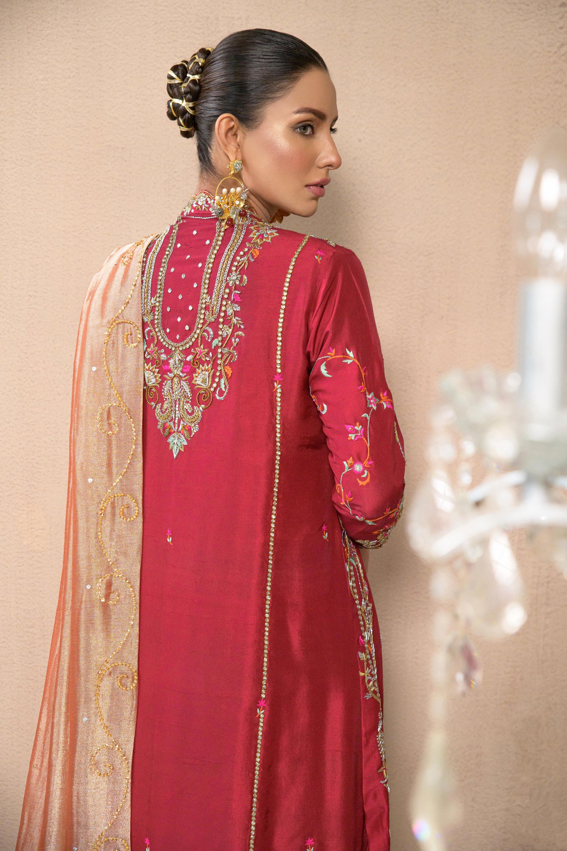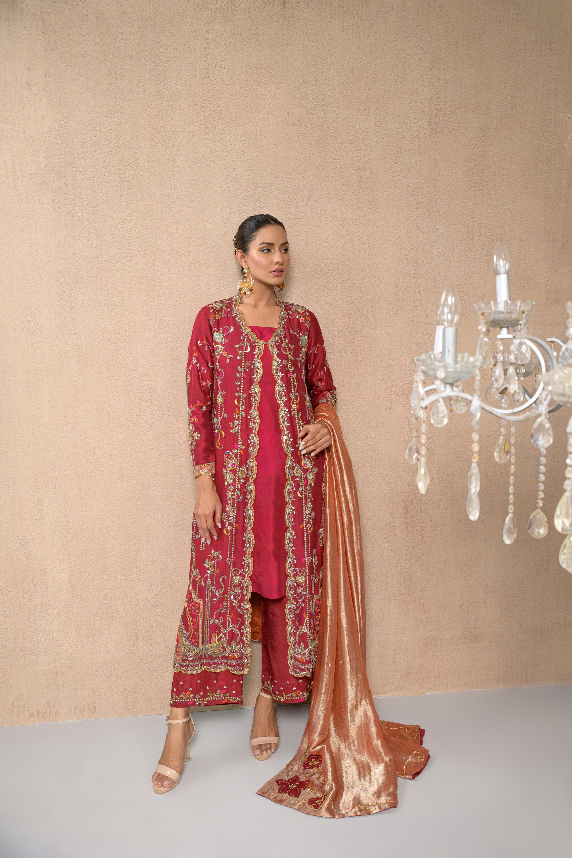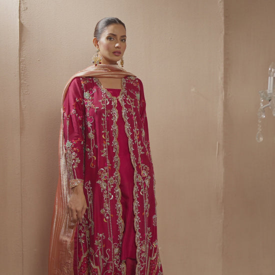 A regal ode to opulence, Soraya is a masterpiece in deep crimson red, adorned with intricate embroidery that glistens like constellations in velvet dusk. The front-open design flows gracefully over a rich underlayer, while the embellishments dance with threads of gold, sage, and blush — echoing floral vines from miniature paintings. The neckline, adorned with fine tilla work, frames the face with quiet grandeur, while the sleeves whisper romance with every glinting motif.