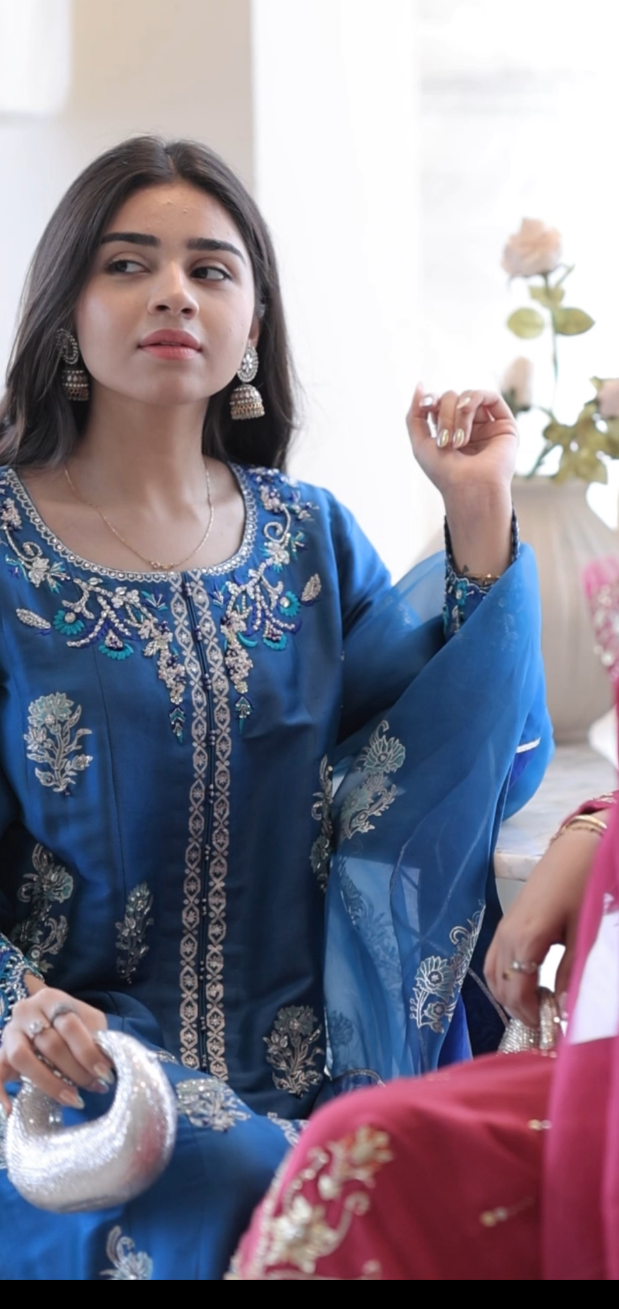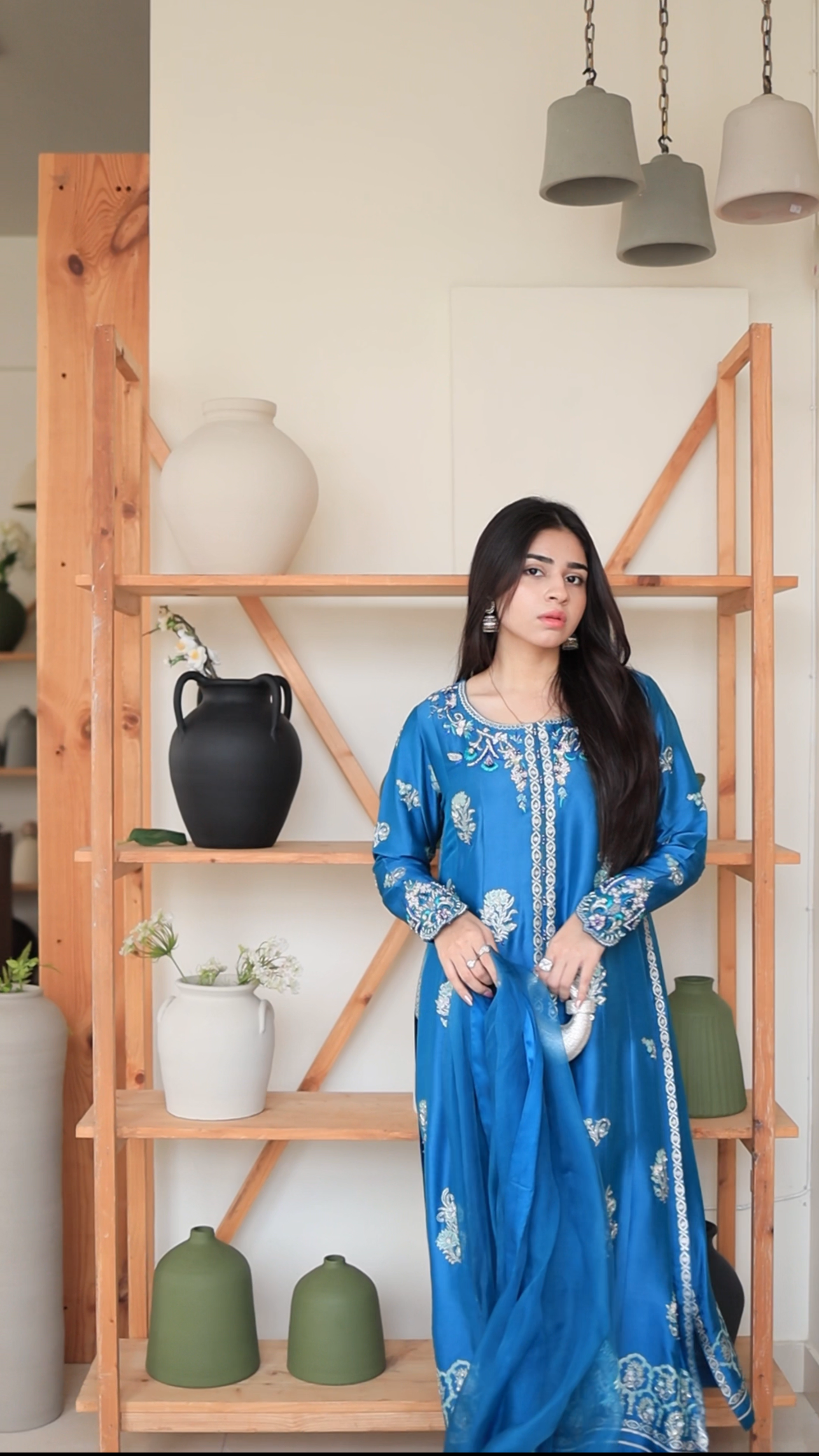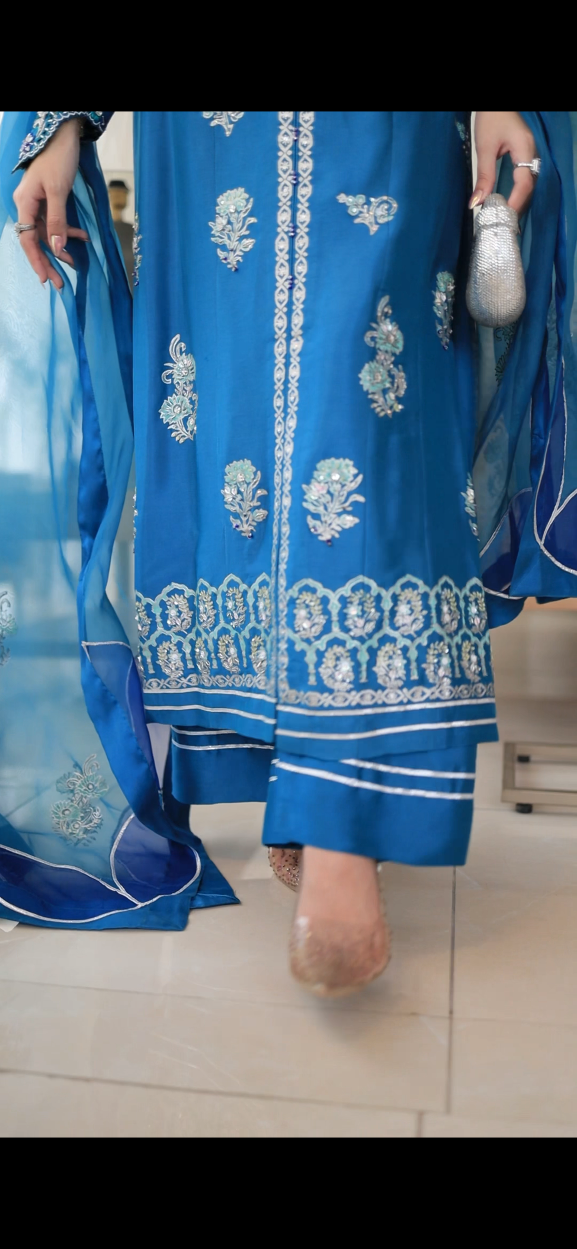 An ode to understated luxury — this steel blue ensemble in maysuri silk exudes timeless elegance. The silhouette is adorned with silver block prints and exquisite hand embroidery along the neckline, elevated by delicate cutwork on the sleeves. A sheer organza dupatta, beautifully accented with appliqués and gota detailing, lends a whisper of ethereal charm. Paired with an izaar featuring a finely finished gota hemline, this look captures a perfect balance of tradition and modern sophistication.